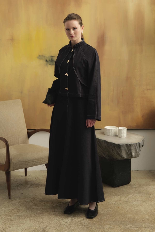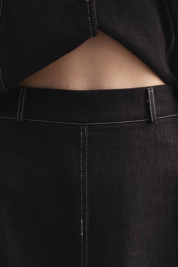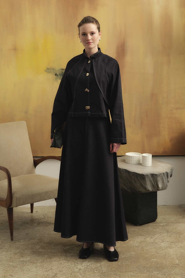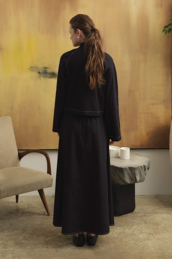 Collar-dominated, button-detailed, bell-shaped skirt, elastic back with zipper detail, belted bridge, full-cut denim skirt set with gold button details.