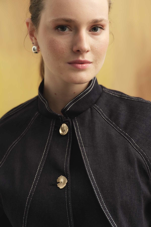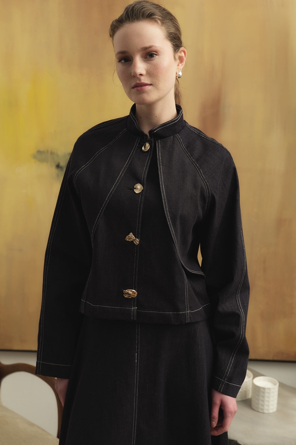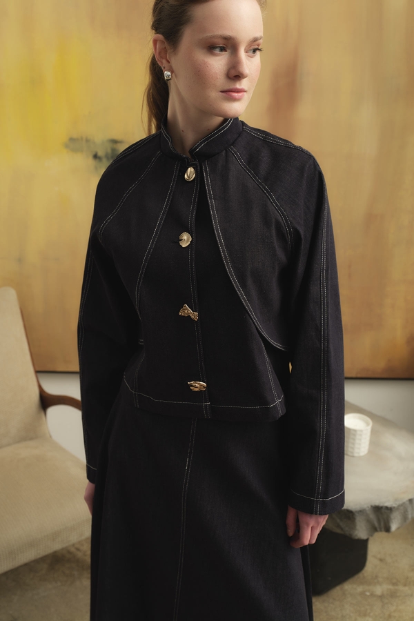FEATURES OF THE NAVY DENIM SKIRT SET WITH GOLD BUTTON DETAILS
