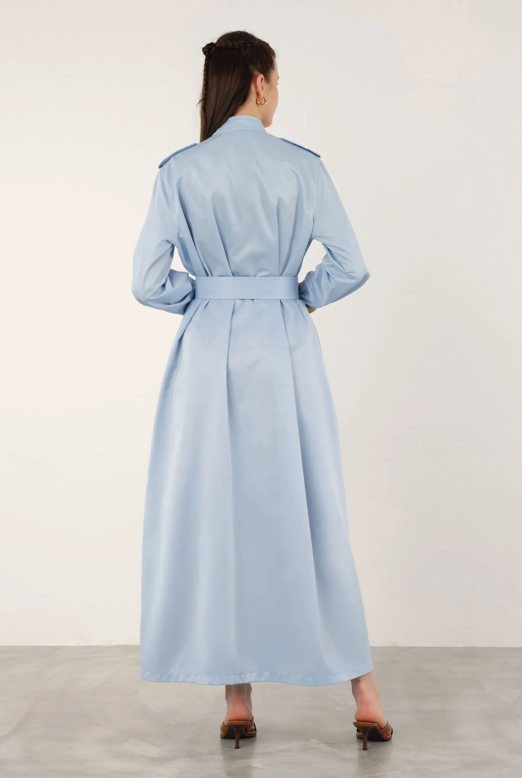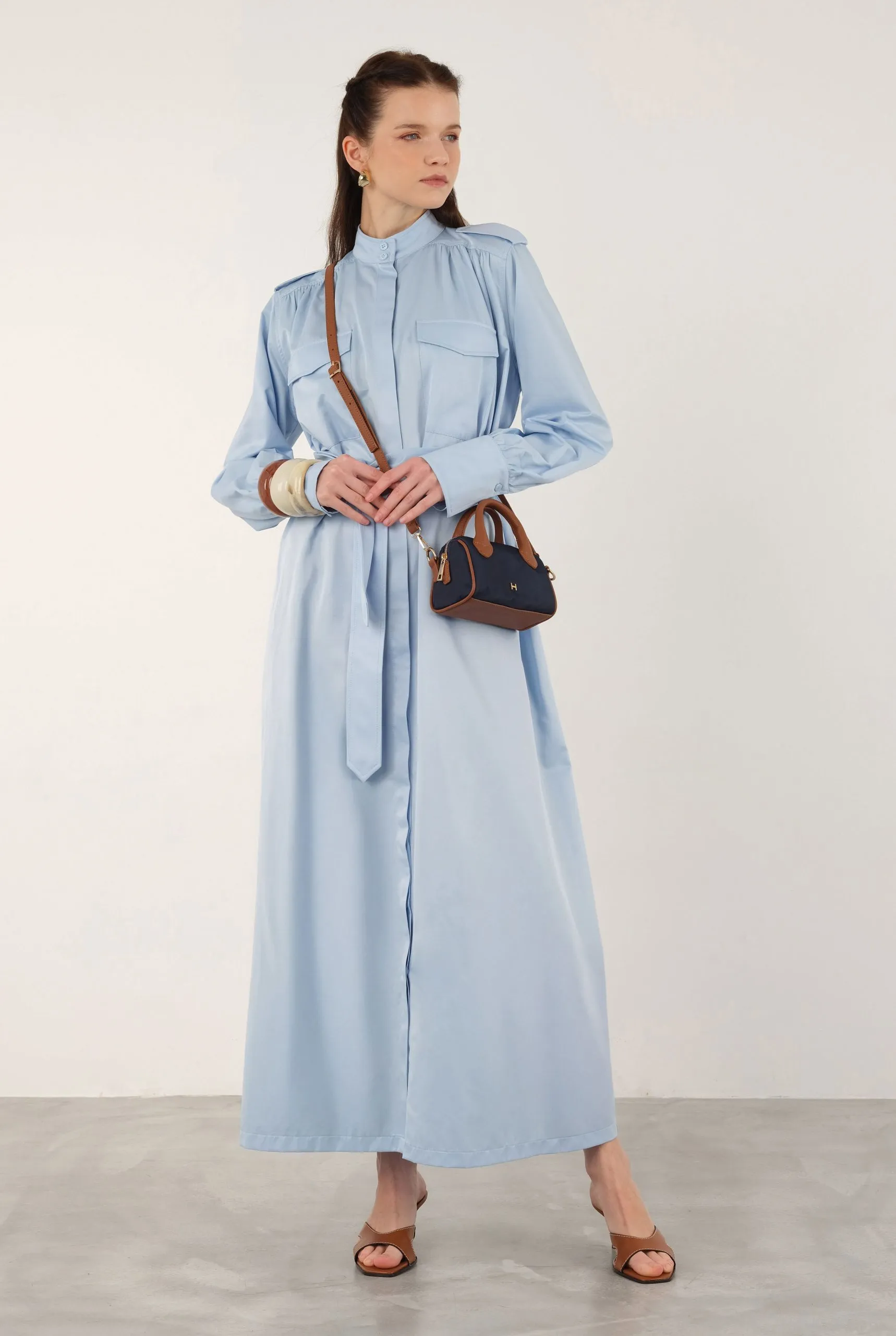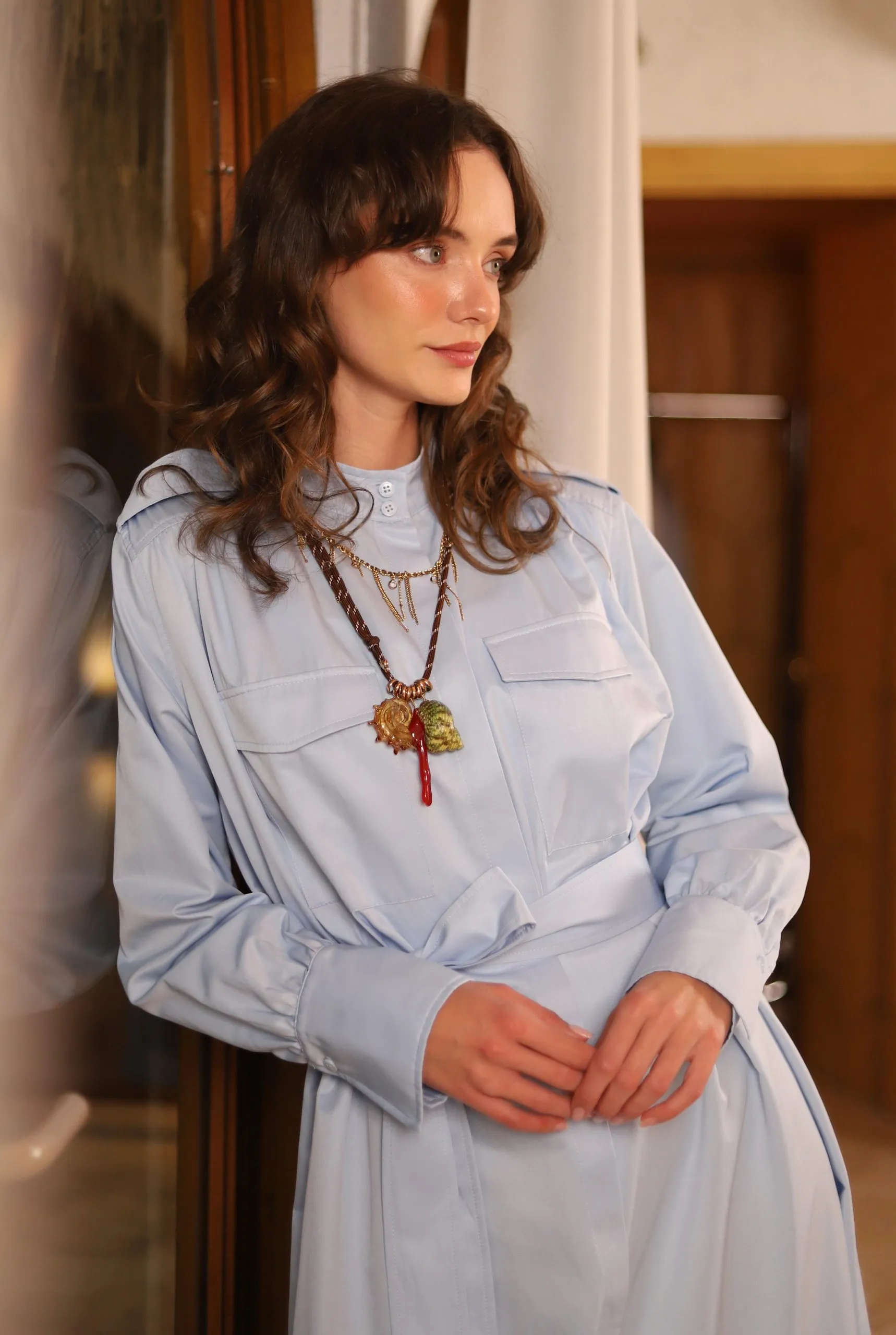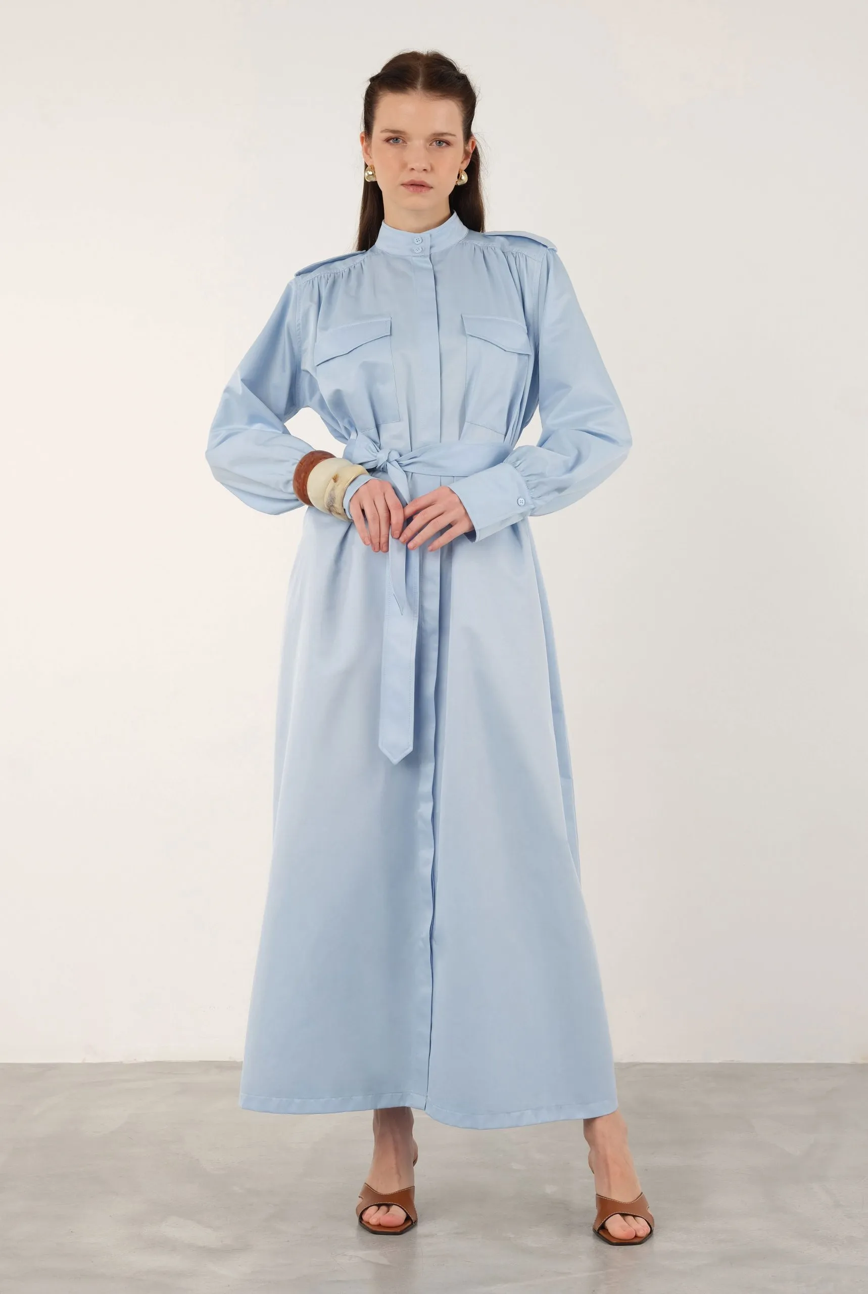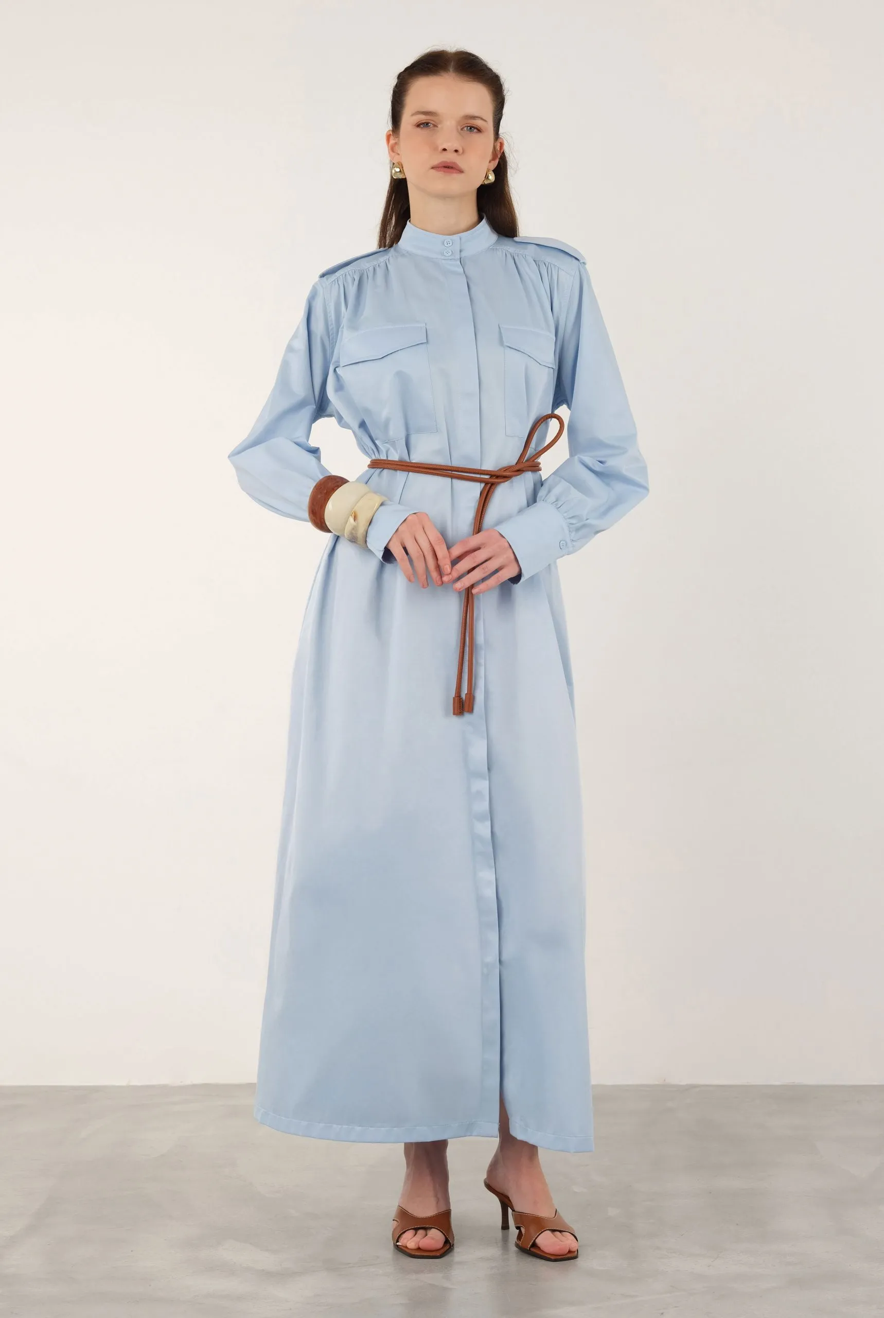 Made from 100% cotton, this epaulette dress features a hidden front zipper, pockets, and is unlined. It has a loose fit. If you prefer a less oversized look than shown on the model, you may consider sizing down. The fabric is not see-through, but we recommend using an external skirt liner to prevent silhouette visibility in sunlight. BELT NOT INCLUDED. For accurate color representation, please refer to the studio photos. Length: 137 cm (Product length may vary by 1-5 cm between productions).