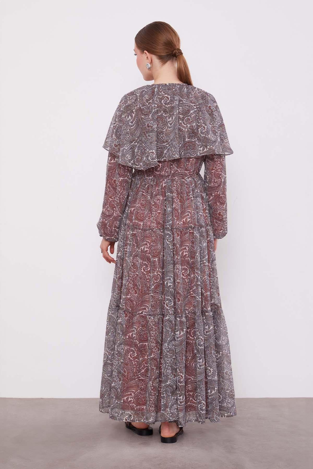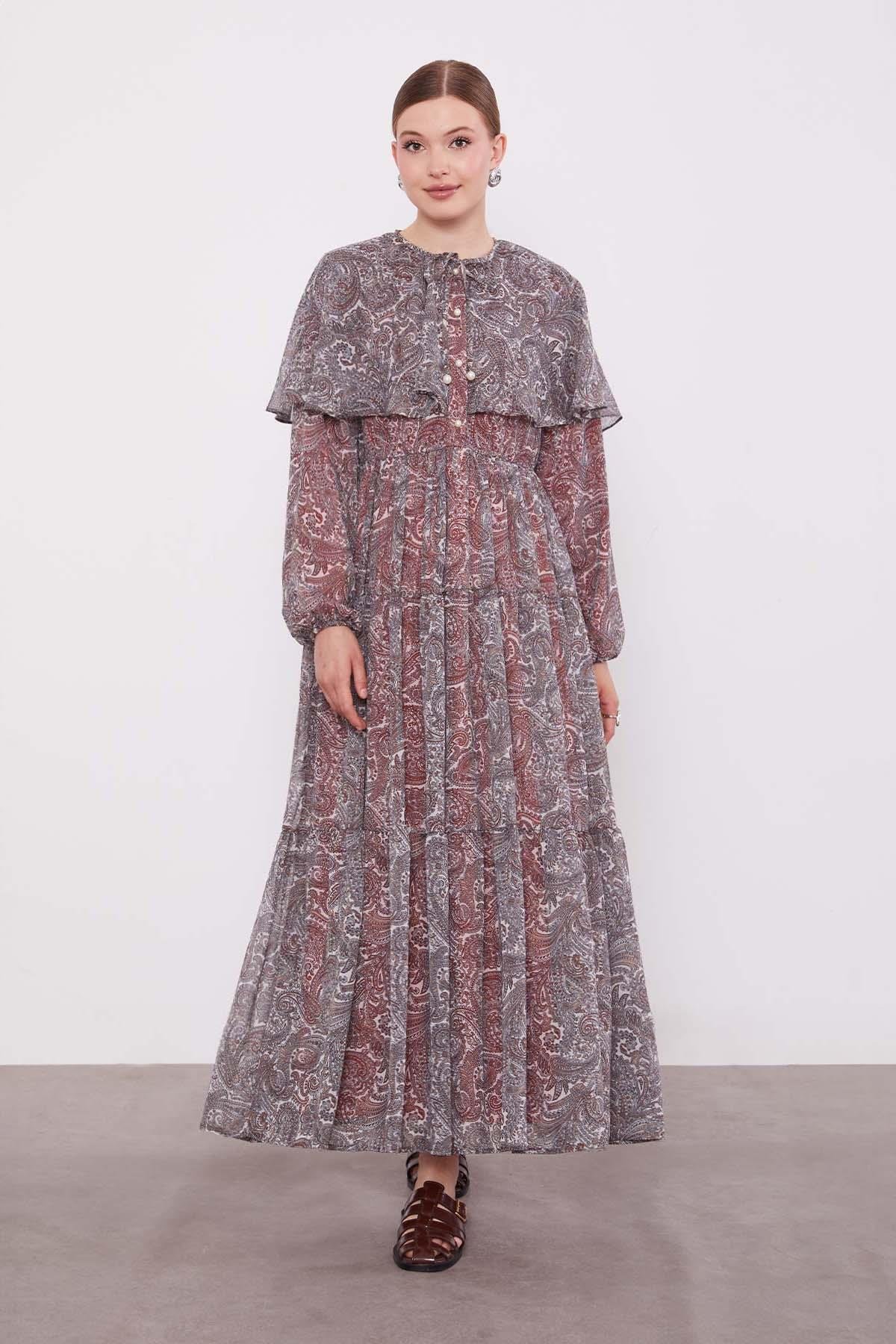 Etnik desenli şifon elbisenin omuzlarında bulunan şifon mini pelerini her ortamda ihtişam katarken; büzgülü katlı etek kısmı ise tasarıma olağanüstü görünüm sunuyor. Kolları lastikli fırfırlı elbisemiz hem hafifliği hem de yumuşak dokusuyla ciltte ferahlık hissi oluşturuyor. Vücut hatlarınızı belli etmeyen abartıya kaçmayan bu şifon elbise hem sade hem de dikkat çekici bir görünüm sunuyor.