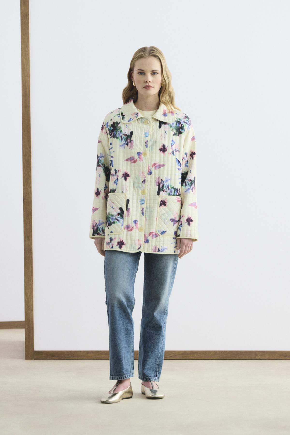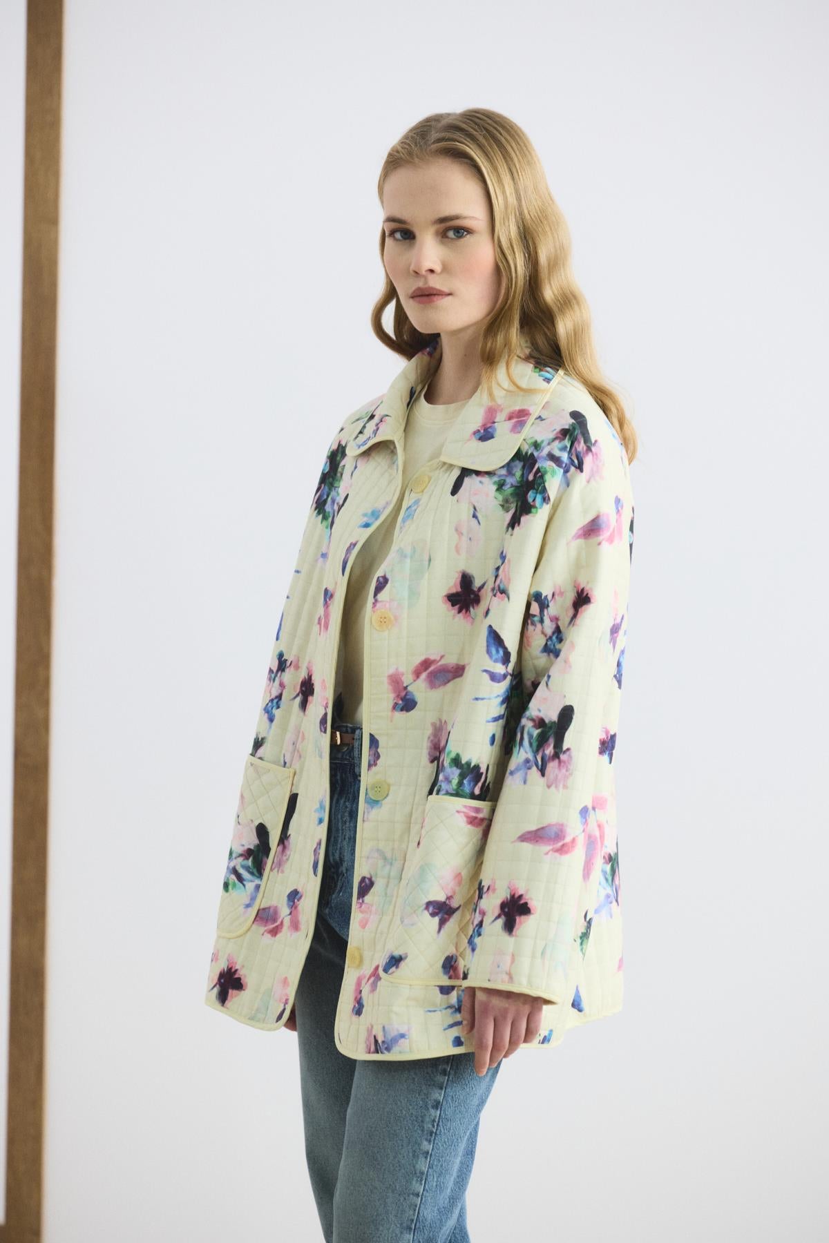 The Patterned Classic Collar Thin Quilted Jacket Yellow creates a lightweight layer that doesn’t weigh you down during seasonal transitions, thanks to the lightness and soft texture of the printed quilted fabric. The classic collar design and raglan sleeve cut combine with an oversized fit to present a modern silhouette, while binding details add an elegant frame to the design. With its front button closure and side pockets, it offers practical solutions for everyday wear.