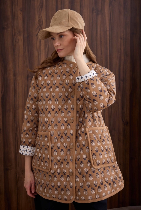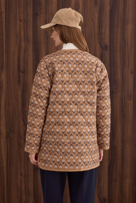 Crafted from 100% cotton fabric, this jacket features quilted detailing with fine microfiber filling, making it ideal for transitional seasons. The inner lining is also made from 100% cotton voile. The outer and inner patterns share the same color palette but feature different stripe designs, adding an extra cool and distinctive touch to the style.