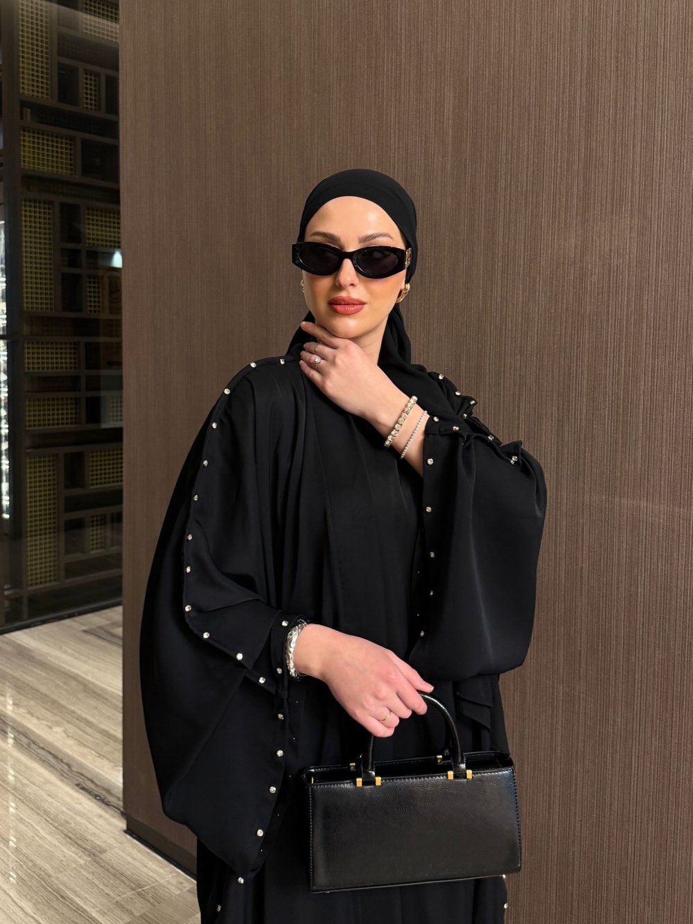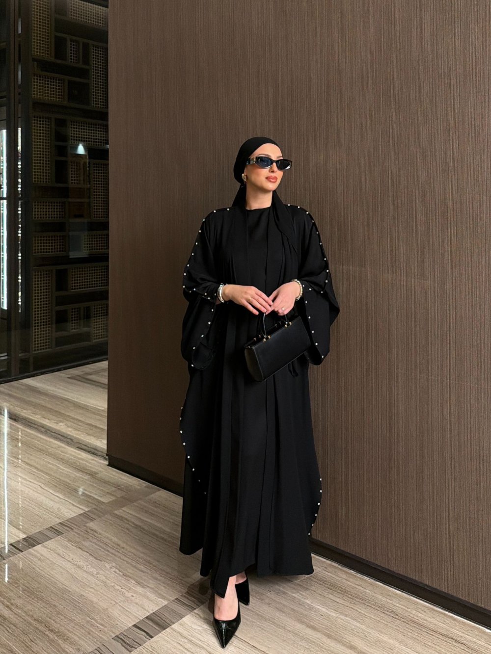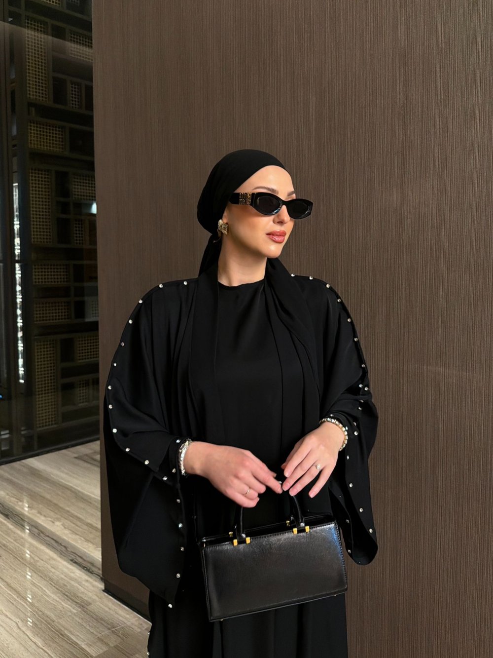 Tags: abaya, batwing sleeves, black abaya, modest fashion, pearl details, Satin, women's islamic clothing