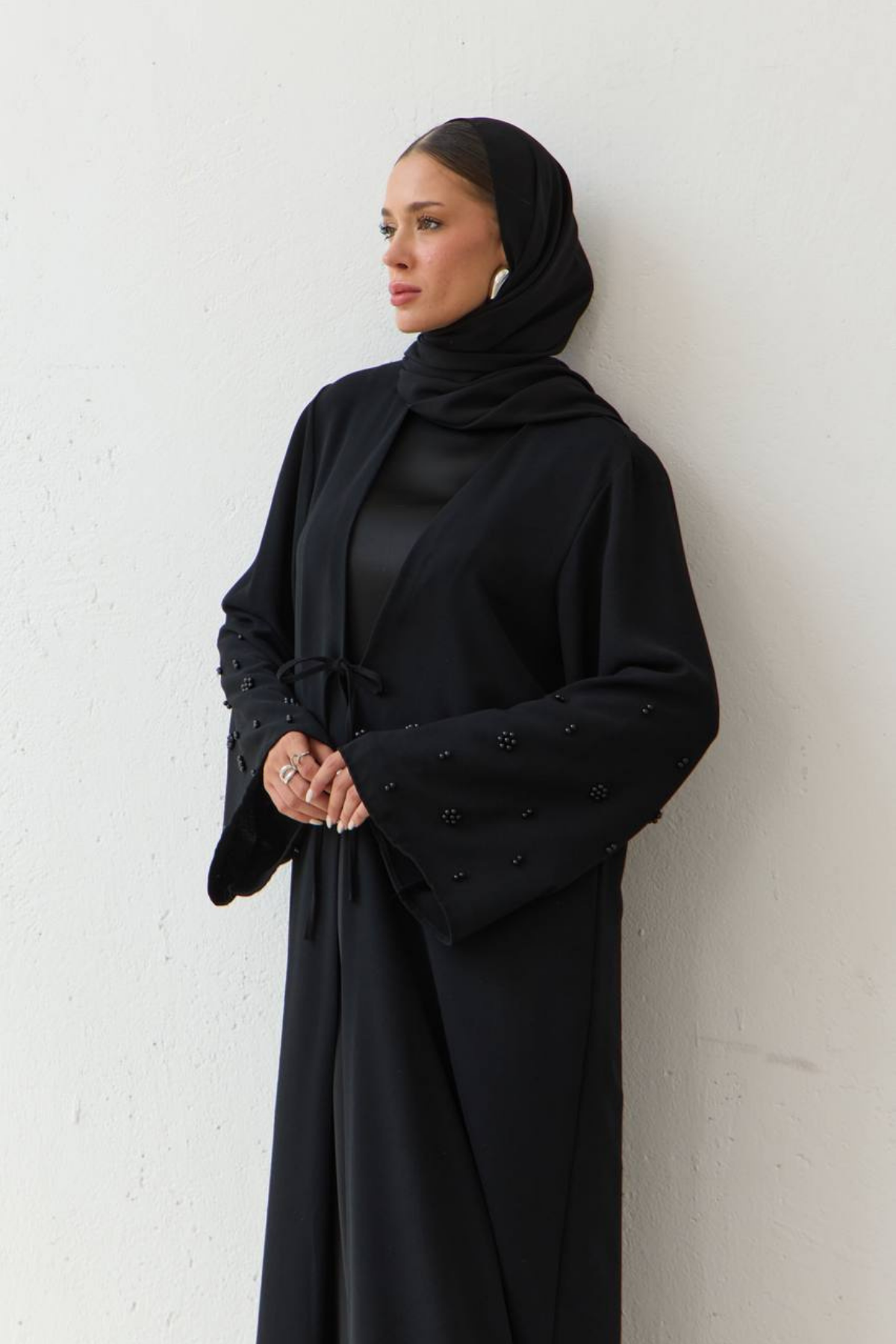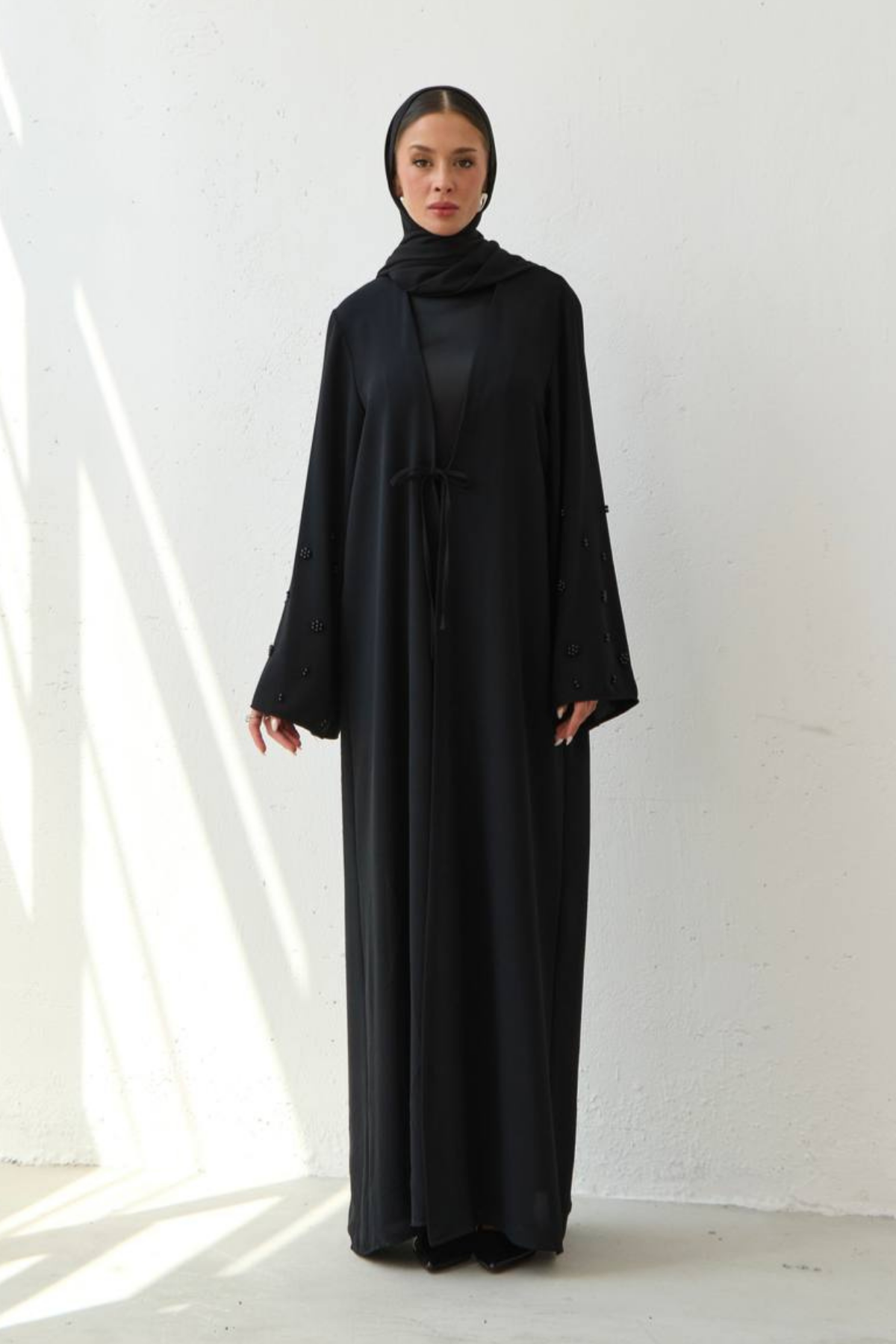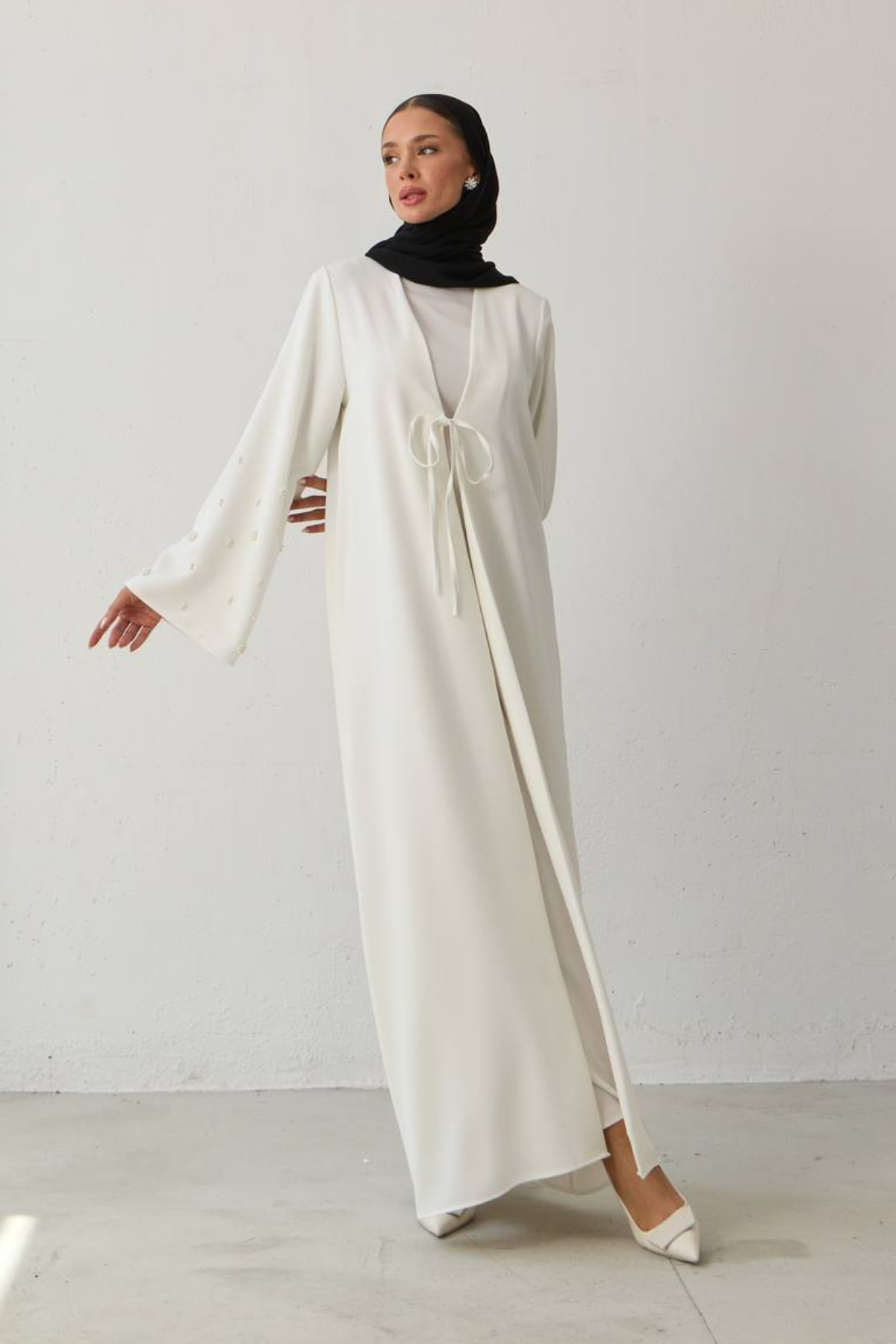 Grace in every flower. A timeless elegance that flows… This special abaya is adorned with pearl-like flower embroidery on its sleeves. Premium crepe fabric drapes fluidly on the body, combining all-day comfort with elegance. With its minimal cut and striking sleeve details, Pearl Bloom is a simple yet impressive expression of modern modest fashion.