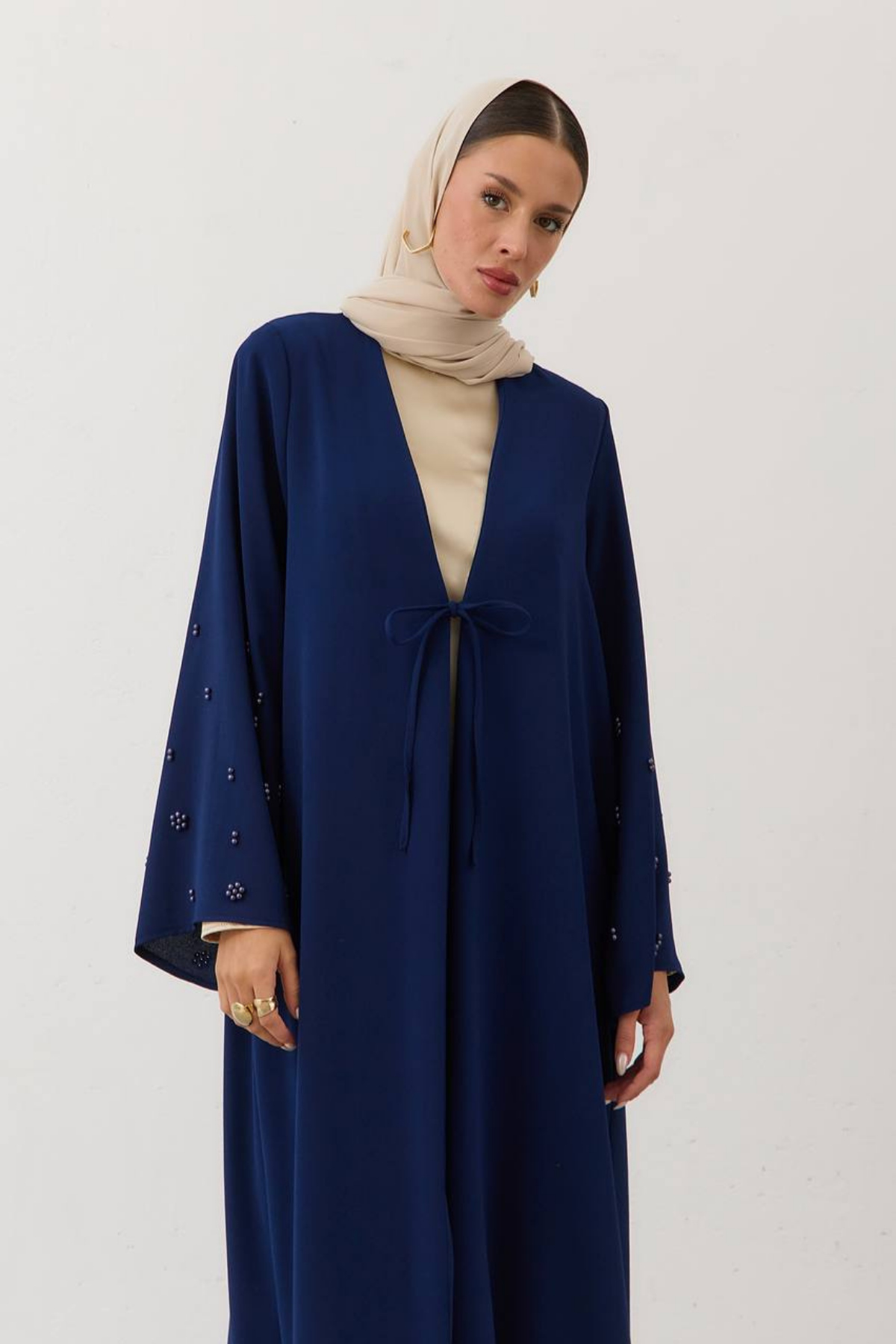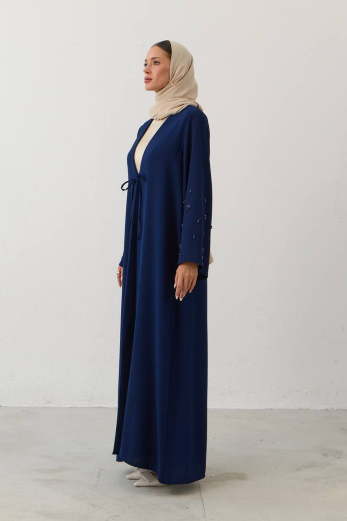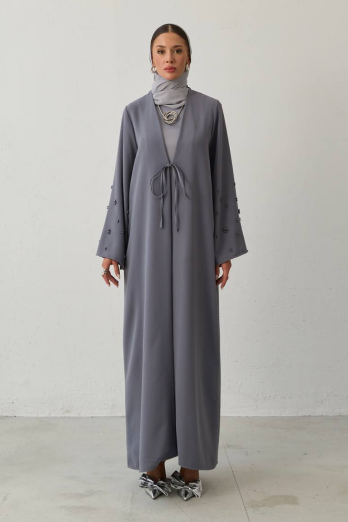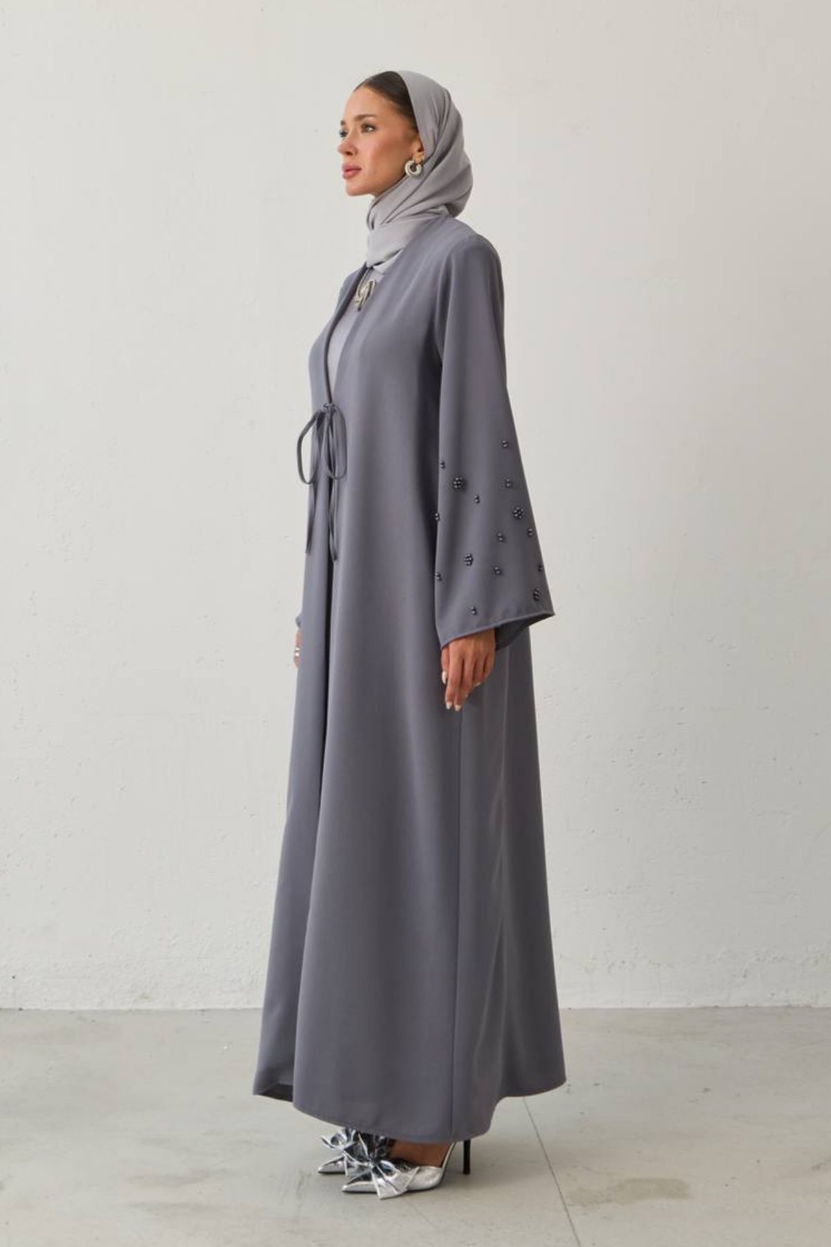 Grace in every flower. A timeless elegance that flows… This special abaya is adorned with pearl-like flower embroidery on its sleeves. Premium crepe fabric drapes fluidly on the body, combining all-day comfort with elegance. With its minimal cut and striking sleeve details, Pearl Bloom is a simple yet impressive expression of modern modest fashion.