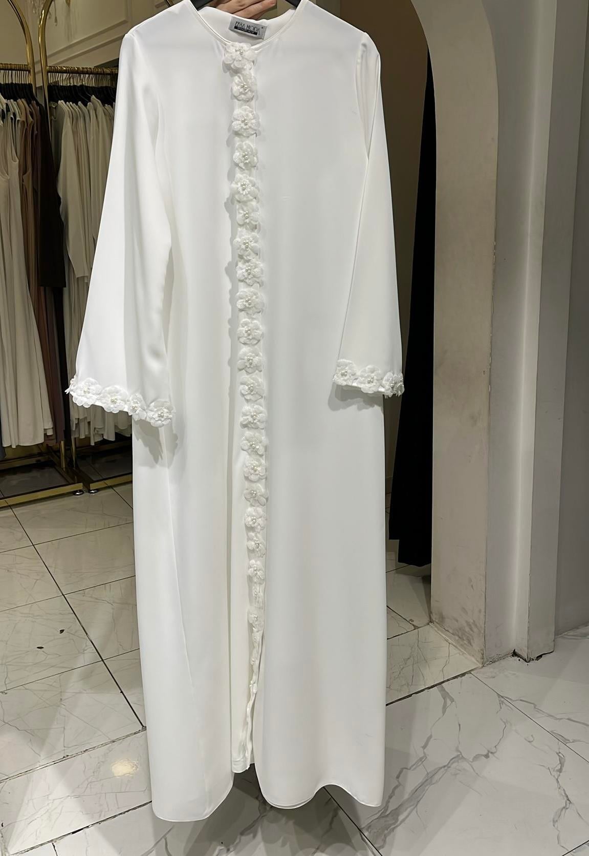This elegant white abeya features intricate pearl and floral detailing, offering a sophisticated look perfect for special occasions. Made with high-quality materials, it combines traditional style with contemporary fashion elements.