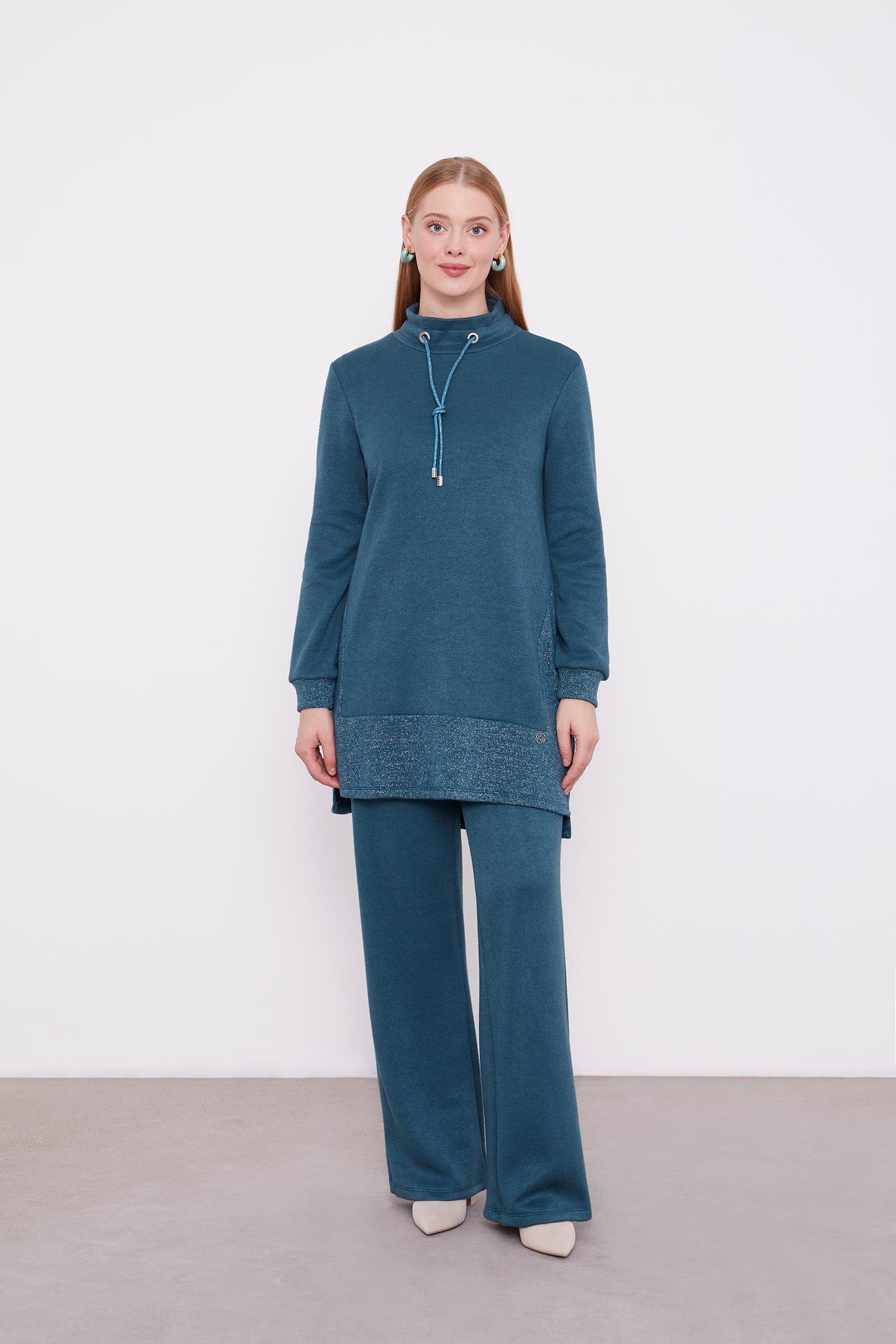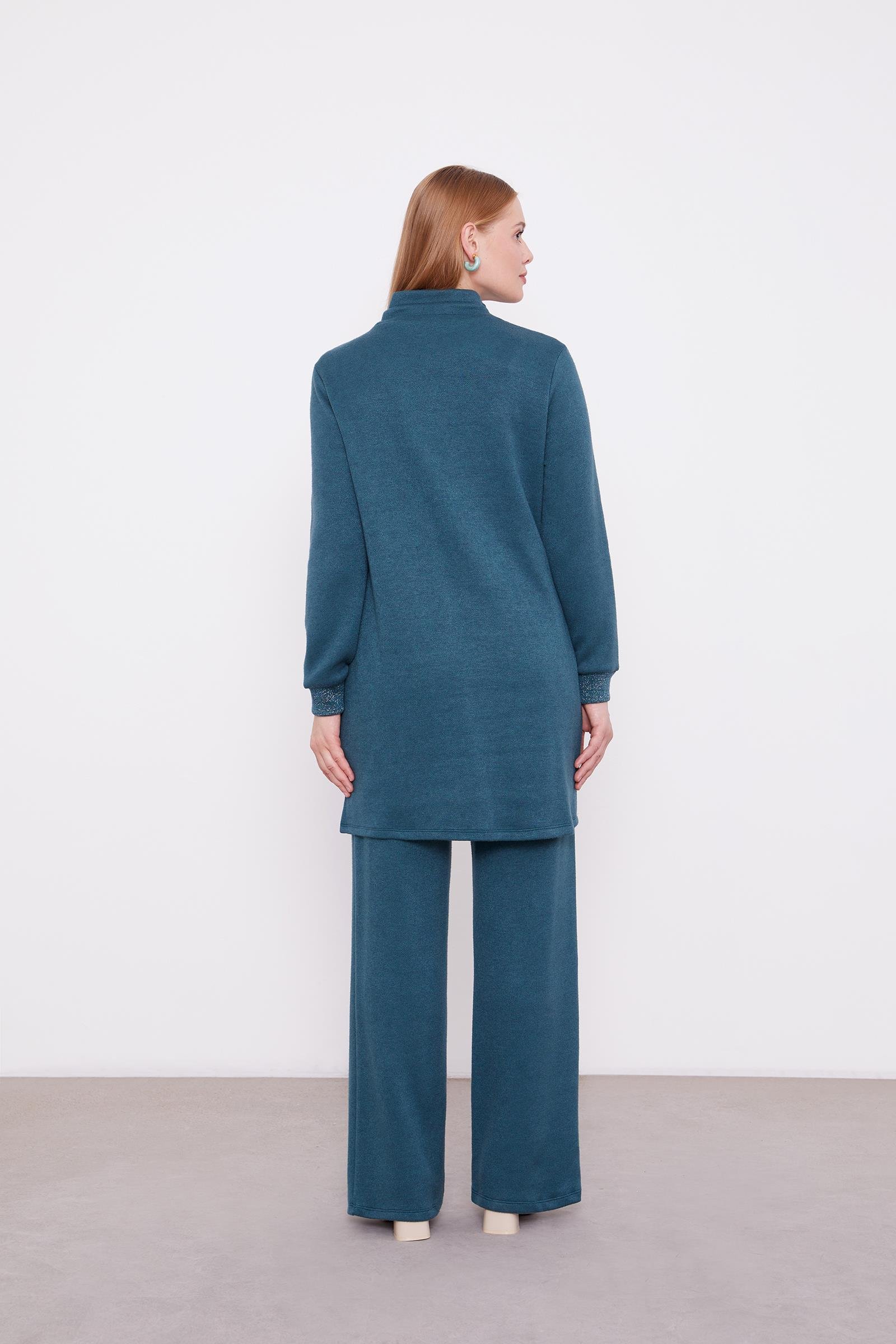 Petrol Green Glitter Cashmere Fabric Two-Piece Set