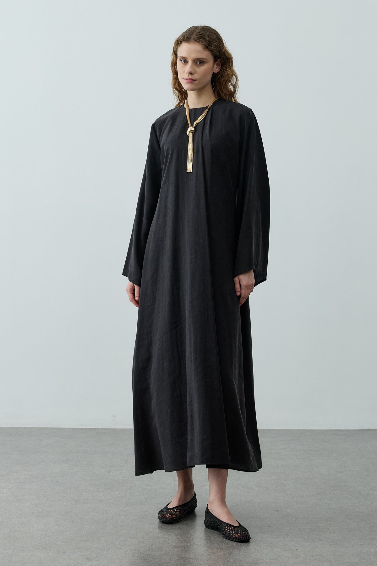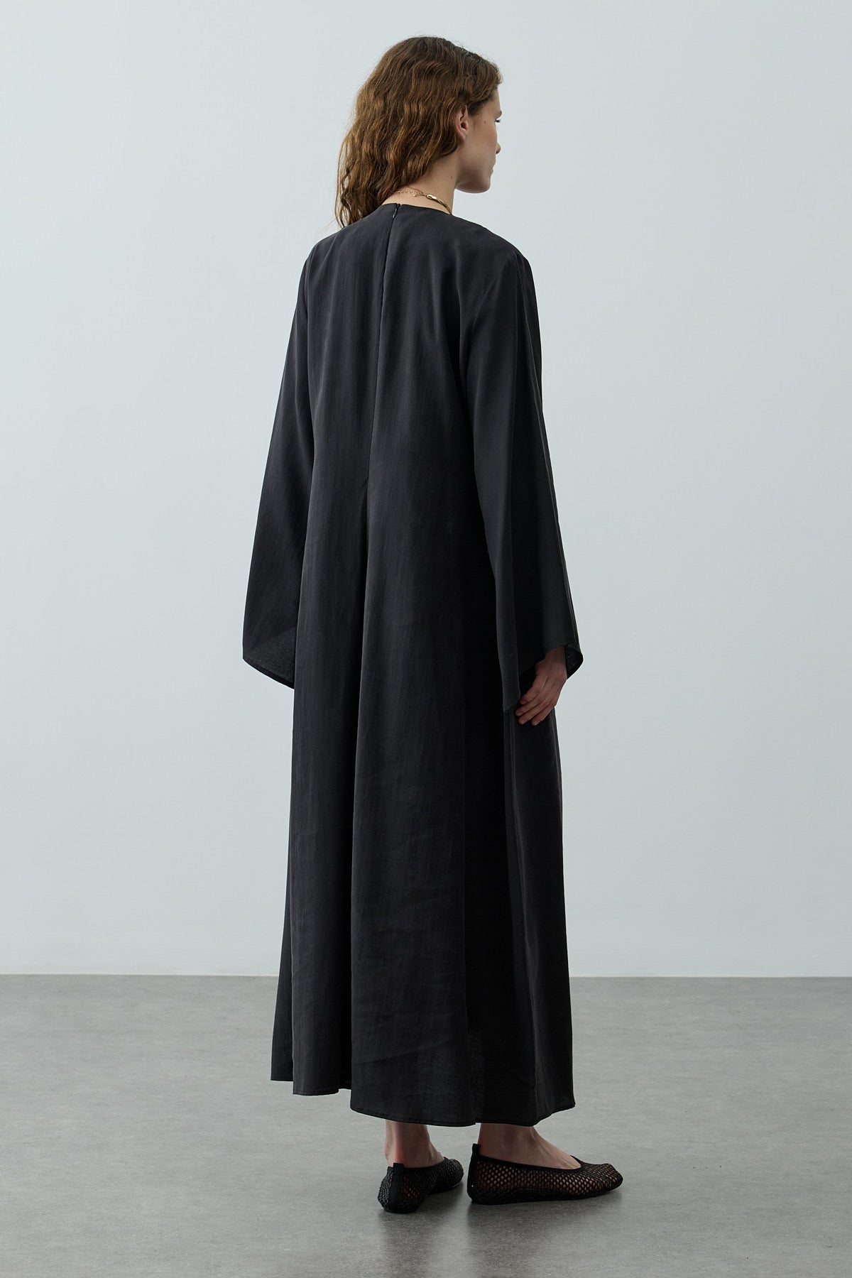 Tensel dokuma kumaştan, bisiklet yakalı, yakası pili detaylı, sırt fermuar kapamalı, uzun geniş kollu,maxi boy elbise.