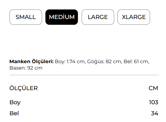 Manken Ölçüsü: Boy: 1.74 cm, Göğüs: 82 cm, Bel: 61 cm, Basen: 92 cm