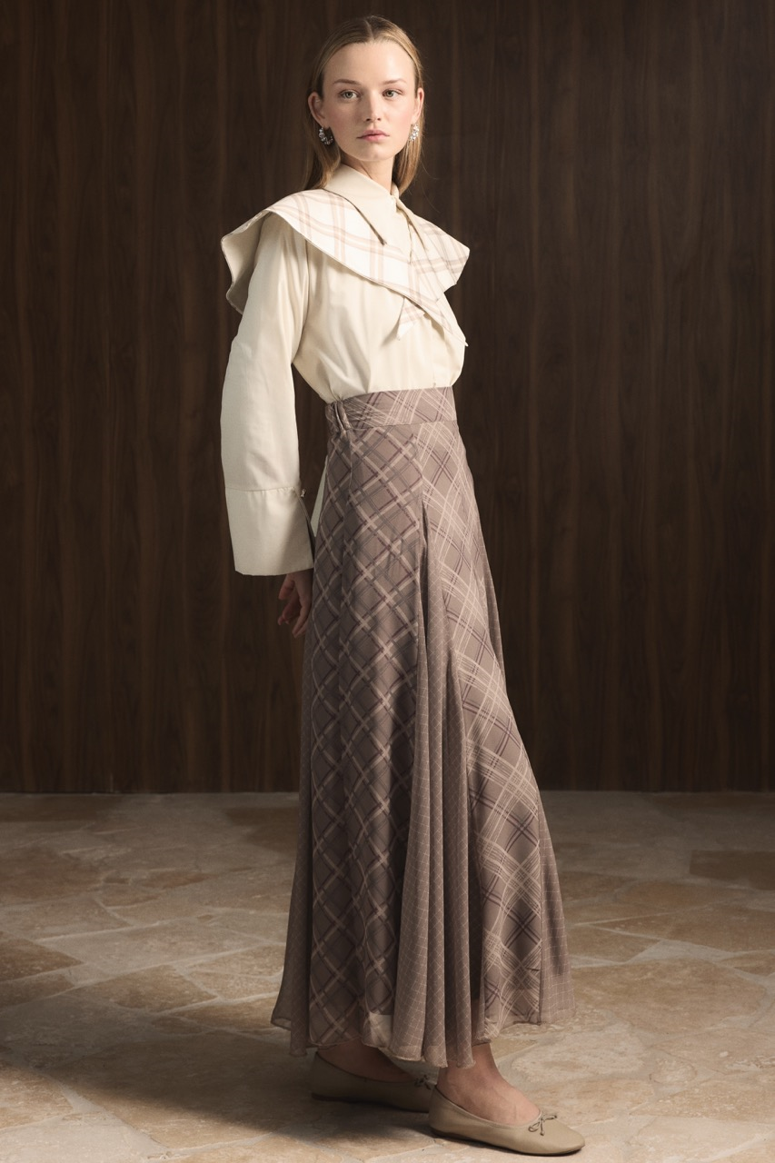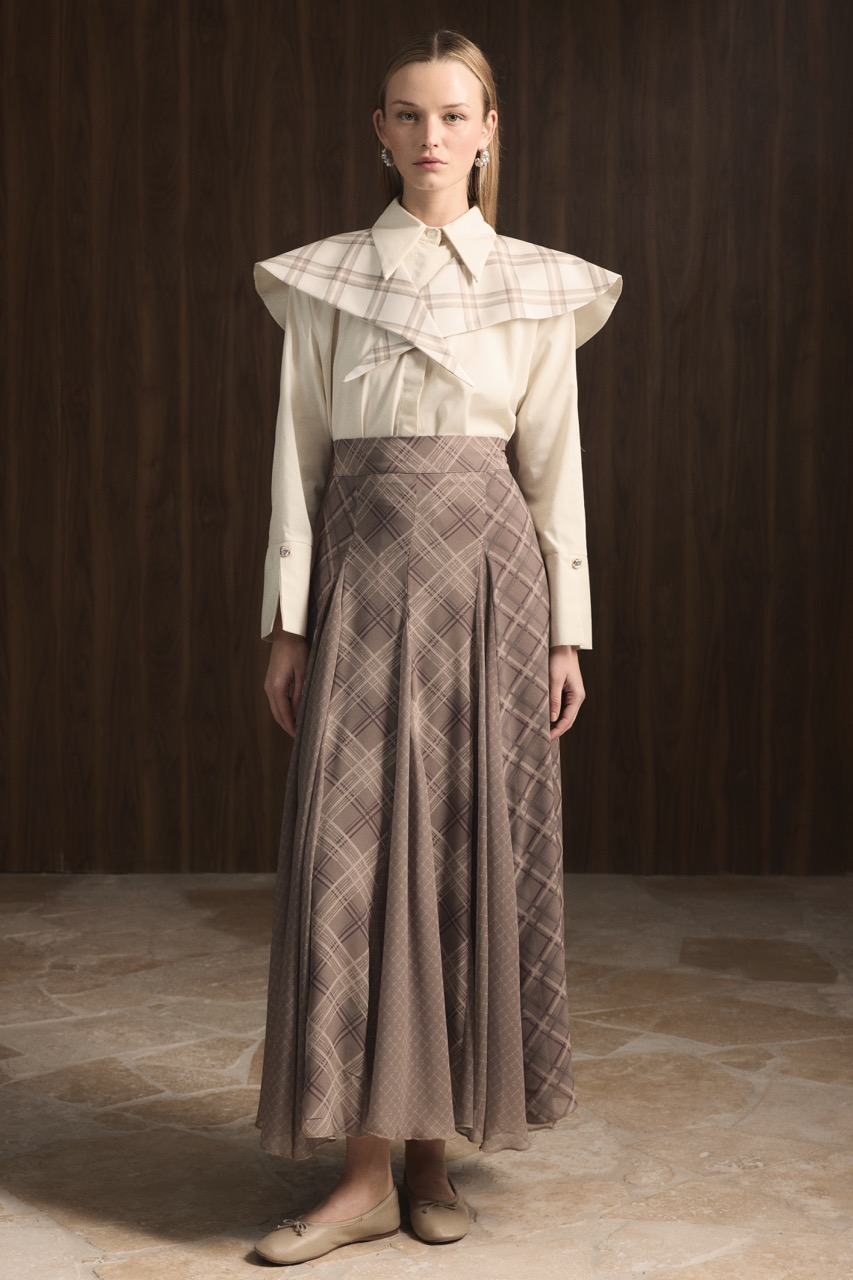 This chiffon plaid skirt features a patchwork design that offers a dynamic and modern look, creating a unique style by combining contrasting fabrics. The flared cut provides a balanced and elegant silhouette, while its lined structure ensures comfortable and secure wear. The waist features a flat front and elastic back design, with a side zipper detail for easy wear. Versatile for use from daily outfits to urban chic.