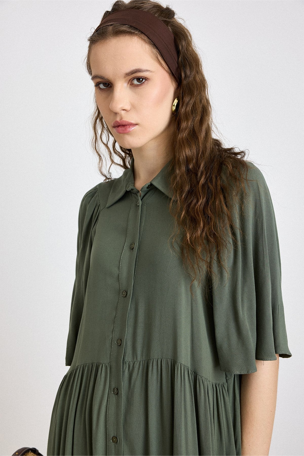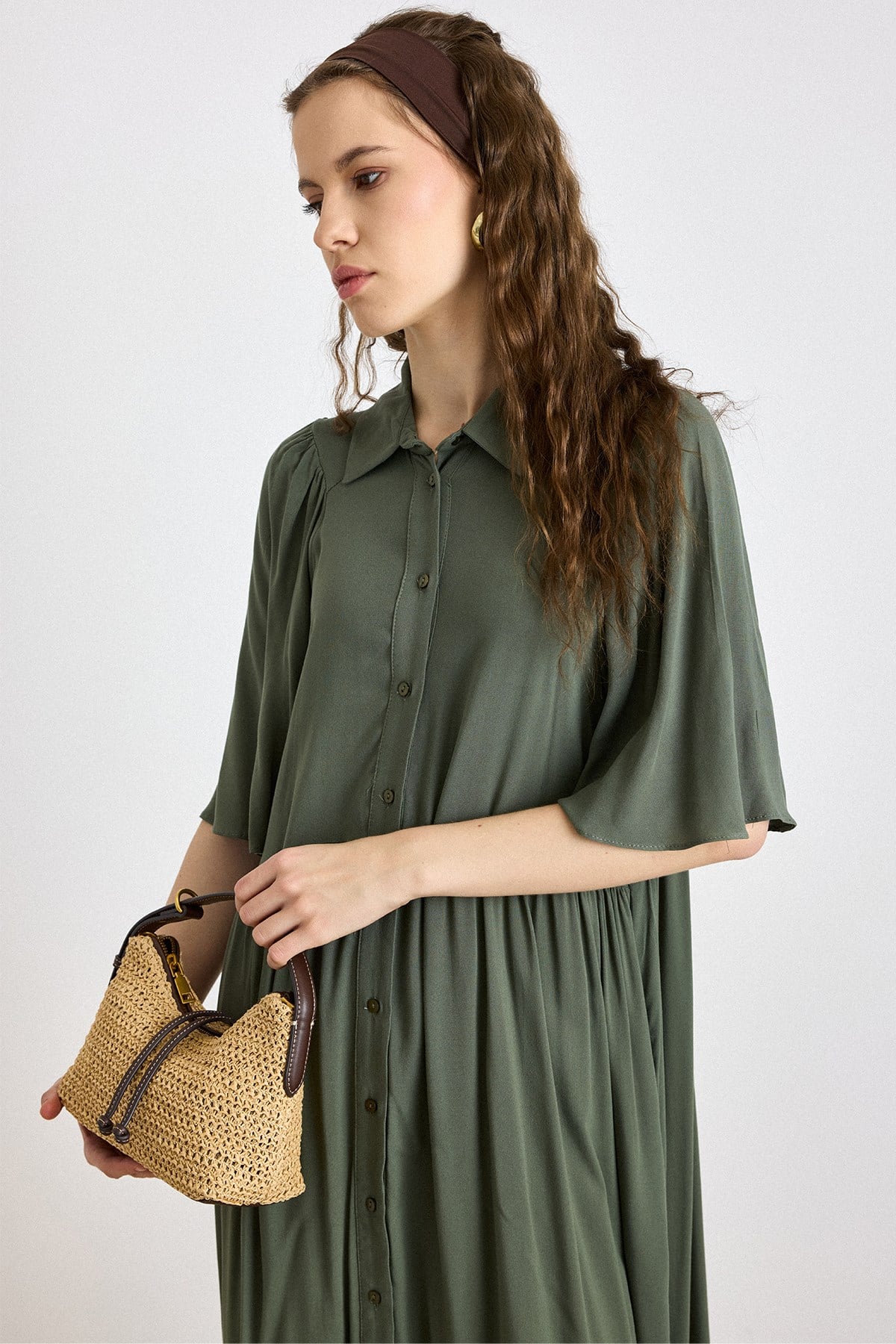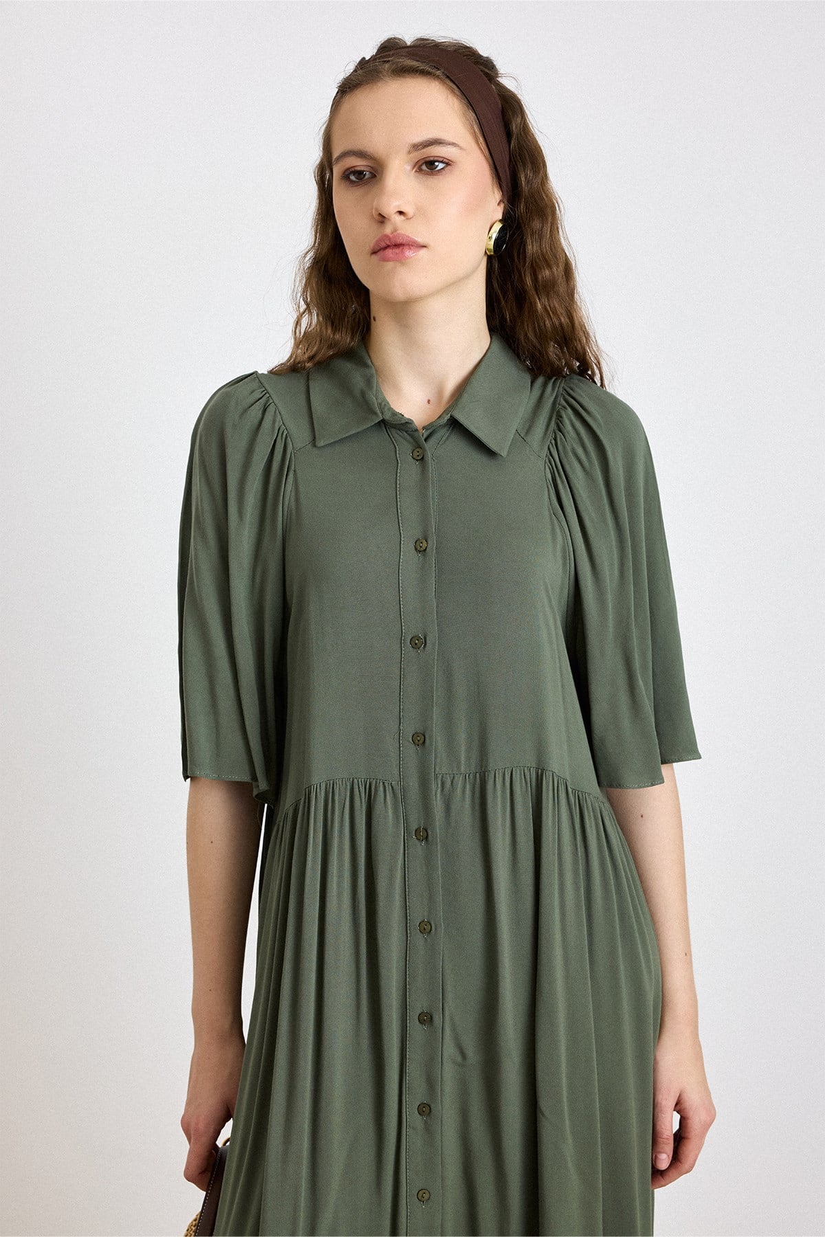 Pleated Detail Half-Sleeve Soft Dress KHAKI 9418-E