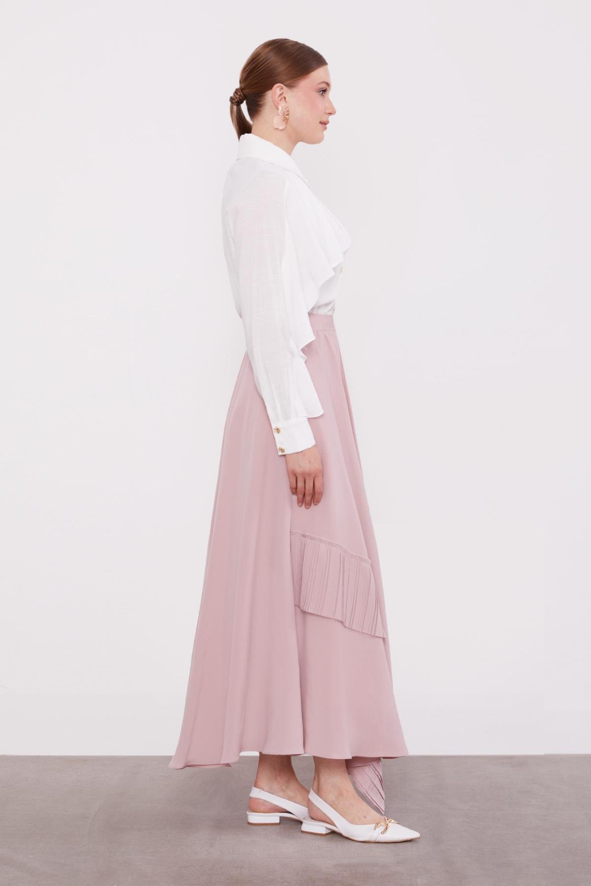 This pleated detail skirt is elegant enough to elevate your simple outfit to the highest level while ensuring you look equally confident. Thanks to its pleated cut, you can achieve graceful elegance with high heels or create a casual style with sneakers. The pleated details on the asymmetrical hemline immediately draw attention. Paired with a short women’s blouse, it offers a chic and sophisticated look all day long. With Levidor’s difference and guarantee, owning stylish and quality models has never been easier.