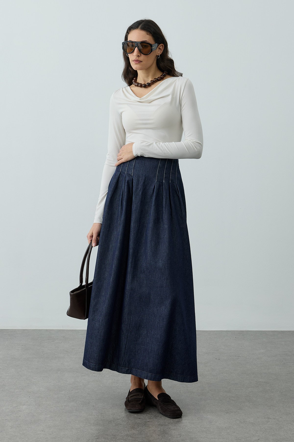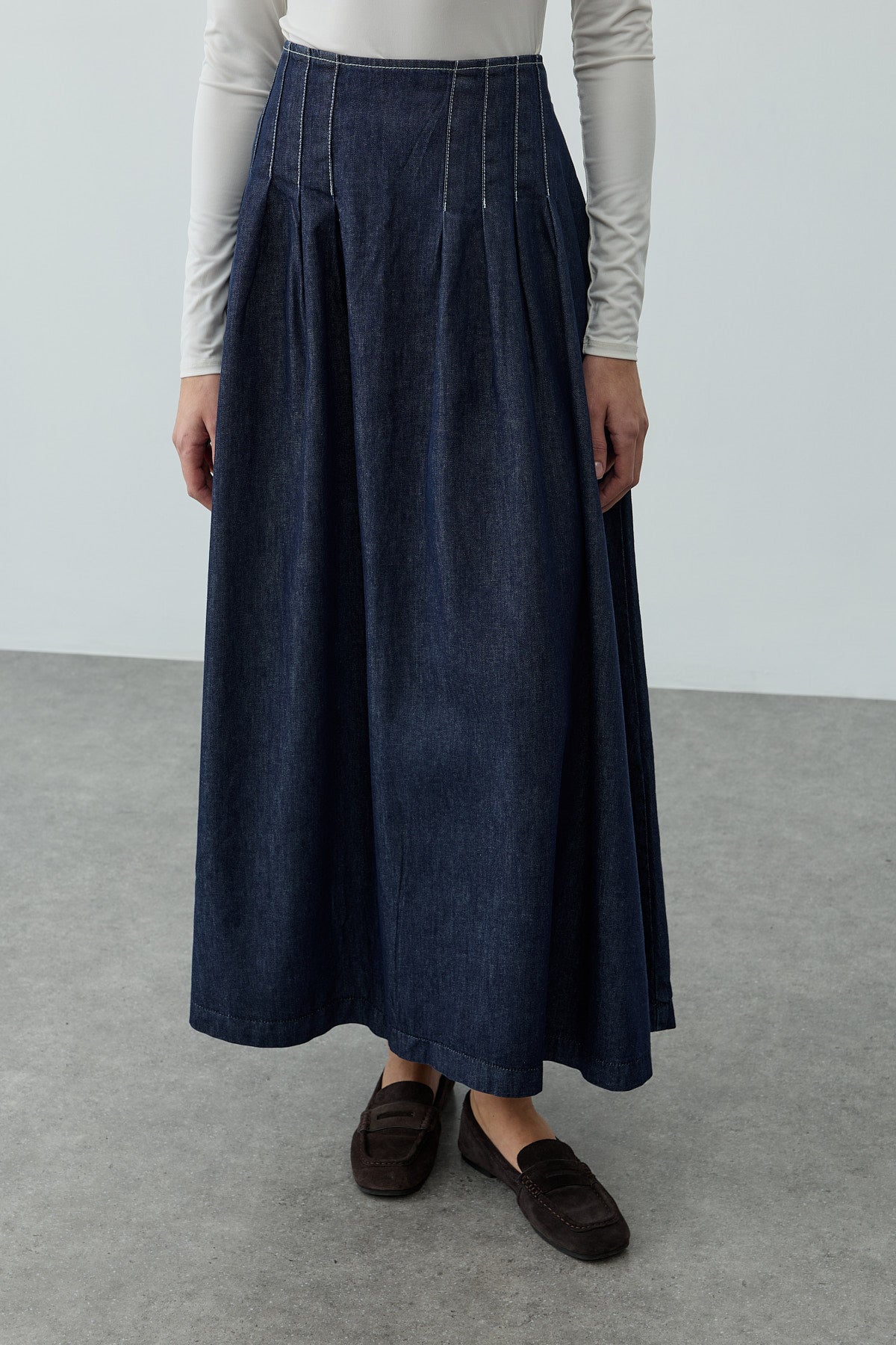 A maxi-length skirt crafted from denim woven fabric, featuring a high waist, prominent stitching, pleated details, and a hidden zipper closure.