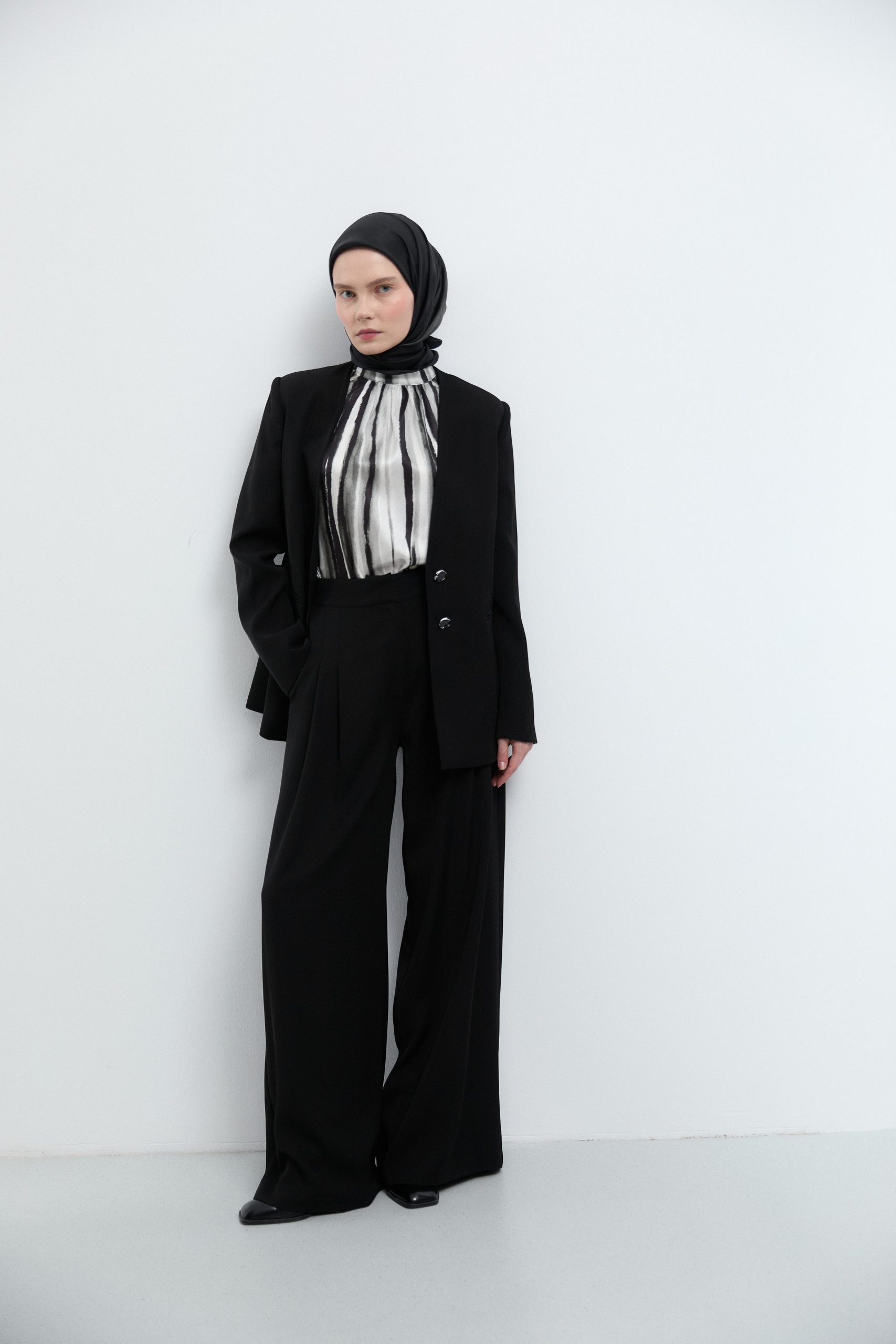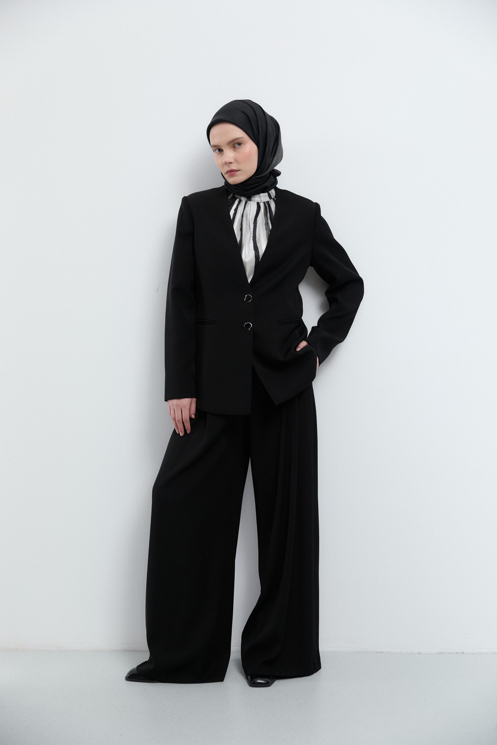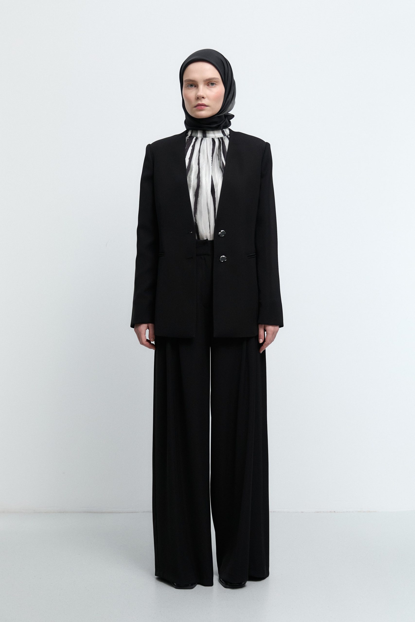 This jacket showcases a modern silhouette with clean lines and pleated pocket details, offering a powerful and refined style through its timeless design.