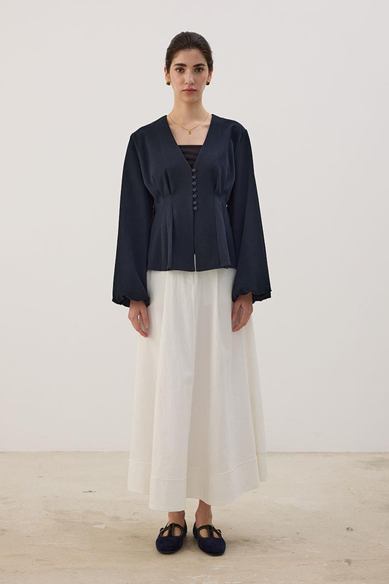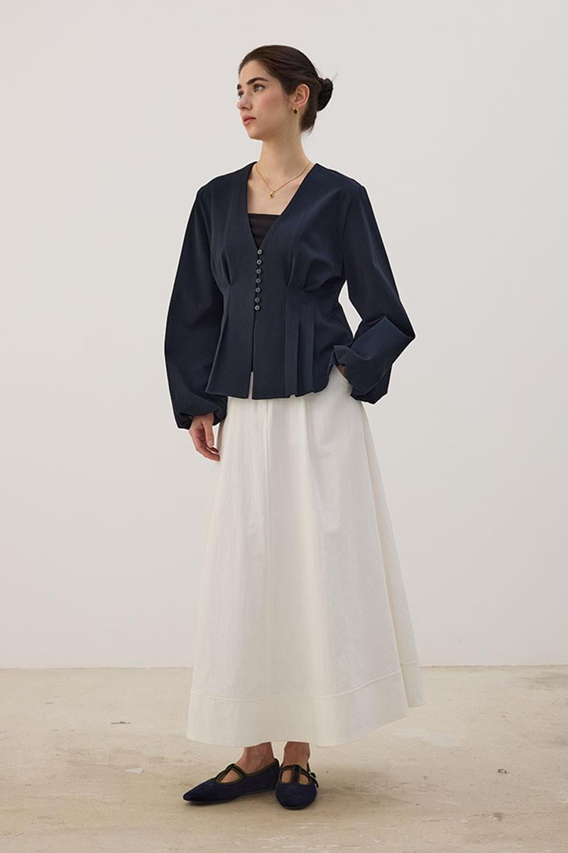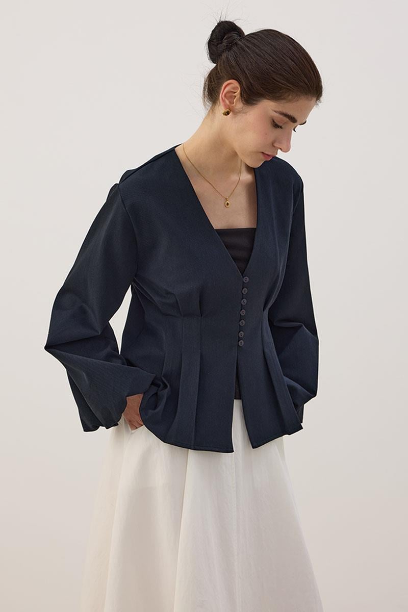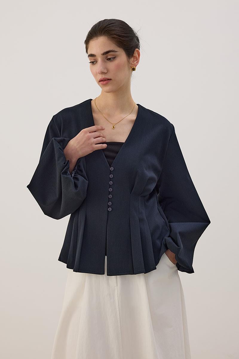 Tags: navy blue, pleated jacket, polyester viscose, short jacket, slim fit, V-neck, women's fashion