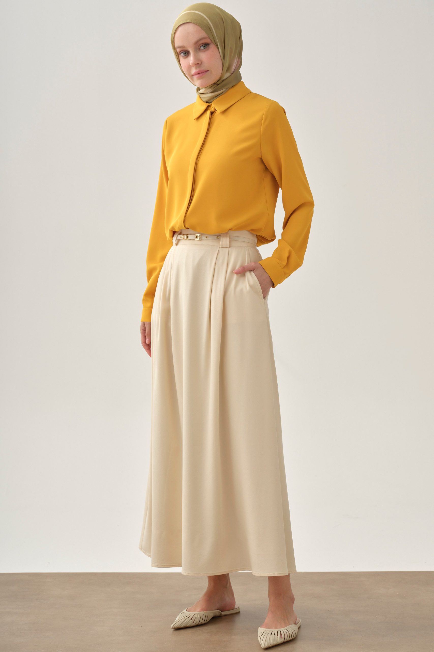This skirt gains movement with its elegant pleat details and offers a feminine posture with its thin belt. Its lightweight structure provides comfort throughout the day. It fits both classic and modern combinations.