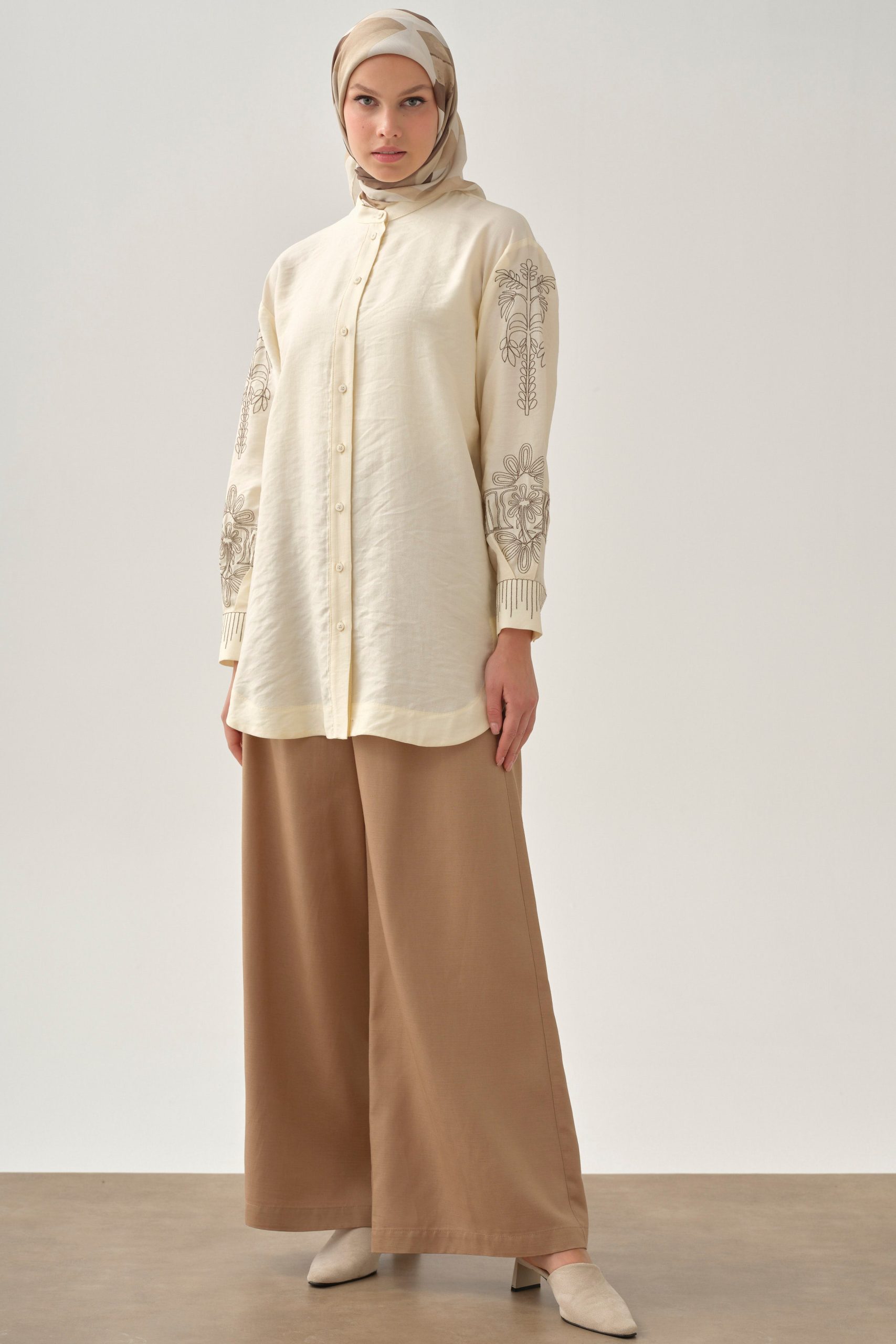 These trousers gain movement with pleat details and combine elegance with functionality through hidden pockets. Their comfortable fit offers all-day comfort. Adds a refined touch to both everyday and office styles.