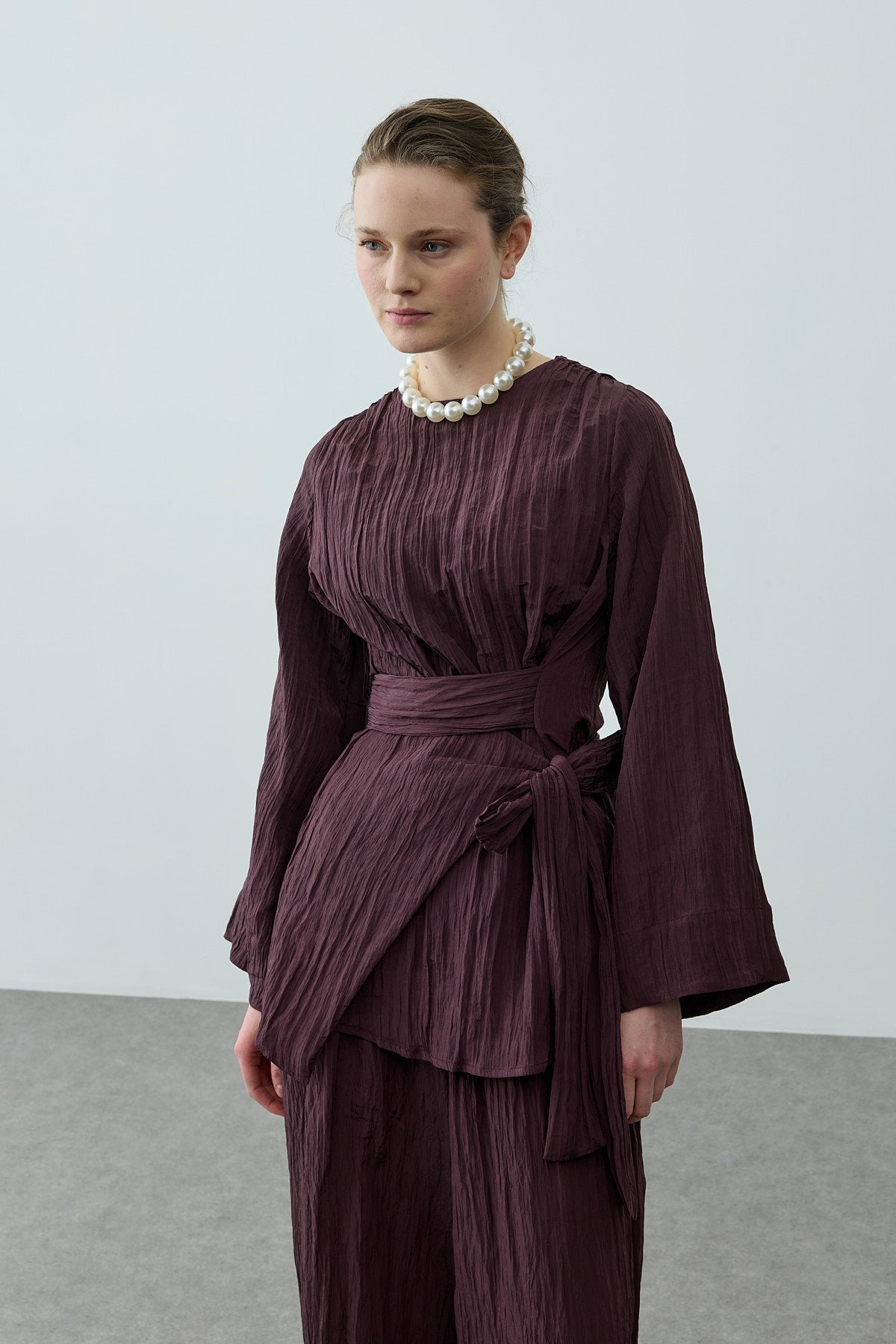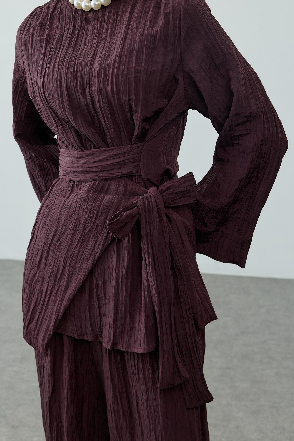Tags: elegant outfit, fashion set, glossy fabric, palazzo pants, plum color, women's suit