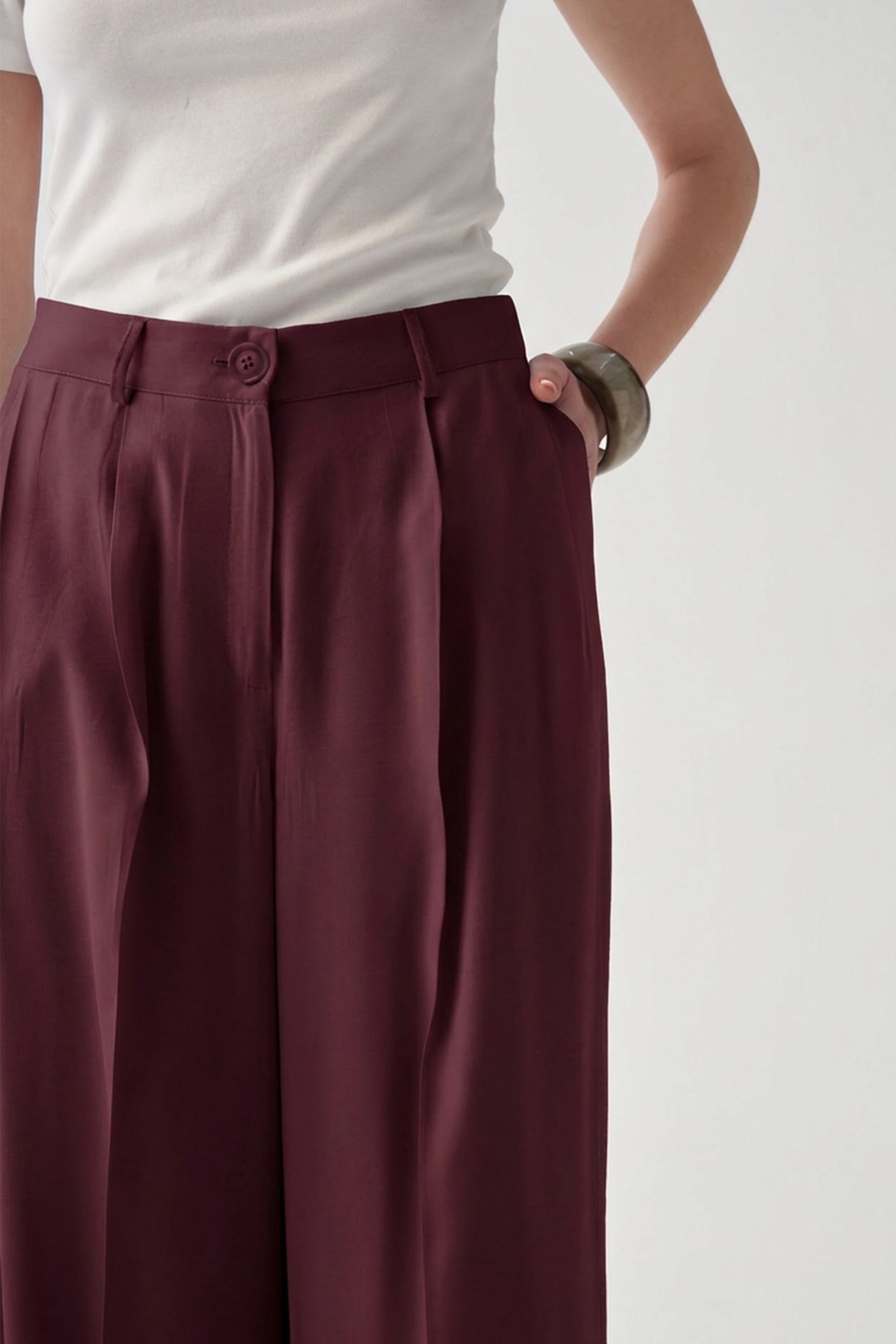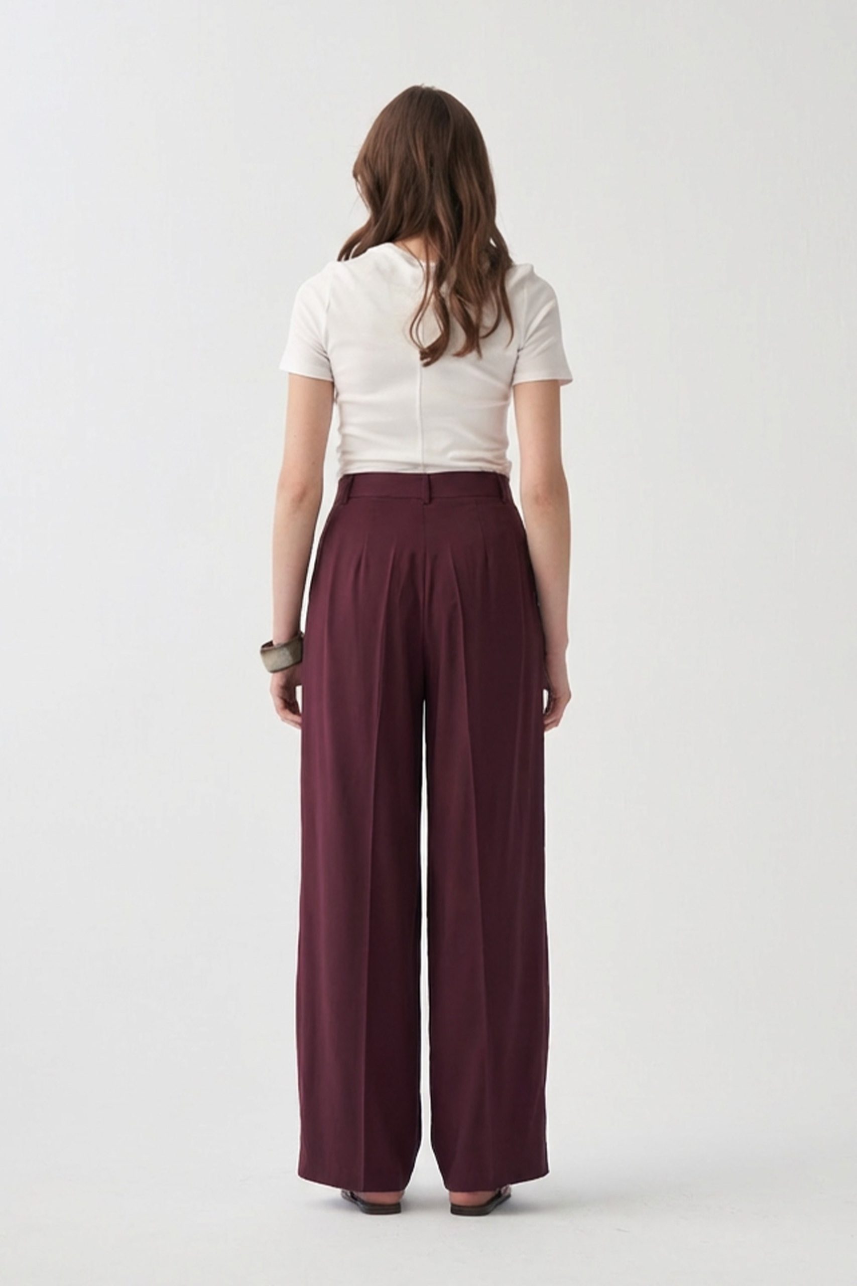 Tags: elegant trousers, palazzo pants, pleat detail, plum color, premium quality, summer fashion, viscose blend