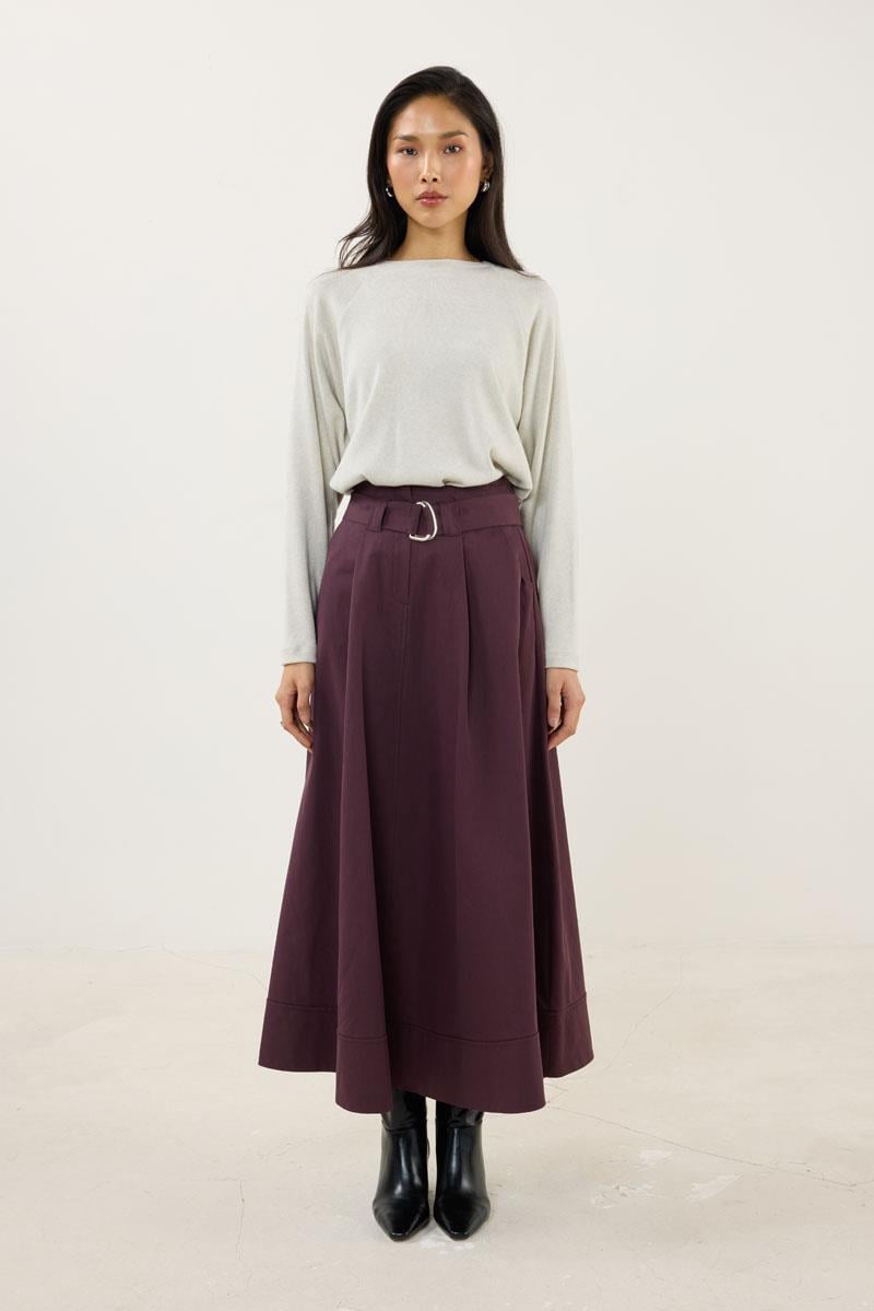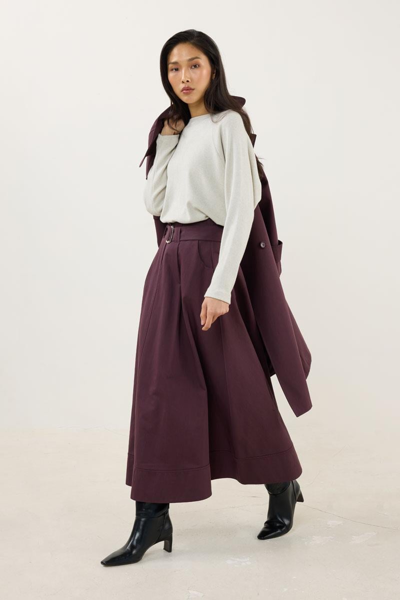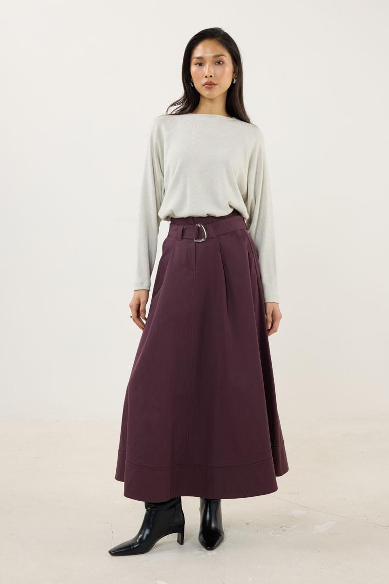 Tags: belted skirt, Cotton Polyester, plum skirt, seasonal fashion, split hem, women's skirt