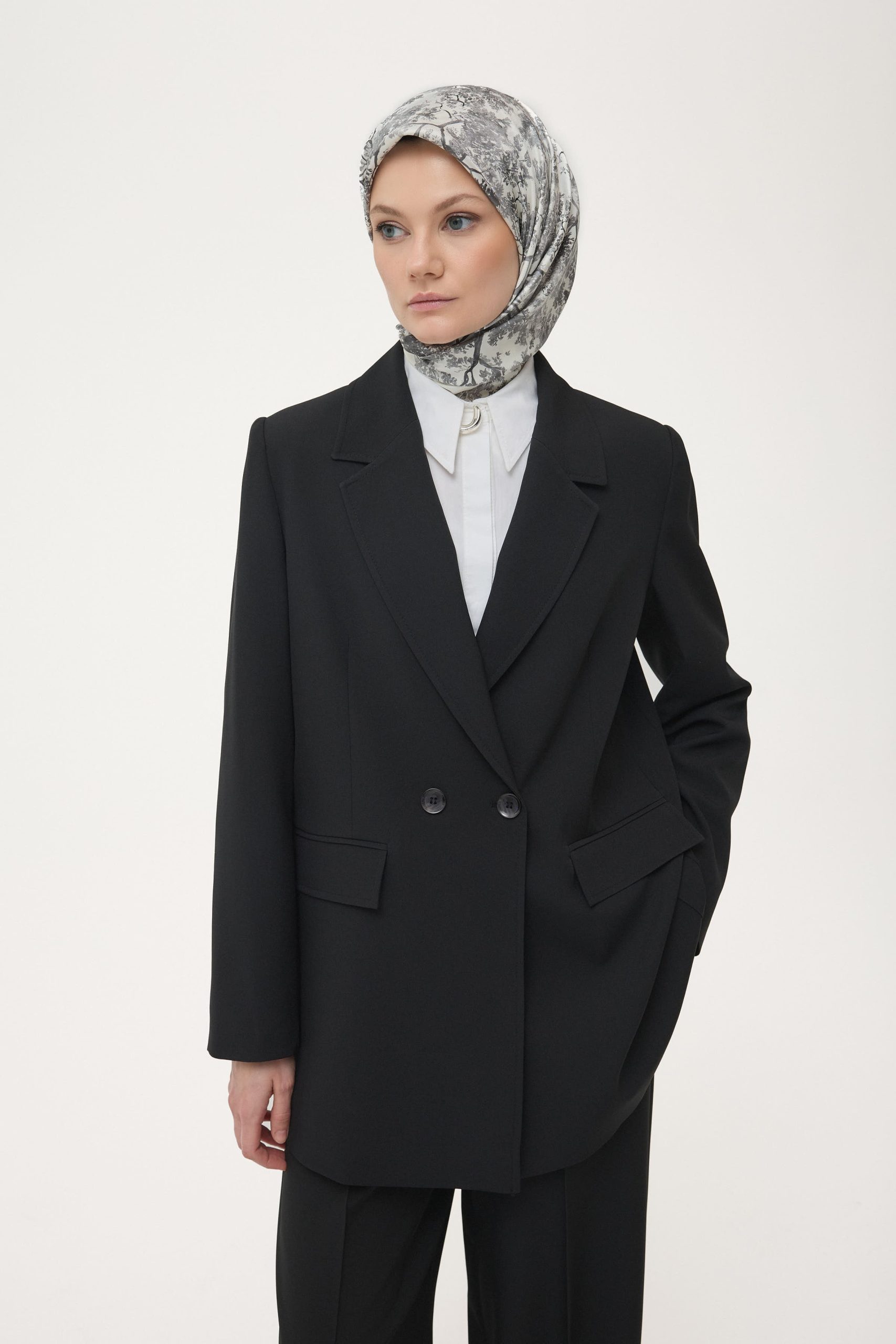 TOP: {‘Fabric Content’: ‘89% Polyester, 11% Elastane’, ‘Pattern’: ‘Solid’, ‘Collar Type’: ‘Blazer Collar’, ‘Sleeve Type’: ‘Long Sleeve’, ‘Pocket’: ‘Flap Pocket’, ‘Lining’: ‘Lined’, ‘Product Length’: ’75 cm’, ‘Fit Type’: ‘Regular Fit’}