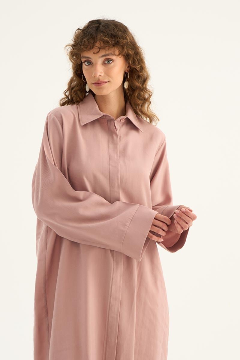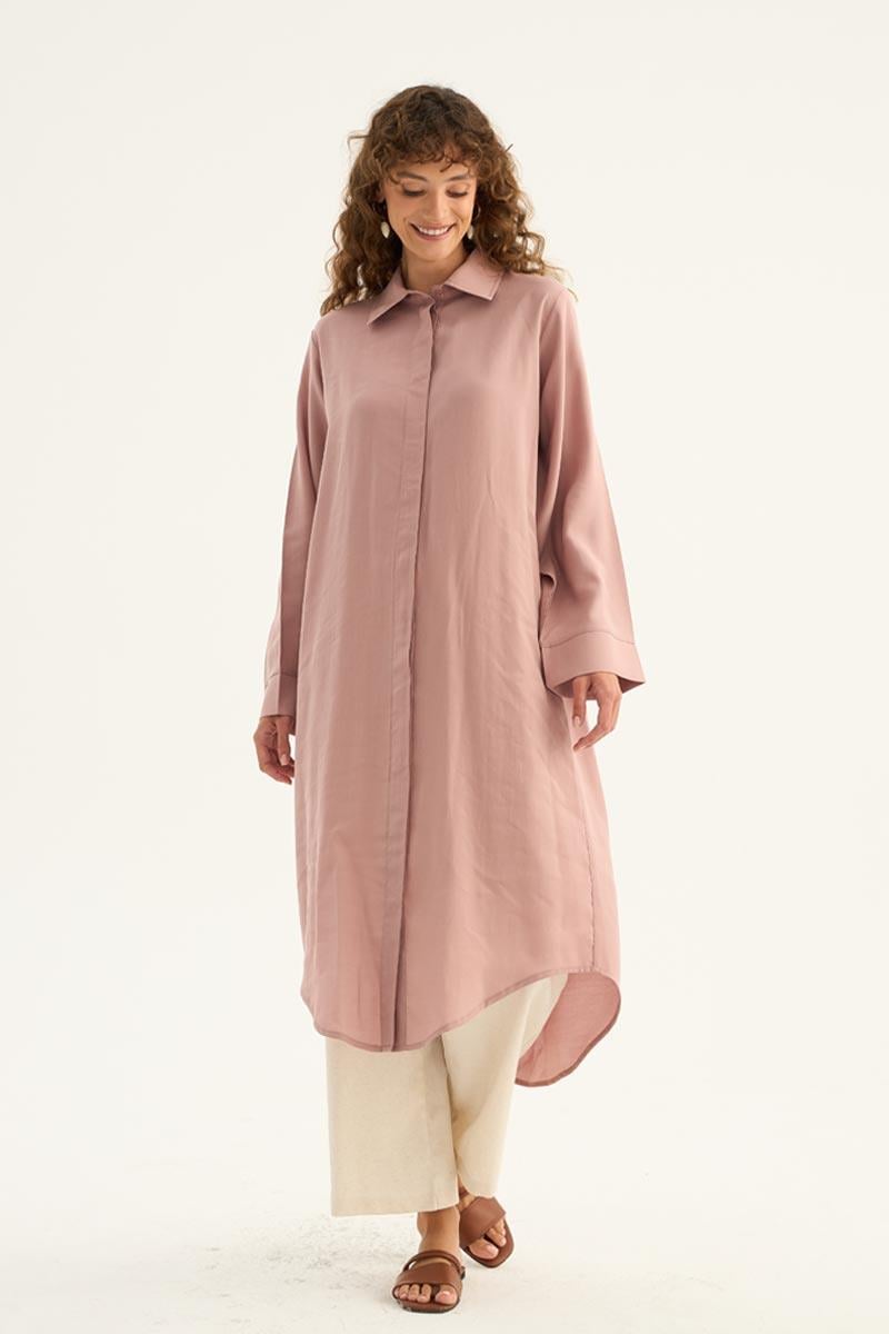 This long powder pink tunic offers a natural and breezy look, making it one of the light and chic pieces for the summer season. Crafted from a blend of 88% Tencel and 12% PES, its fabric provides all-day comfort with a soft texture and breathable structure. Featuring a minimalist design, hidden button placket detail, and an elegant curved hem cut, it presents a modern silhouette. With its long sleeves featuring wide cuffs and a relaxed fit, this tunic offers freedom of movement and can be effortlessly styled for both casual everyday outfits and office elegance. It pairs perfectly with neutral and pastel-toned trousers and can be adapted to different styles with either heels or flat shoes. Its delicate powder pink hue adds a fresh and serene touch to your wardrobe.