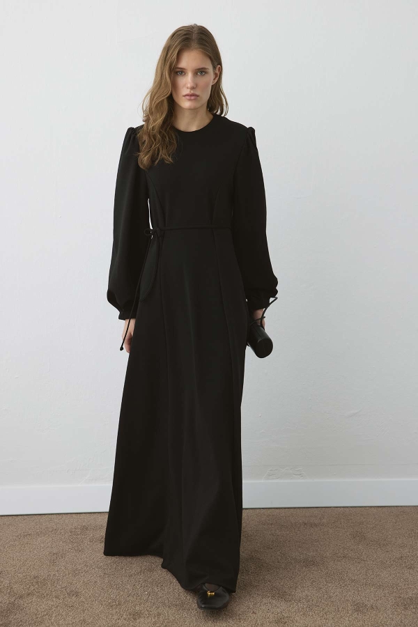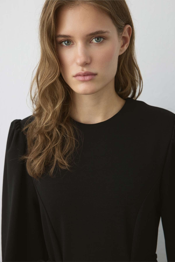 FEATURES OF THE PREMIUM BLACK DRESS WITH WAIST SEAM DETAIL: Bateau neckline, padded shoulders, back zipper, gathered shoulders, and cuffs with pleated lace detailing. Features a self-fabric tie belt, full cut, unlined premium dress with waist seam detail. FABRIC CONTENT AND CARE: 77% Polyester, 20% Polyamide, 3% Elastane. Should be washed at 30°C on delicate, synthetic, and gentle cycles. Manual measurements may vary by 2-3 cm. Model Size: Small. Model Measurements: Height: 174 cm, Bust: 78 cm, Waist: 58 cm, Hips: 87 cm