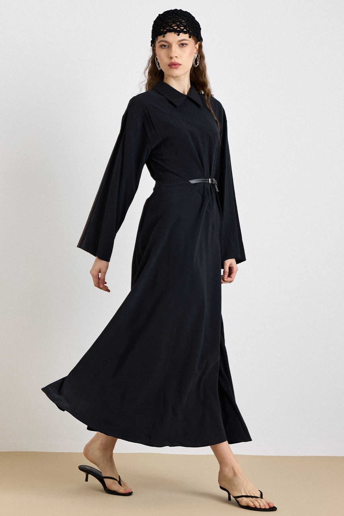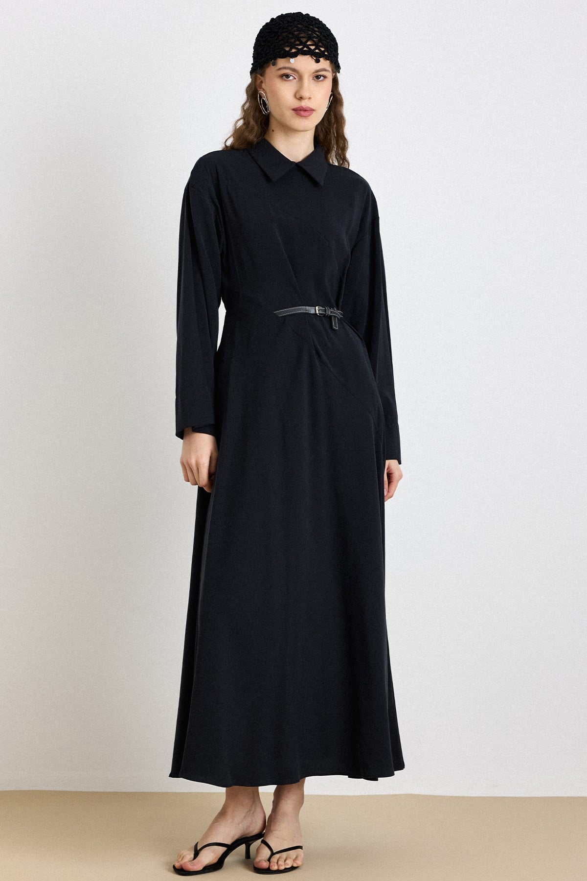 Premium Fabric Flared Dress with Belt Accessory BLACK 9423-E