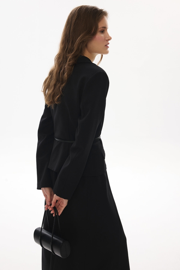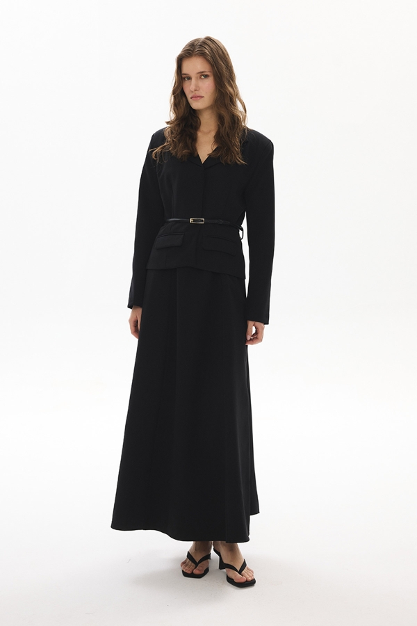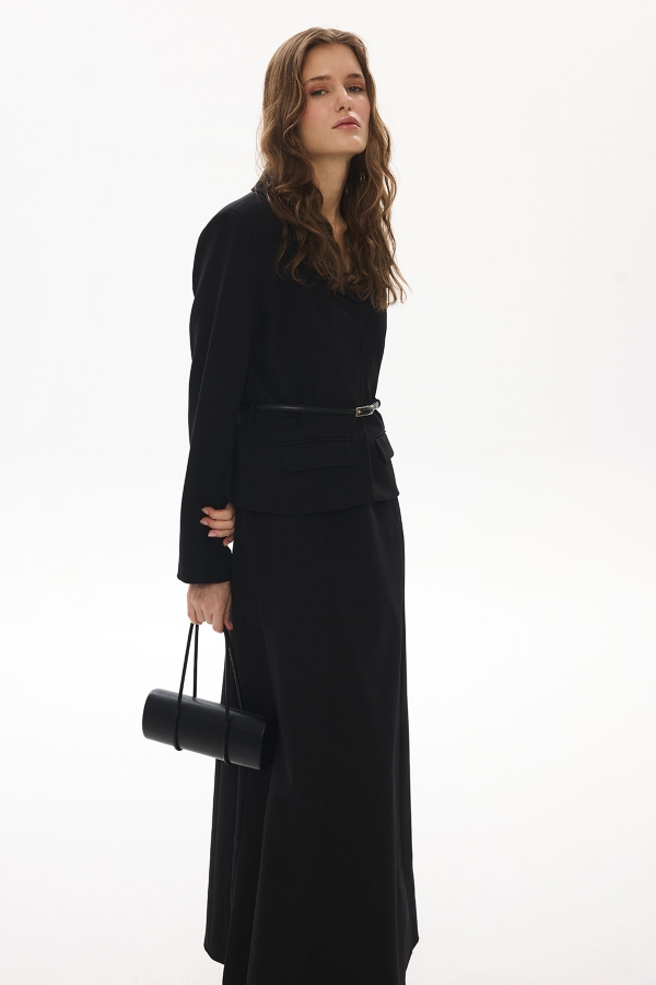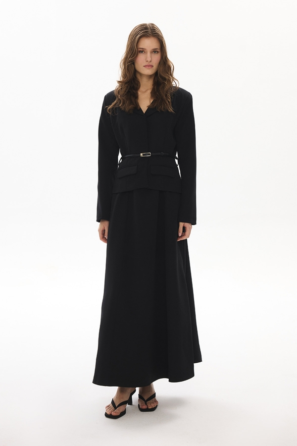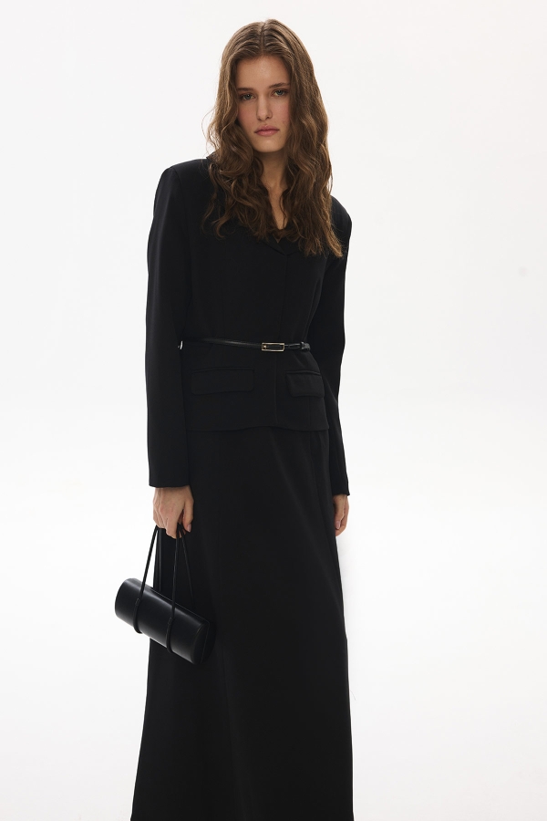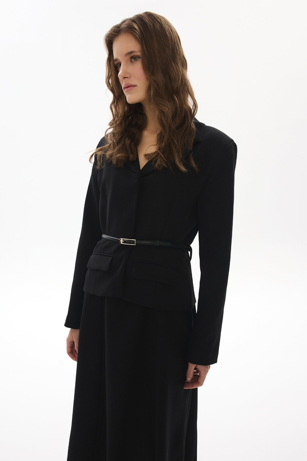 PREMIUM GOLD BELT DETAIL BLACK JACKET DRESS FEATURES Crossover collar, front hidden closure, elastic waist, decorative pockets, self-contrast belt with leather belt, skirt and jacket connected, and jacket with hidden closure lining under the jacket. Fabric Content and Washing Instructions: 100% Polyester Dry clean only. Model Product Size: S Model Measurements: Height: 1.74 m, Bust: 78 cm, Waist: 58 cm, Hips: 87 cm