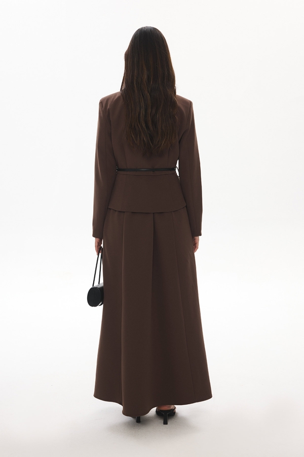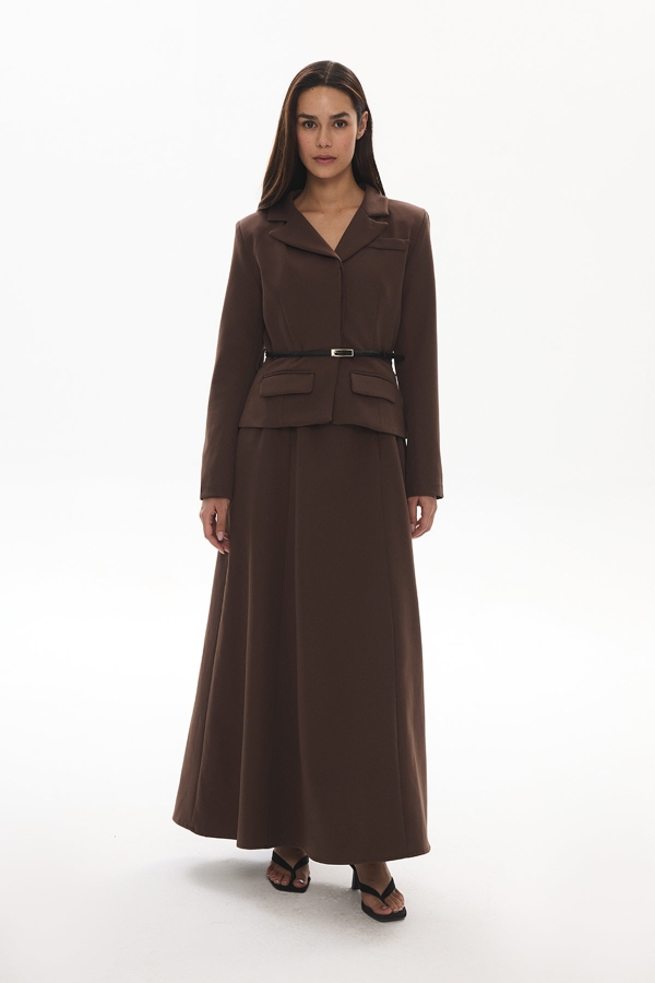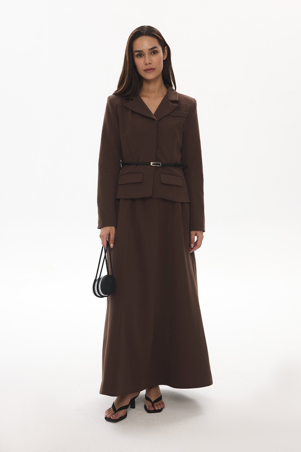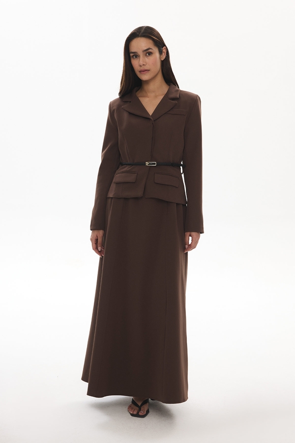 PREMIUM GOLD BELT DETAIL COFFEE JACKET DRESS FEATURES: Cross-over collar, hidden front closure, elastic waist, decorative pockets, features self-contrast leather belt, skirt and jacket are connected with hidden closure under the jacket. Fully lined jacket dress. Fabric Content and Washing Instructions: 100% Polyester Dry clean only. Model Product Size: S Model Measurements: Height: 172 cm, Bust: 81 cm, Waist: 60 cm, Hips: 87 cm