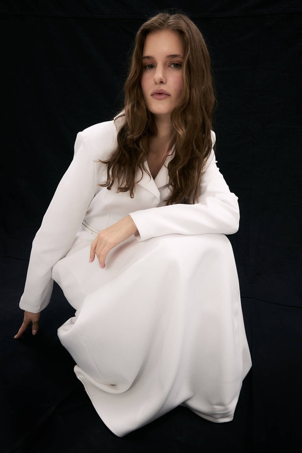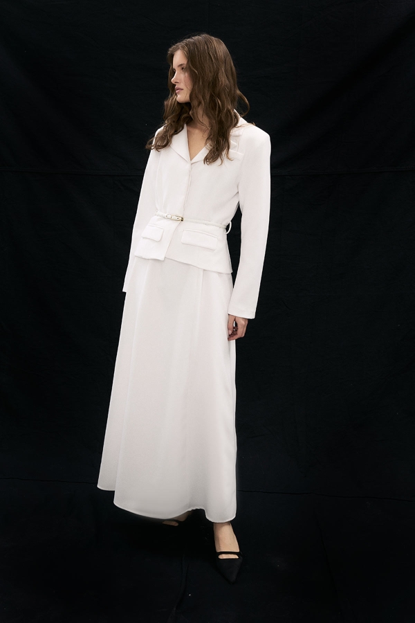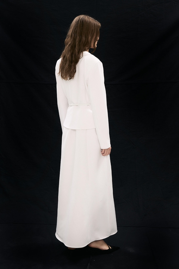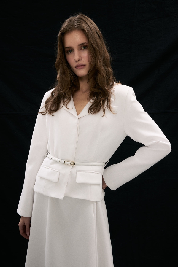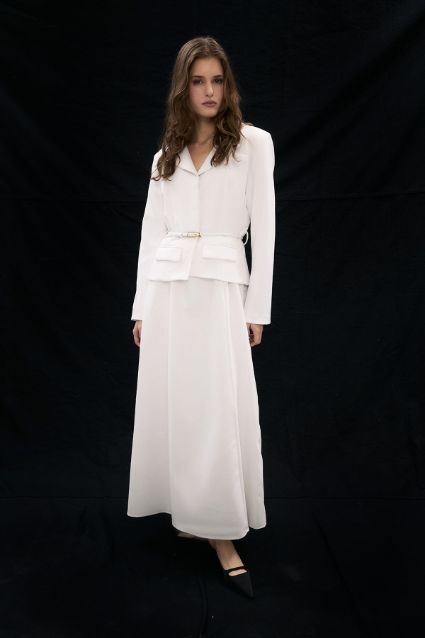 PREMIUM GOLD BELT DETAILED WHITE JACKET DRESS FEATURES