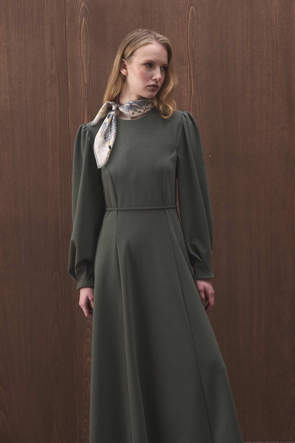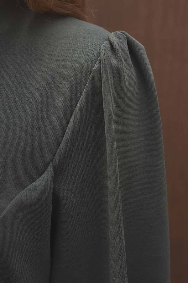 PREMIUM SAGE GREEN DRESS FEATURES: Bicycle collar, shoulder pads, back zipper, shoulder gathers, pleated cuff details, self-fabric tie belt, full cut, unlined premium dress with waist-gathering detail. FABRIC CONTENT AND CARE: 77% Polyester, 20% Polyamide, 3% Elastane. Machine wash at 30°C on delicate, synthetic, and gentle cycles. Hand measurements may vary by 2-3 cm. Model Size: Small. Model Measurements: Height: 174 cm, Bust: 78 cm, Waist: 58 cm, Hips: 87 cm.
