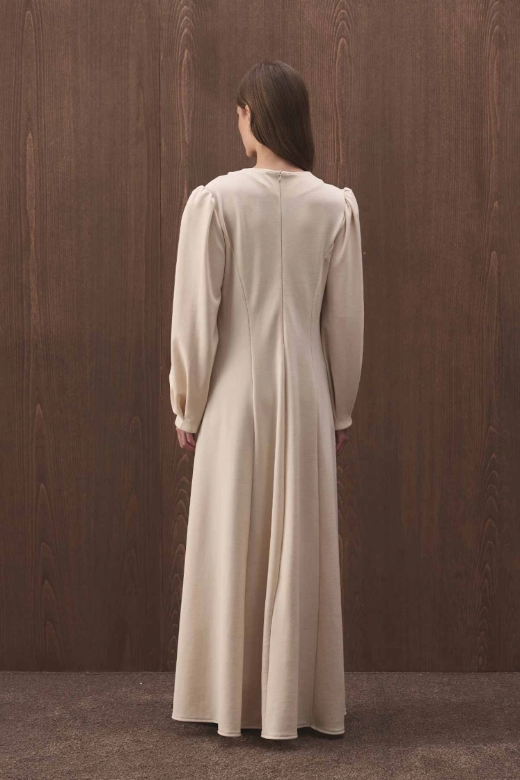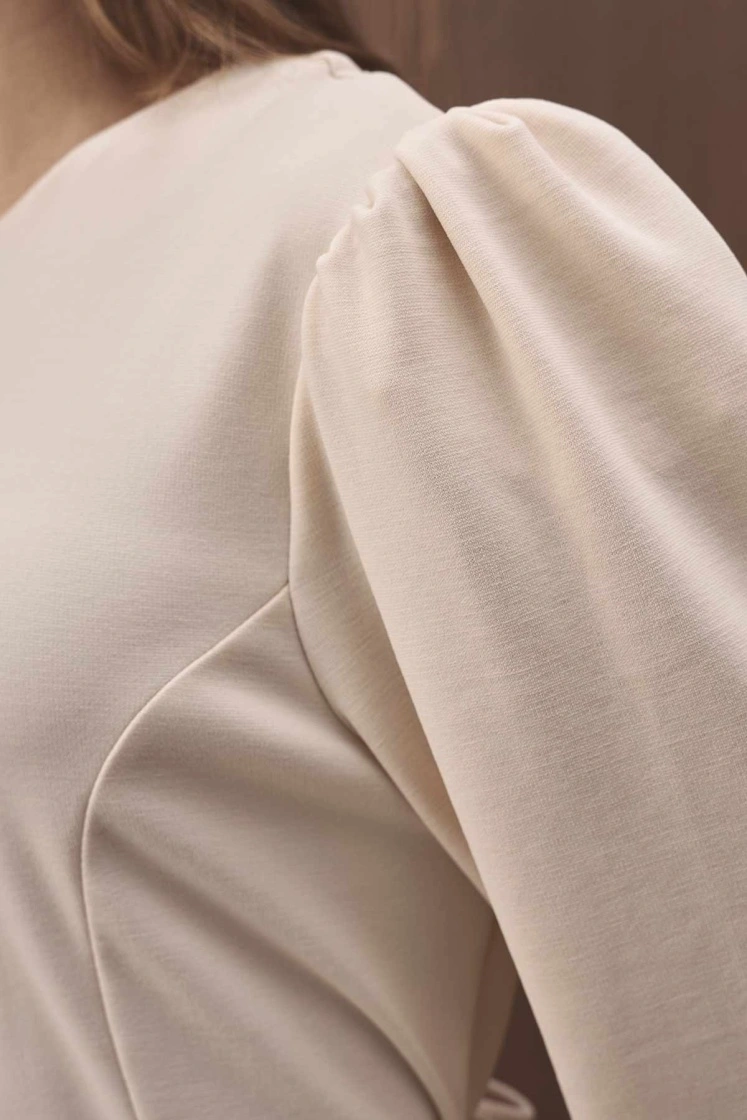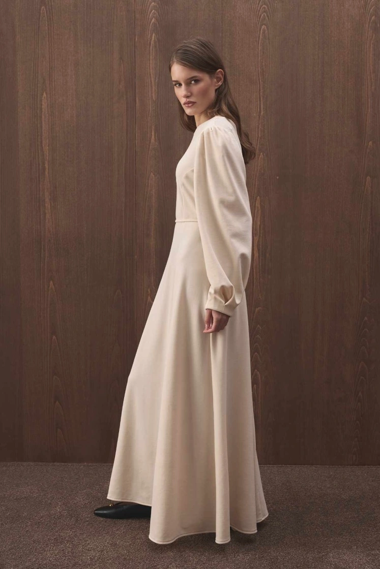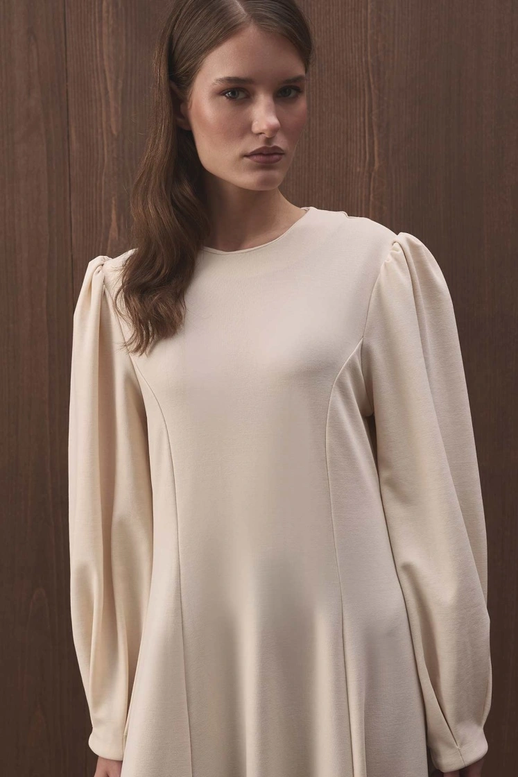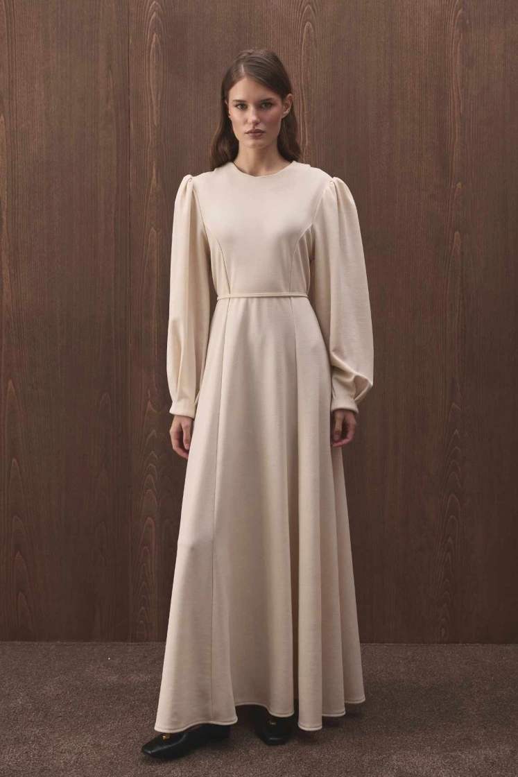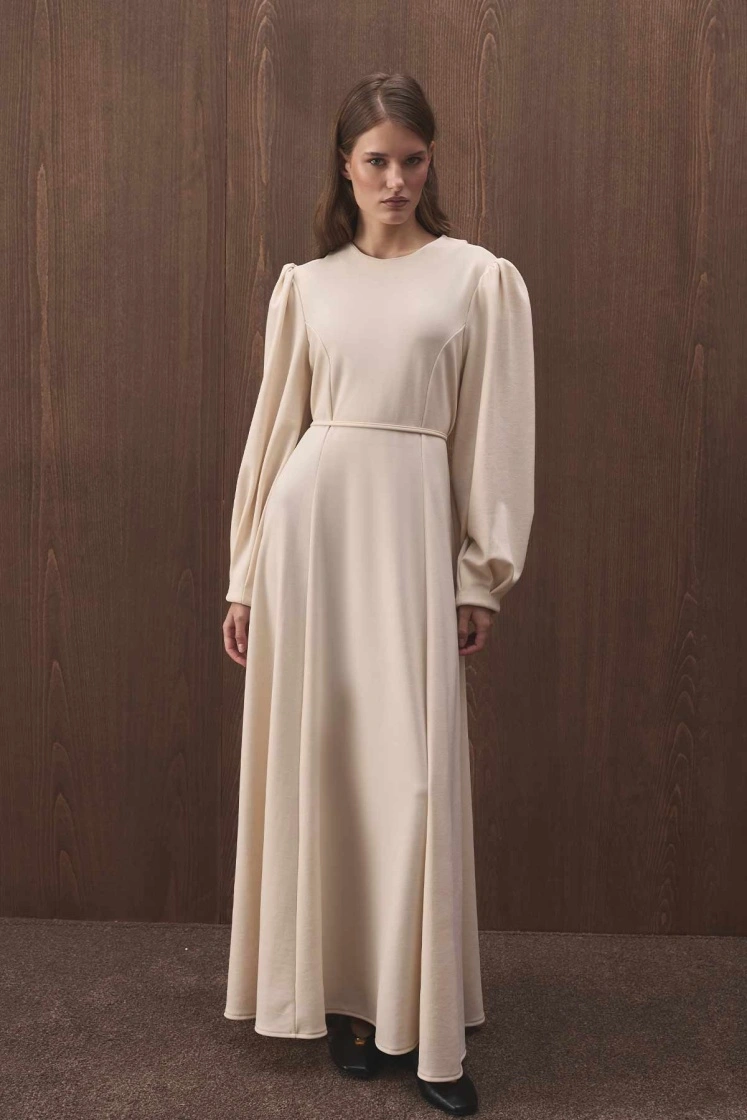 PREMIUM VANILLA DRESS WITH WAIST SEAM DETAIL FEATURES: Bateau neckline, padded, back zipper, shoulder gathers, and cuff pleat detail, self-fabric belt, regular fit, unlined premium dress with waist seam detail. CONTENT AND CARE: 77% PE, 20% Polyamide, 3% Elastane. Should be washed at 30°C on delicate, synthetic, and gentle cycles. Hand measurements may vary by 2-3 cm. Model Size: Small Model Measurements: Height: 1.74 cm, Bust: 78 cm, Waist: 58 cm, Hips: 87 cm