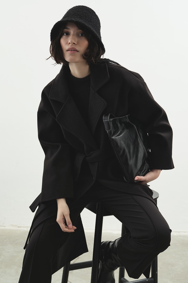 Kruvaze yaka, düğme kapamalı, büyük cep detaylı, kendi kumaşından kuşaklı, rahat kalıp, astarlı punto dikişli kaban.