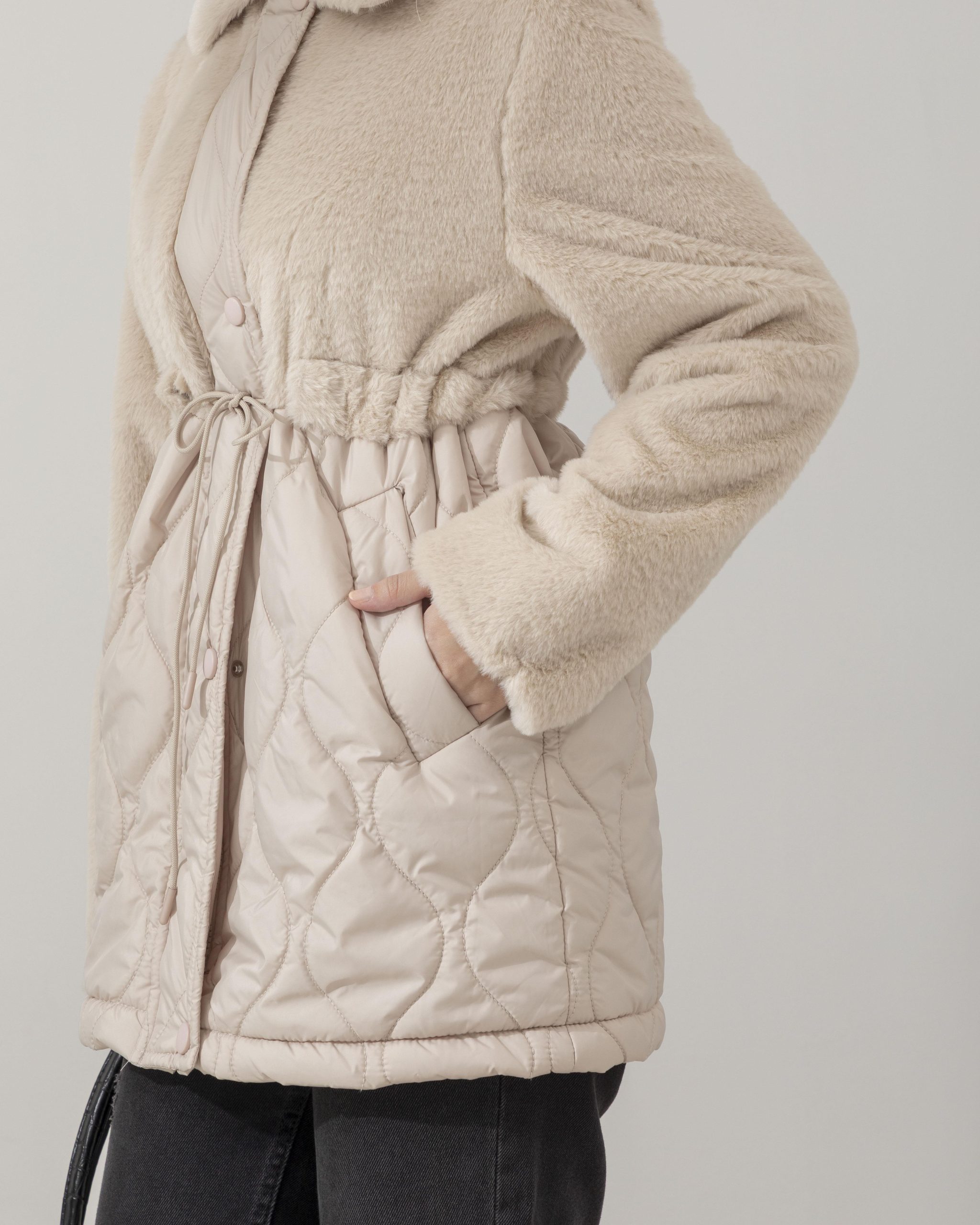 Tags: fur trim, outerwear, quilted jacket, stone color, winter coat
