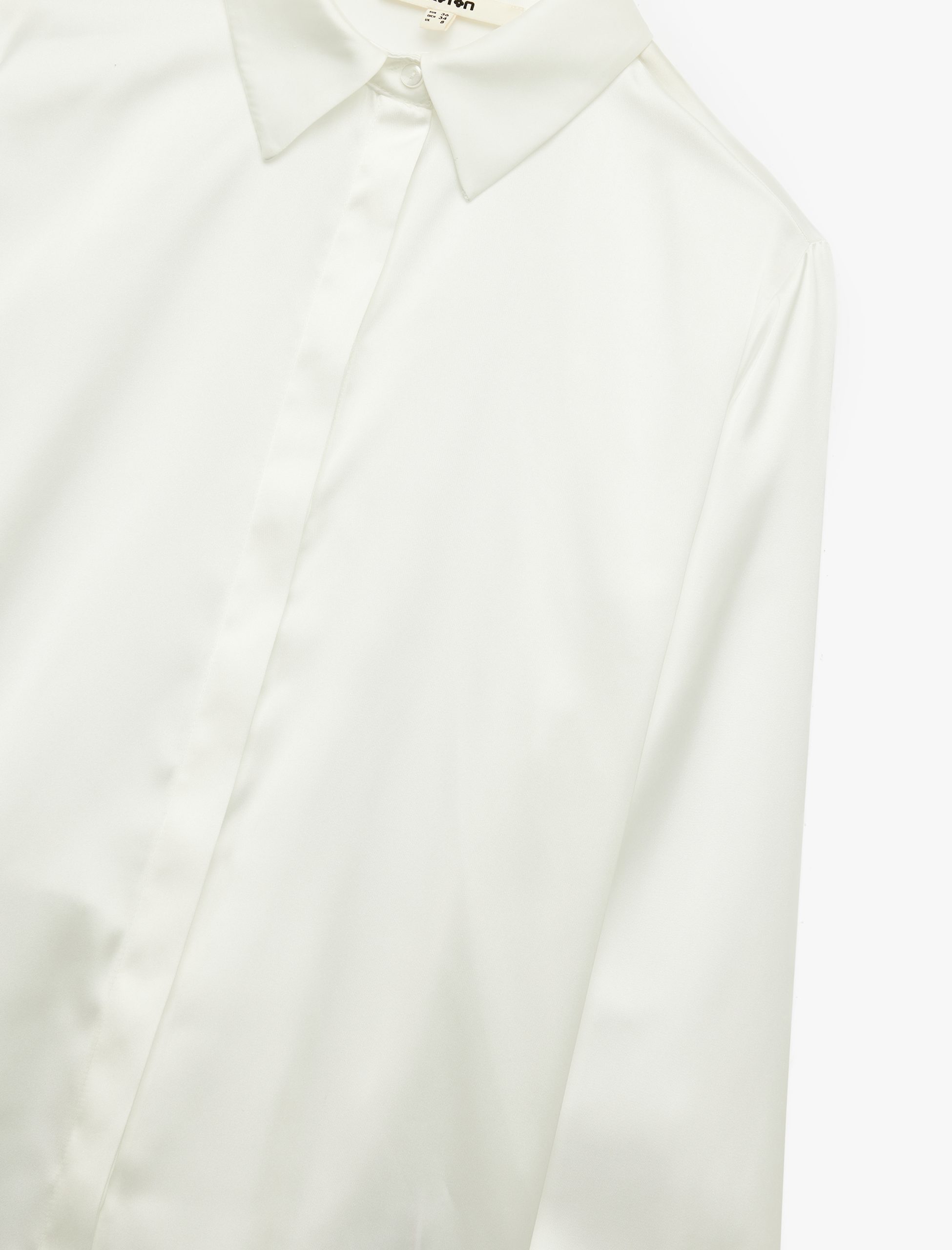 This long sleeve satin shirt is set to become an indispensable piece in your wardrobe, distinguished by its classic design. Featuring a classic collar detail and buttoned front, it offers practical wear while creating an elegant silhouette. With its standard length, this shirt can be easily chosen for both office and daily outfits, providing a comfortable and stylish appearance.