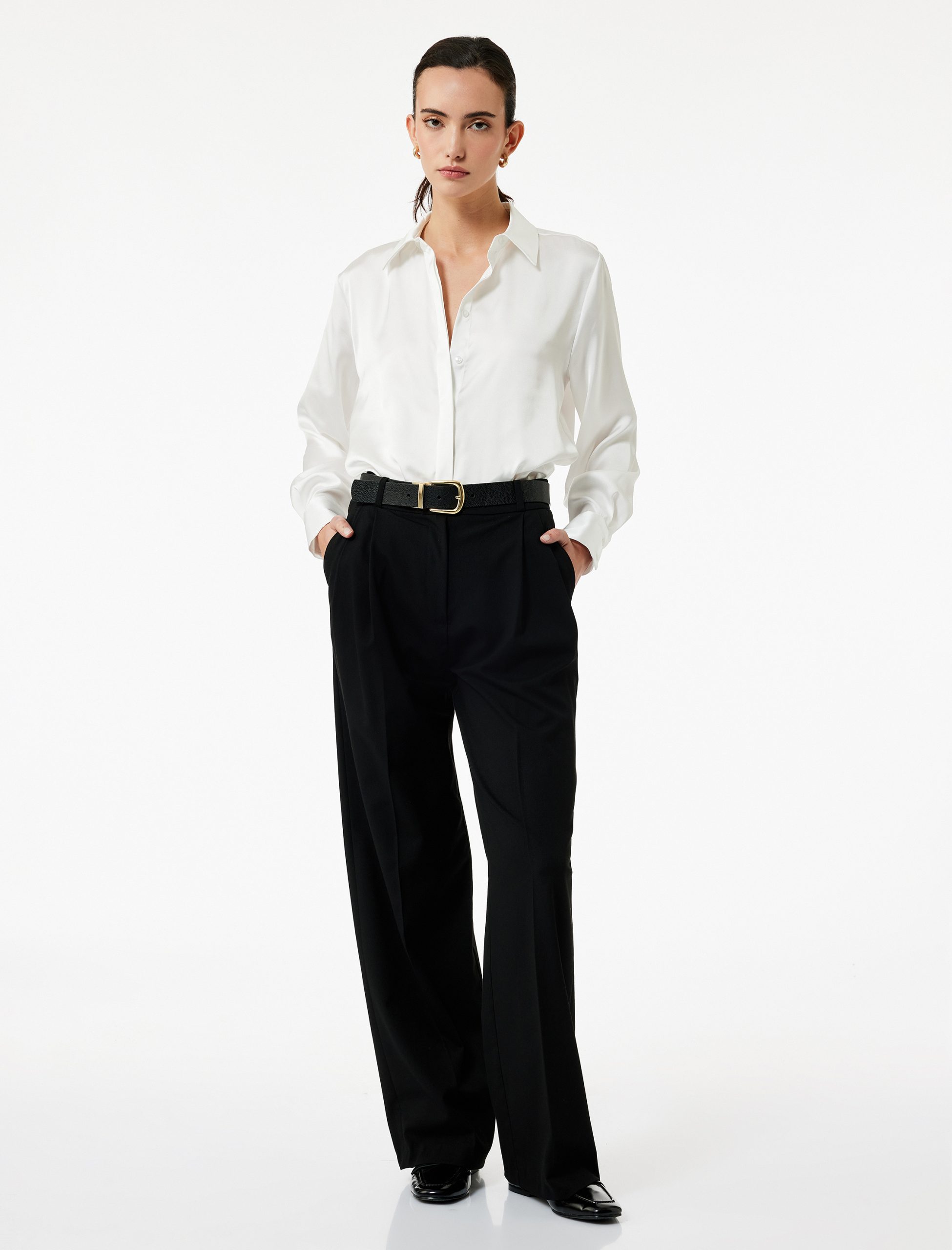 For a perfect office look, pair the satin shirt with tailored trousers and high heels. For a more casual style, combine it with jeans and loafers to blend sophistication with comfort effortlessly. Complete your style with minimal jewelry and a chic bag to create a look suitable for both day and night.