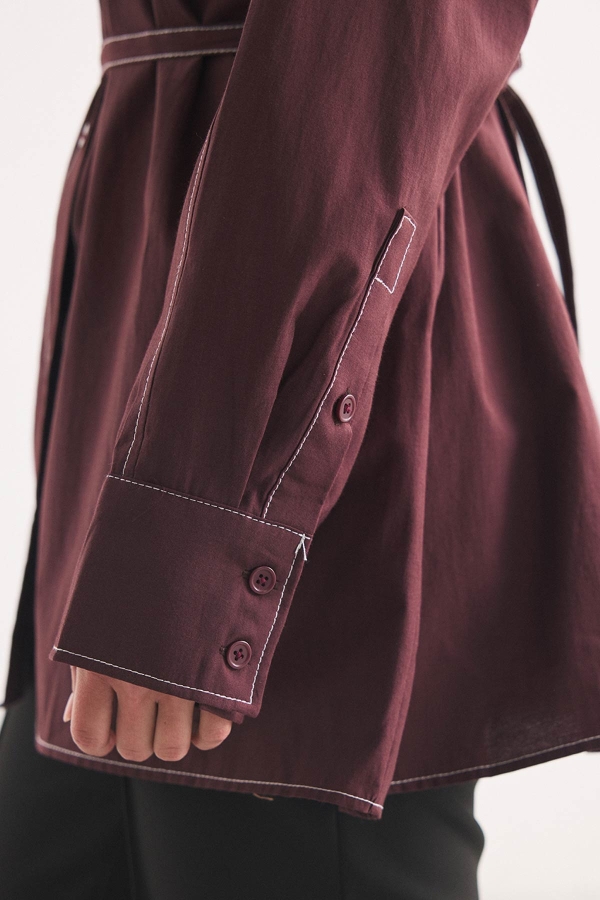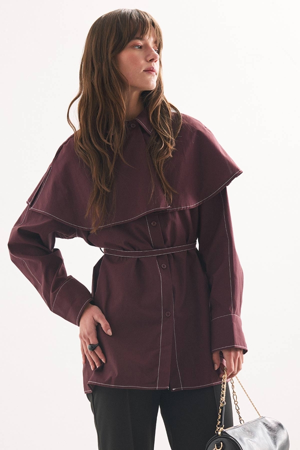 FEATURES OF THE REMOVABLE CAPE COLLAR BURGUNDY SHIRT: Shirt collar, button-front, detachable cape, seam detailing, self-fabric tie belt, side belt loop, regular fit removable cape collar shirt. COMPOSITION AND CARE: 100% Cotton. Machine wash at maximum 30°C on delicate or synthetic cycles. Hand measurements may vary by 2-3 cm. Model Size: S-M. Model Measurements: Height: 174 cm, Bust: 82 cm, Waist: 61 cm, Hips: 92 cm.