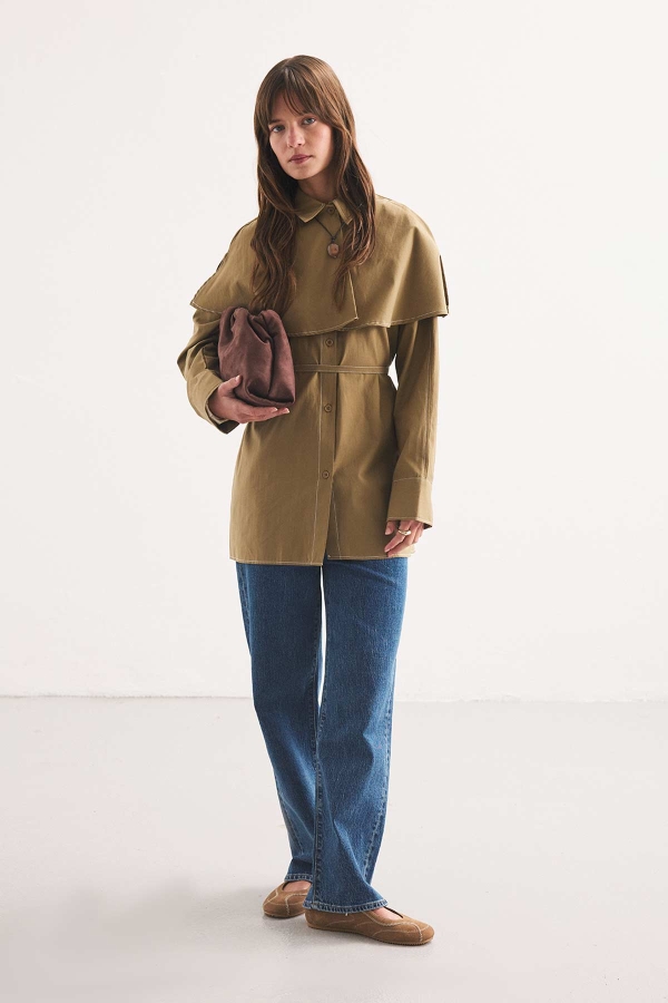 Shirt collar, buttoned, removable cape, seam detailing, self-fabric belt with side belt bridge, regular fit removable cape collar shirt.