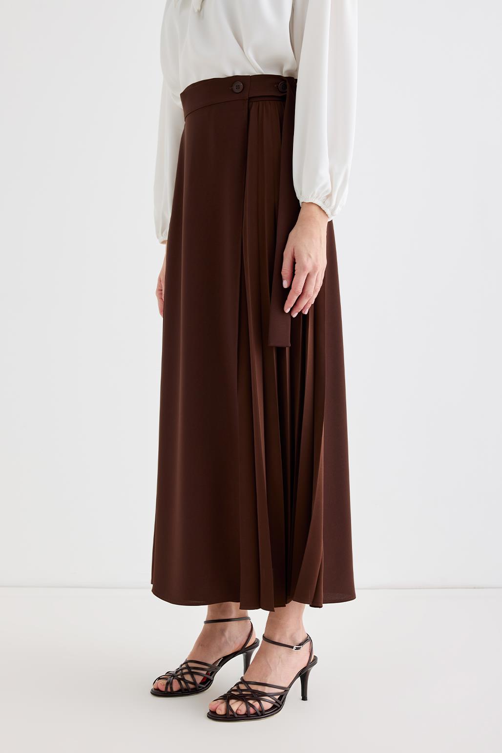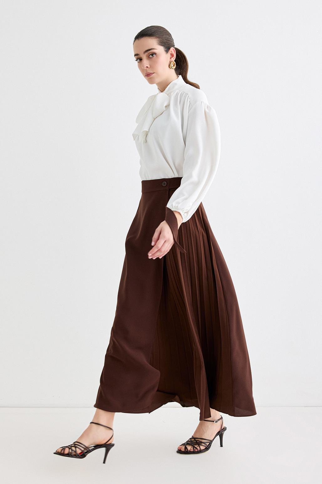 ÜRÜN TANIMI Rita piliseli anvelop etek kahve, cupra karışımlı yumuşak dokulu kumaşıyla konforlu bir şıklık sunar. Yüksek belli tasarımı, vücut hatlarını dengeli bir şekilde vurgularken uzun kesimiyle bacak boyunuzu daha uzun gösterir. Pilise detayları eteğe hareket katarken, minimal tasarımı sayesinde farklı kombinlere kolayca uyum sağlar. Basic bir gömlek ve düz ayakkabılarla günlük kullanım için sade bir stil oluşturabilir, şık bir bluz ve topuklu ayakkabılarla özel günlerde zarif bir görünüme kavuşabilirsiniz. Zamansız tasarımıyla dolabınızın bir numaralı parçası olacak. ÜRÜN ÖZELLİKLERİ Cupra karışımlı krep kumaş, Yüksek bel, uyumlu renk plise garnili, Ön beden kapaklı, düğme kapama, Düz kesim etek. İÇERİK VE BAKIM %100 PES Çamaşır makinasında düşük ısıda yıkanabilir.Sererek kurutunuz. Düşük ısıda tersten ütülenebilir elle ölçümlerde 2-3 cm değişiklik gösterebilir. Manken Ölçüleri: Boy 177cm, Göğüs 69cm, Basen 89cm. Manken üzerindeki ürün 36 bedendir.