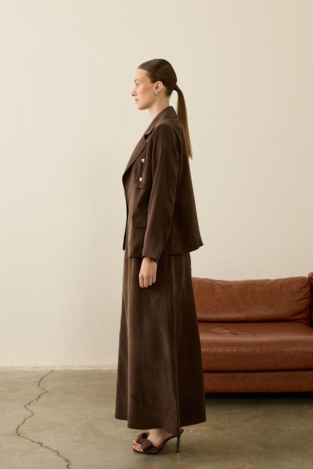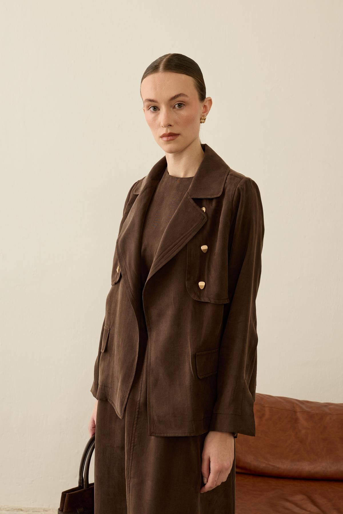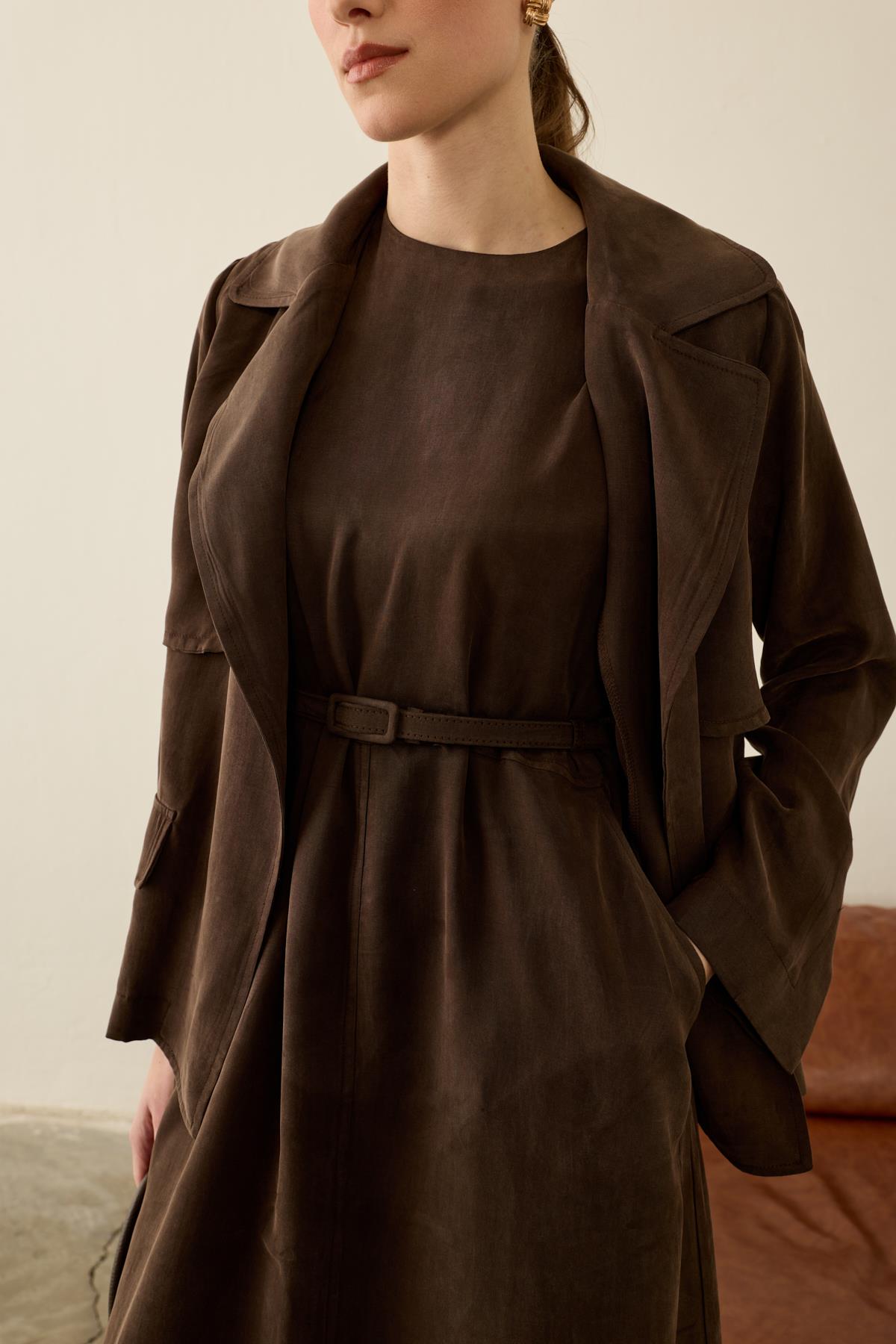 Tags: belted slip dress, brown dress set, button-down dress, lyocell dress set, Riva collection