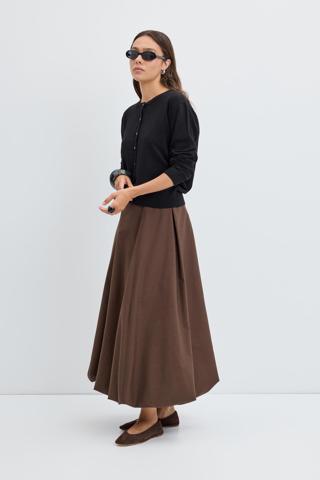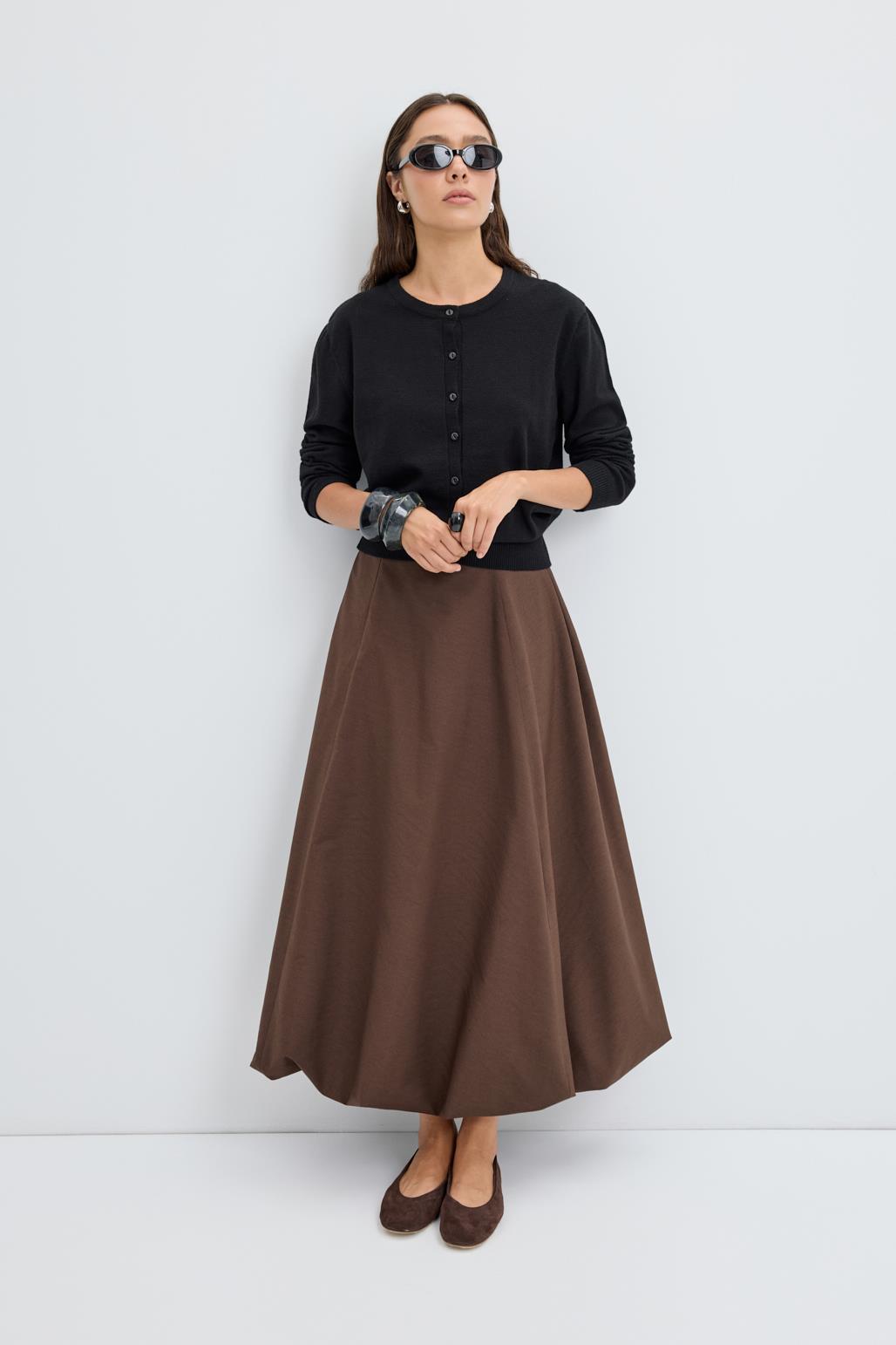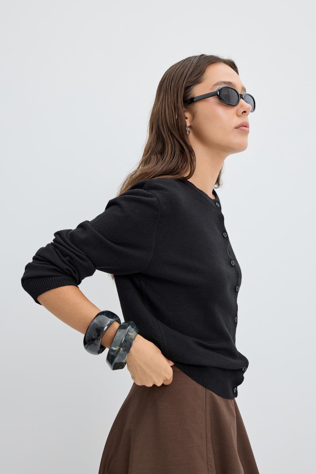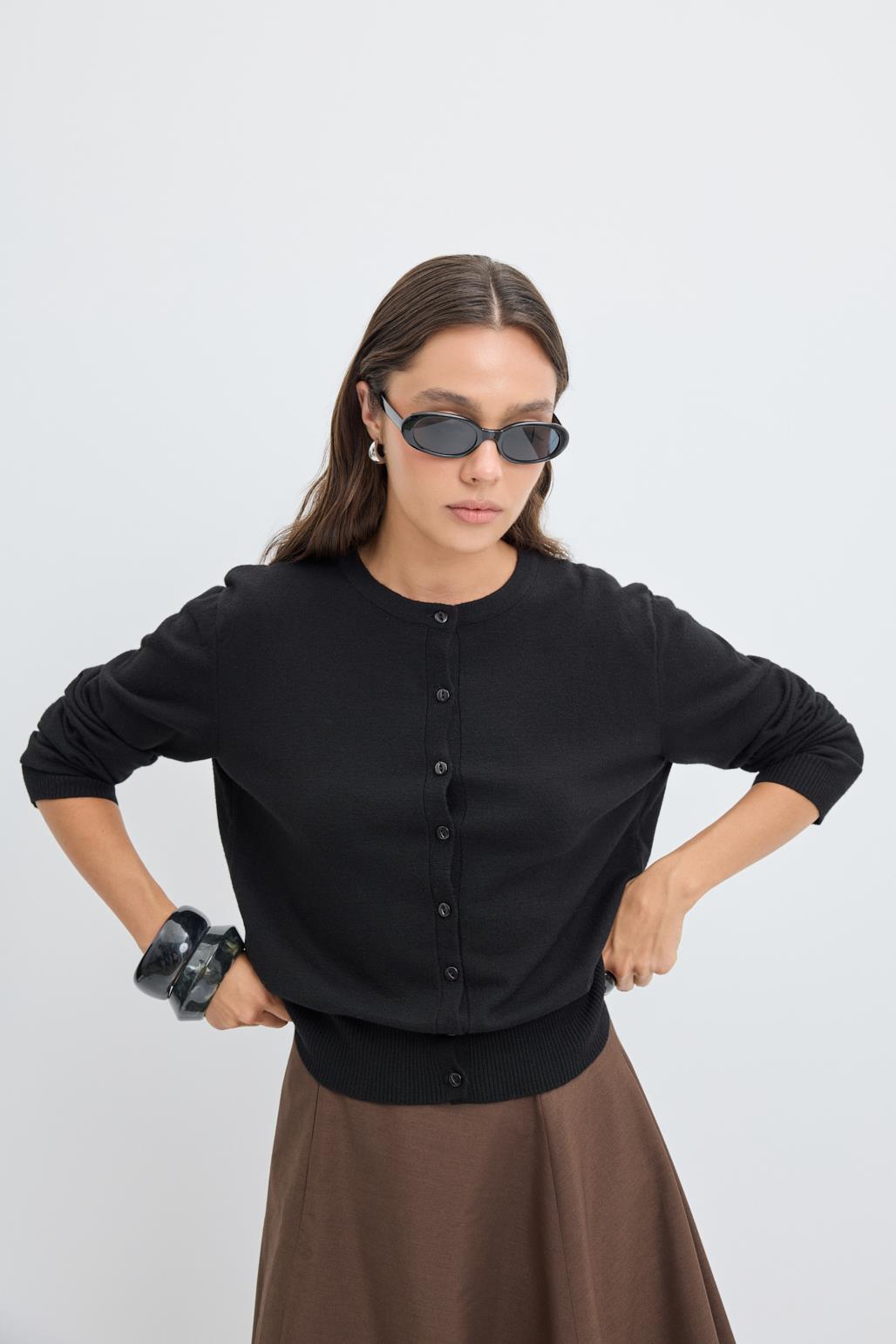 This Round Neck Buttoned Knit Cardigan in Black, with its simple design and elegant details, serves as a stylish complement to your daily wardrobe. The soft knit fabric offers all-day comfort, while the round neckline creates a classic and timeless look. The button closure at the front allows for versatile wear, either open or closed. It is a go-to piece in your wardrobe, perfect for transitional seasons or layered outfits.