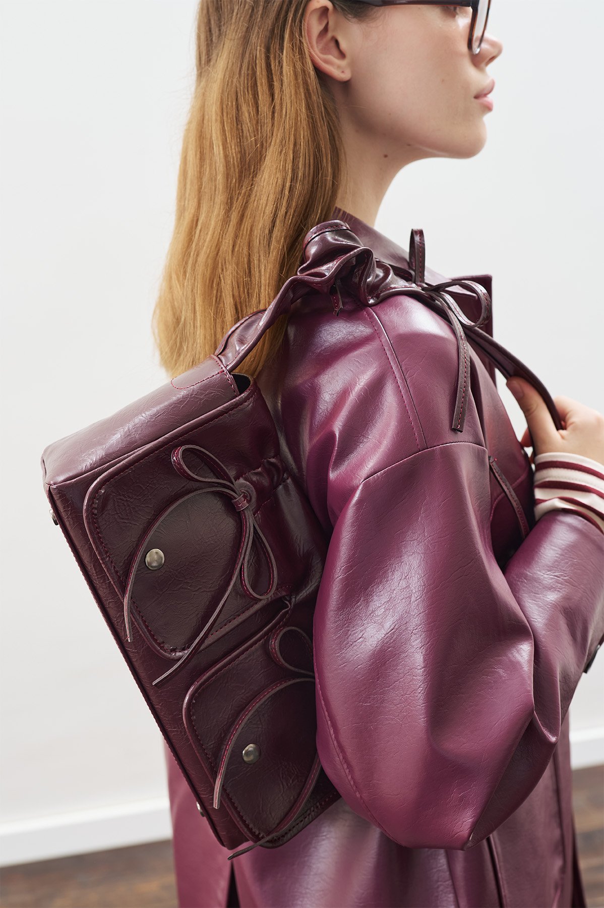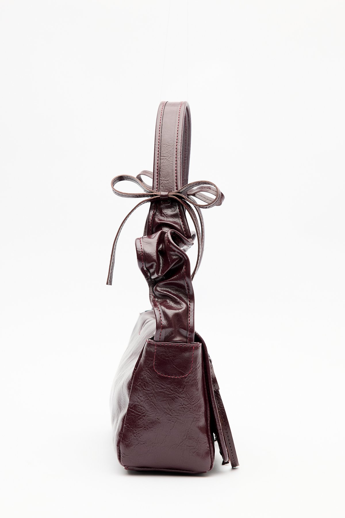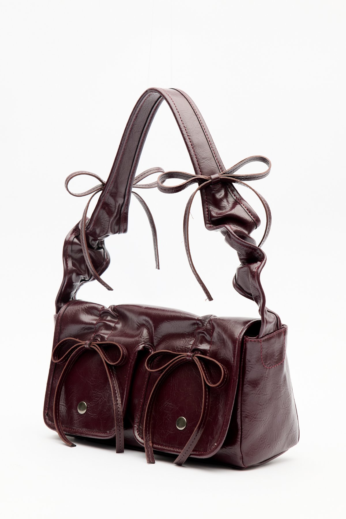 Tags: Bag, burgundy, faux leather, magnetic closure, medium size, ribbon detail