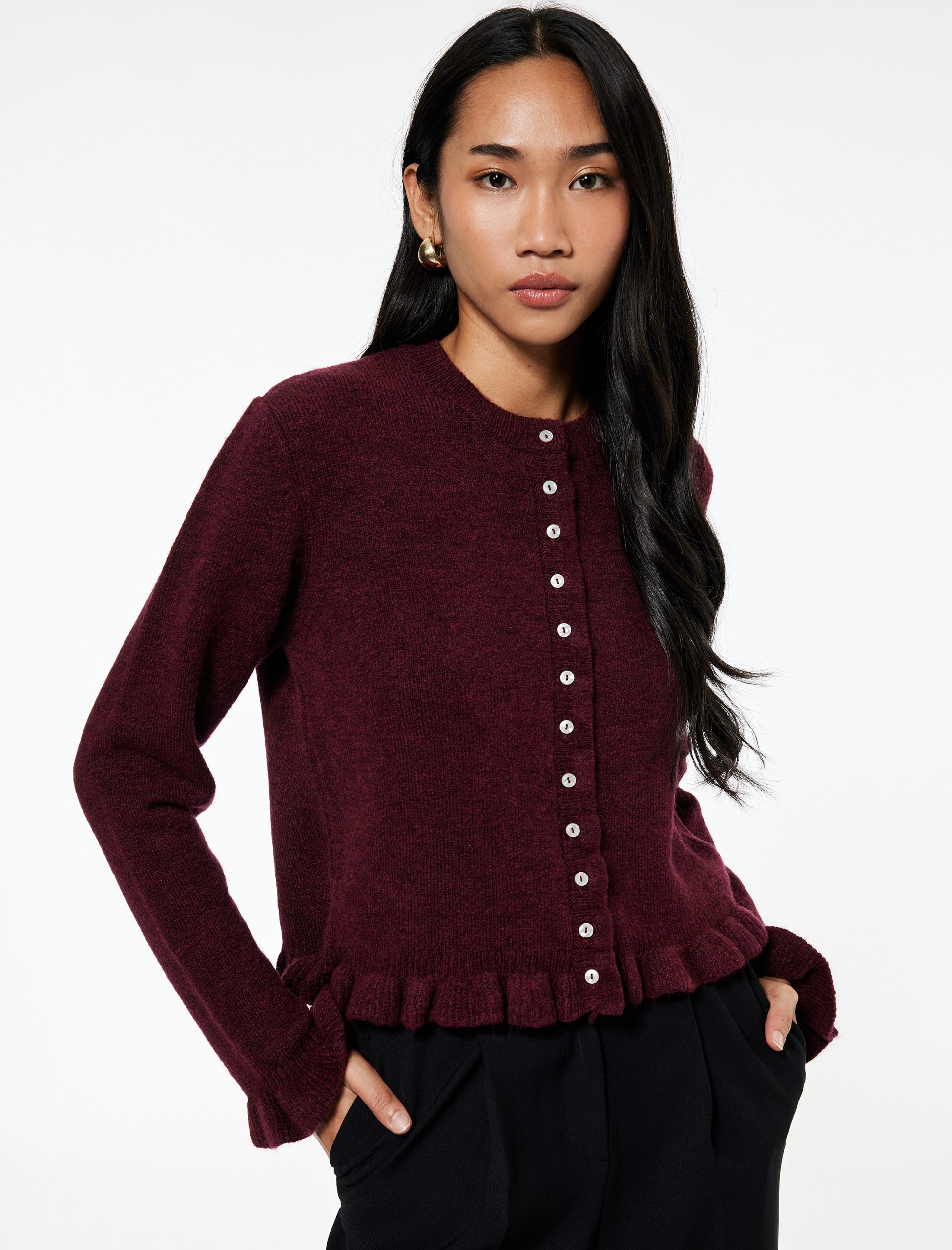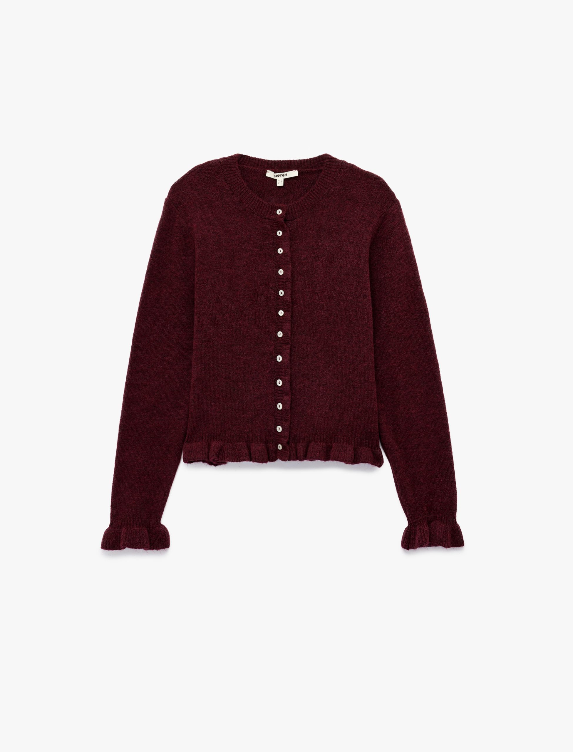 This long sleeve cardigan with ruffle details stands out with its elegant design. Featuring a turtleneck cut and knit structure, it easily adapts to both casual and office styles. Its fine knit construction makes it perfect for transitional seasons. The buttoned design and ruffle details add a chic touch to the cardigan, making it ideal for completing your outfits.