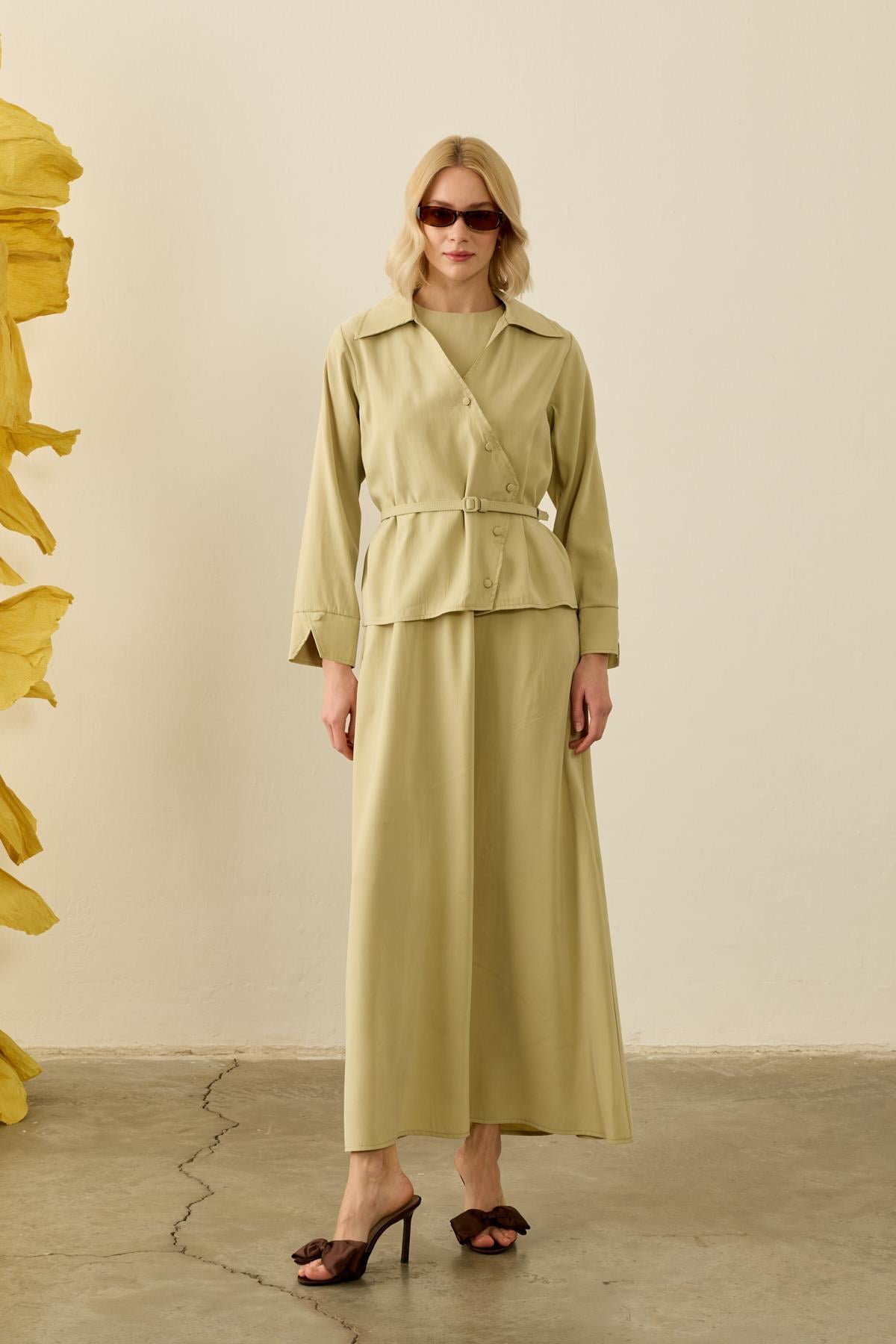 Tags: button-up, chic set, lounge wear, modal fabric, sage green, slip dress, wrap dress