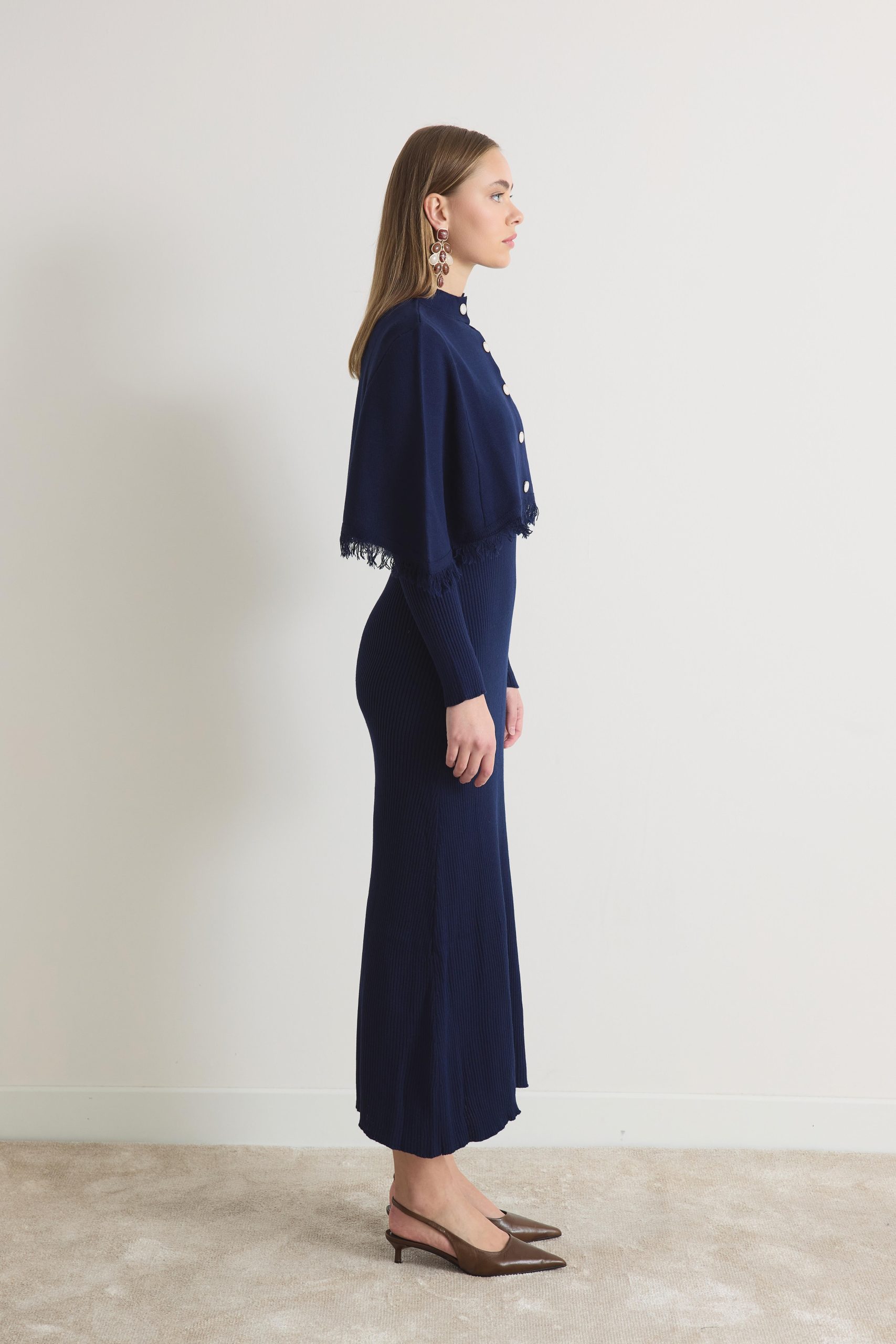 This elegant fringed knit dress combines comfort with contemporary style. Perfect for both casual outings and special occasions, it features a soft knit fabric that drapes beautifully. The navy blue color adds a touch of sophistication, while the unique fringed detailing creates a fashionable statement piece.