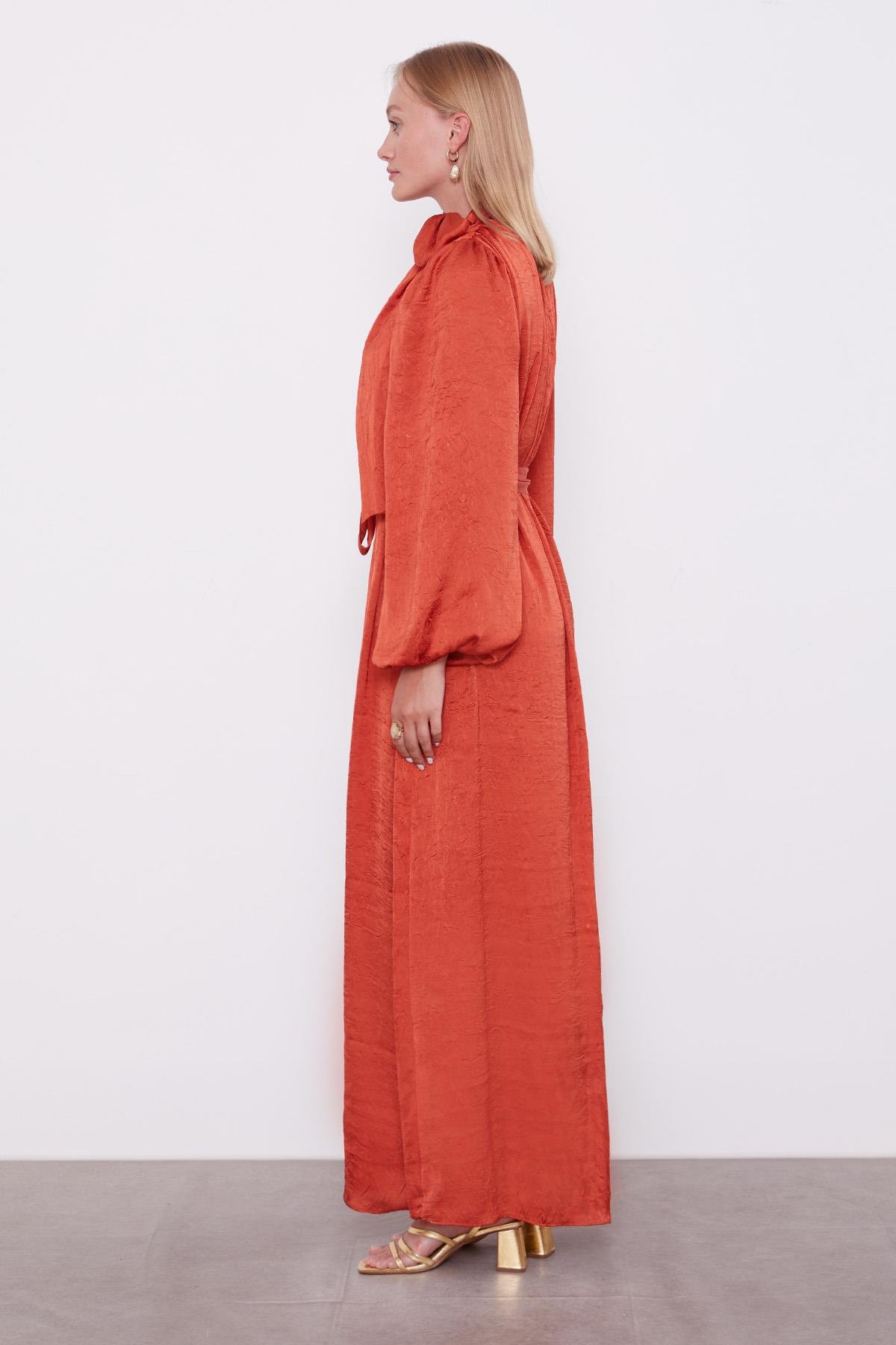 CARE INSTRUCTIONS: Wash the garment inside out on a delicate cycle using liquid detergent. Spin at low speed, air dry flat, and iron at low temperature. EDITOR’S COMMENT: This satin crepe dress with belt detail is a favorite among fashion enthusiasts, offering a special design that combines elegance and comfort. The lightly shiny and textured crepe satin fabric provides a noble appearance while drawing attention with its dynamic structure. The bow-tie neck detail adds a graceful sparkle to the dress, while the soft texture of the satin crepe fabric ensures all-day comfort. With versatile use from office elegance to evening invitations, this model is ready to be the savior piece in your wardrobe. Complete the look with elegant heels, a simple clutch bag, and natural-toned makeup for a stunning appearance. For a sophisticated look, pair with seasonal accessories like new-season scarves or light jackets.