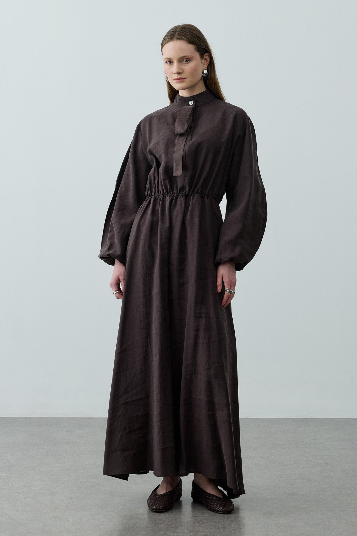 Tags: balloon sleeves, bitter coffee, elegant dress, maxi dress, scarf dress, woven fabric