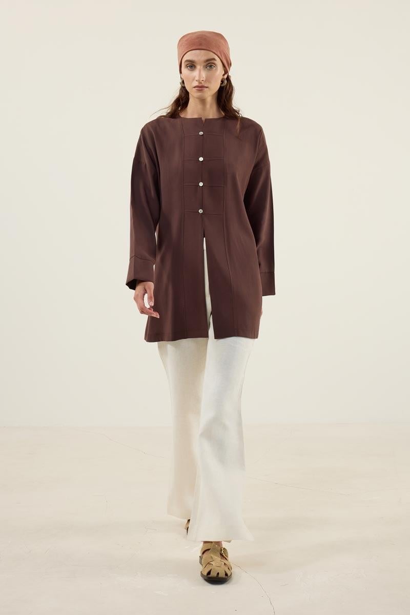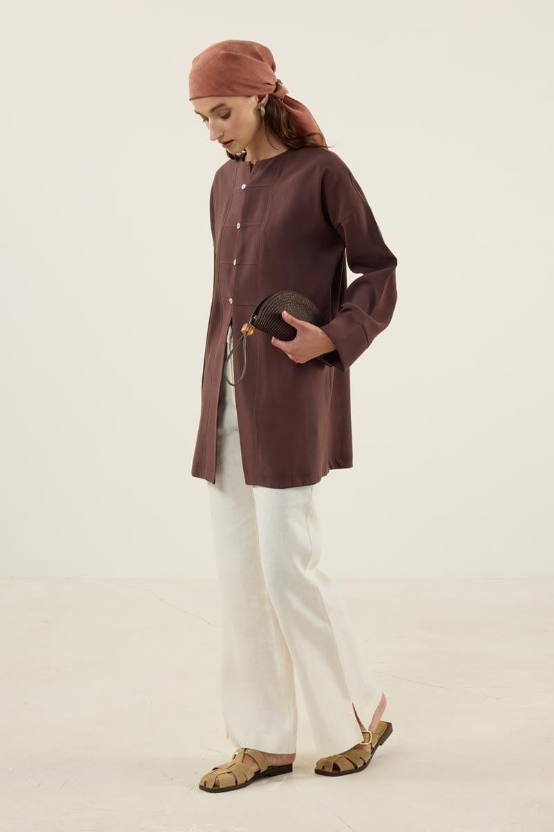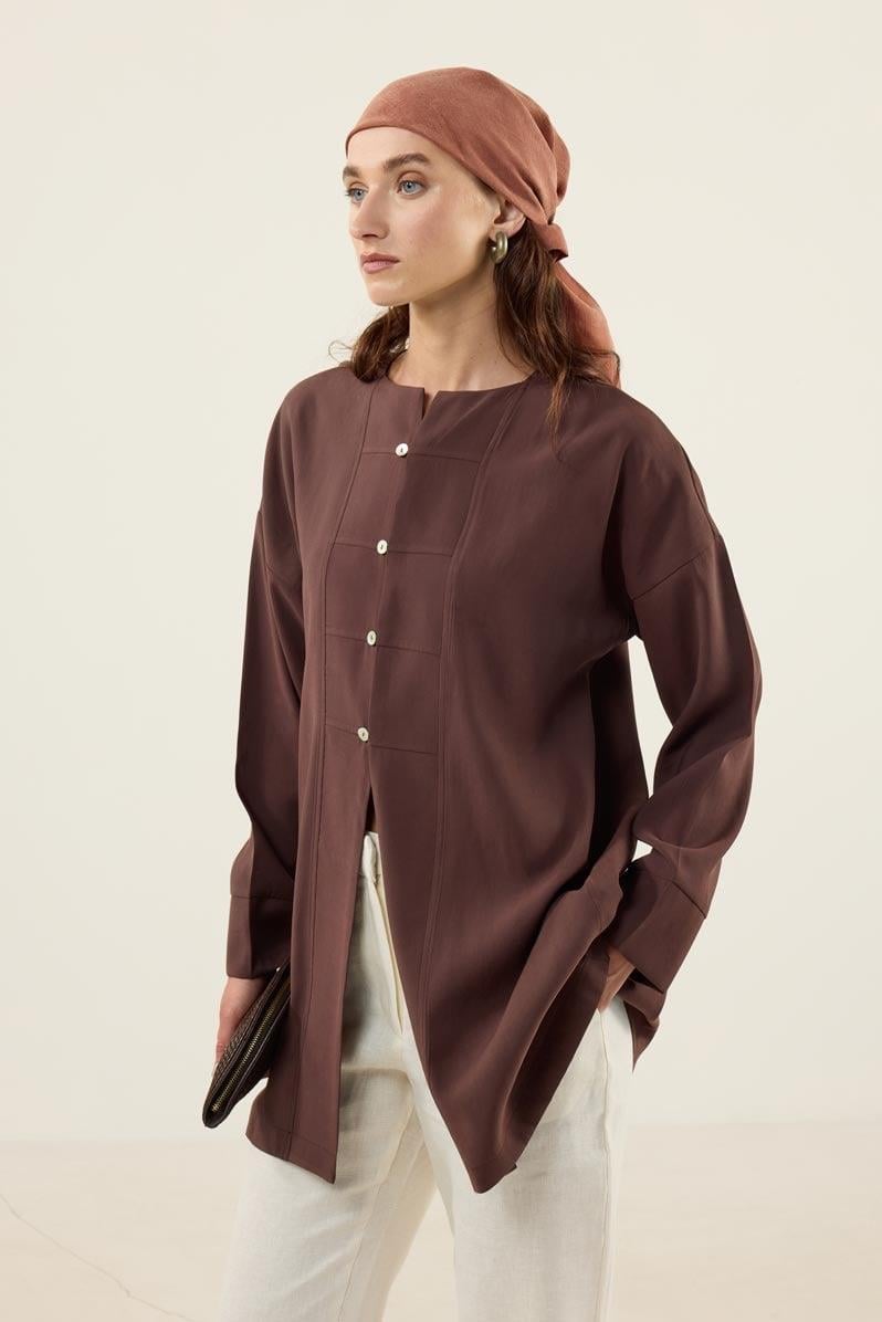 Sedef Düğmeli Modal Tunik Kahverengi, modern tasarımı ve rahat kalıbıyla yaz sezonunun vazgeçilmez parçalarından biri. %65 viskon, %28 naylon ve %7 liyosel karışımlı kumaşı, yumuşak dokusuyla hafiflik ve nefes alabilirlik sunarken gün boyu konfor sağlar. Bisiklet yaka ve düşük omuz tasarımı, rahat bir siluet oluştururken, brit detayları ve sedef parlaklığındaki düğmeler, tunik formuna zarif bir dokunuş katar.