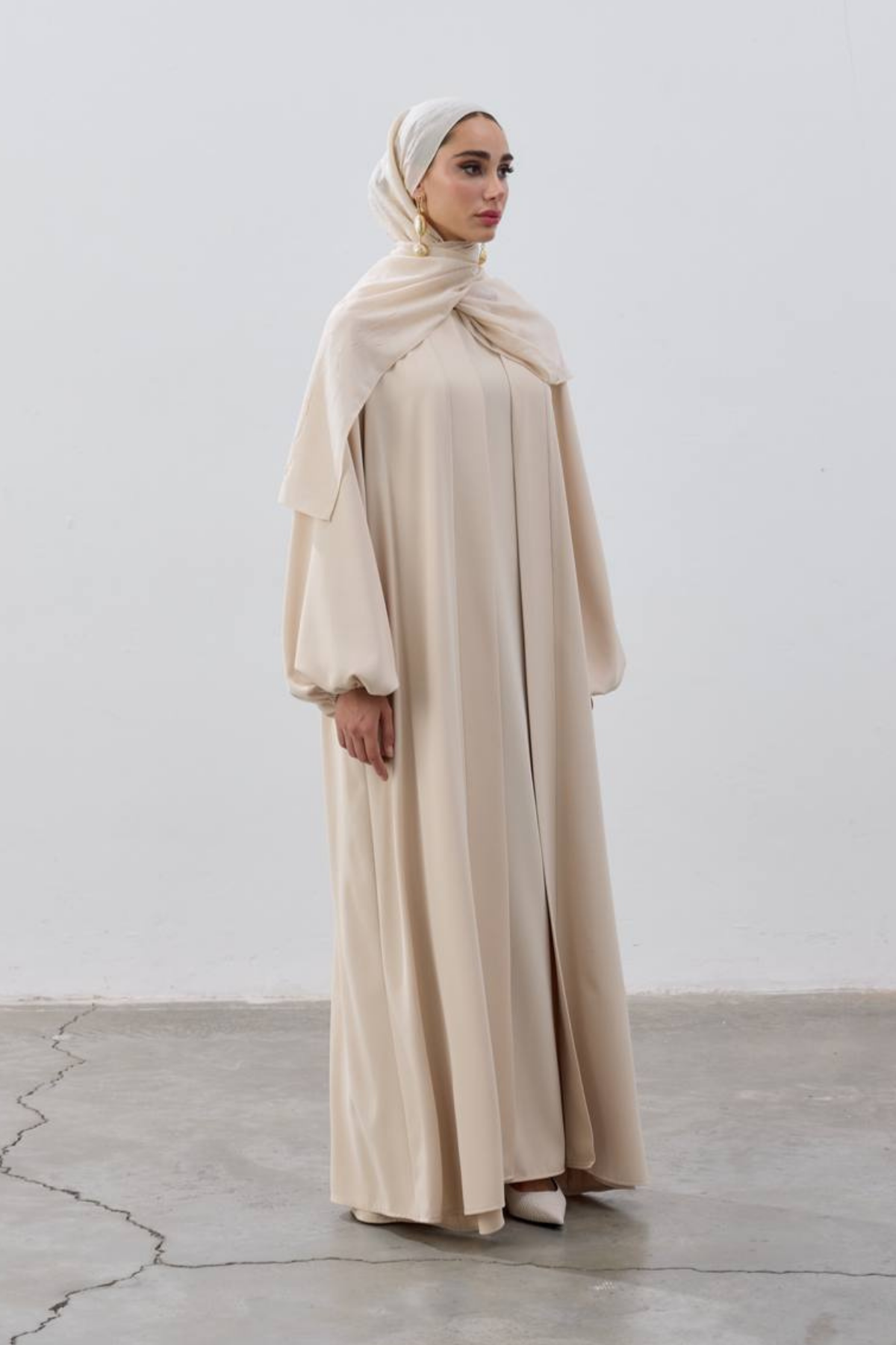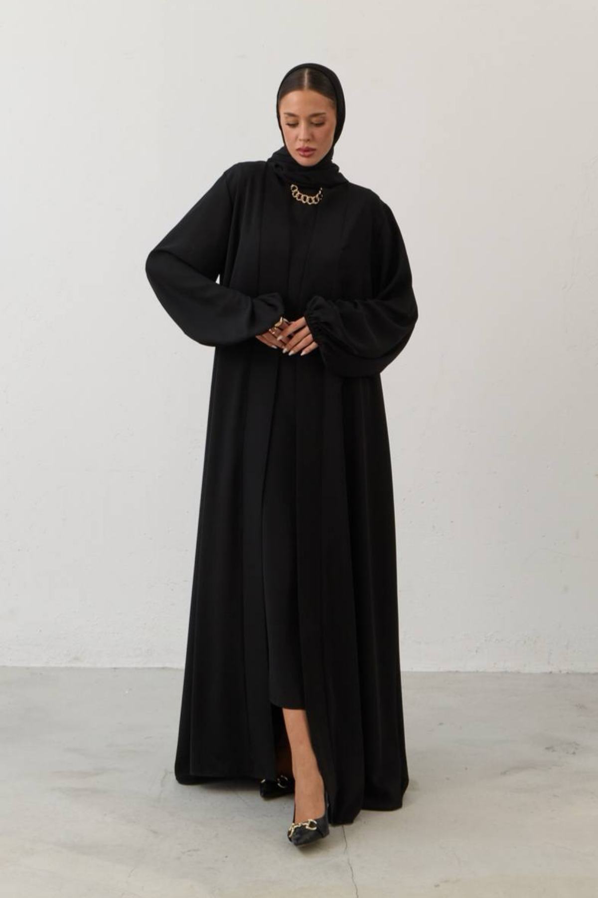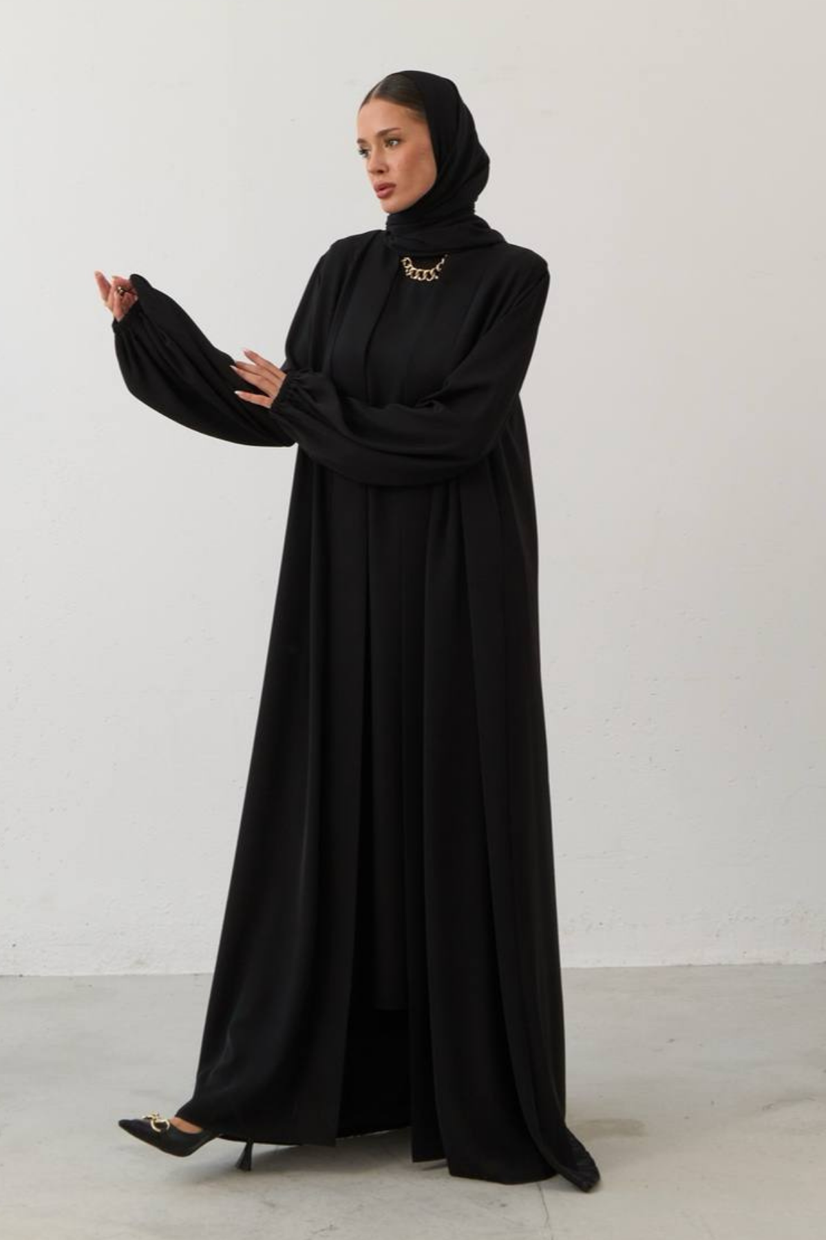 Tags: abaya set, balloon sleeves, elegant style, luxury fashion, modern abaya, modest wear, premium collection, Santiago fabric, two-piece outfit